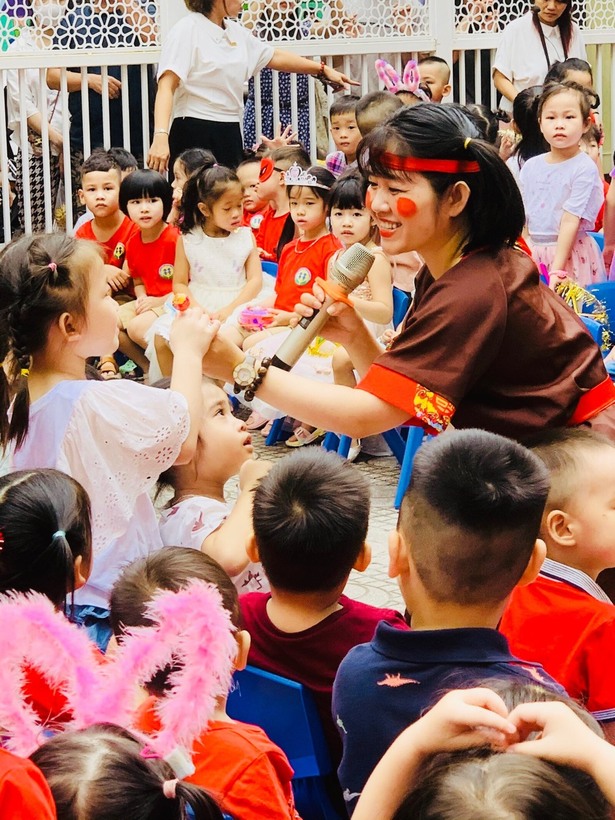 Thay vì quát mắng những bạn nhỏ lớp mầm chưa ngoan, cô Nguyễn Thùy Dung, Trường Mầm non Sao Mai, Quận Ba Đình (Hà Nội) giáo dục trẻ thói quen sinh hoạt, nếp chào hỏi, nét đẹp văn hóa Hà Nội trong bài học để trẻ phát triển toàn diện.