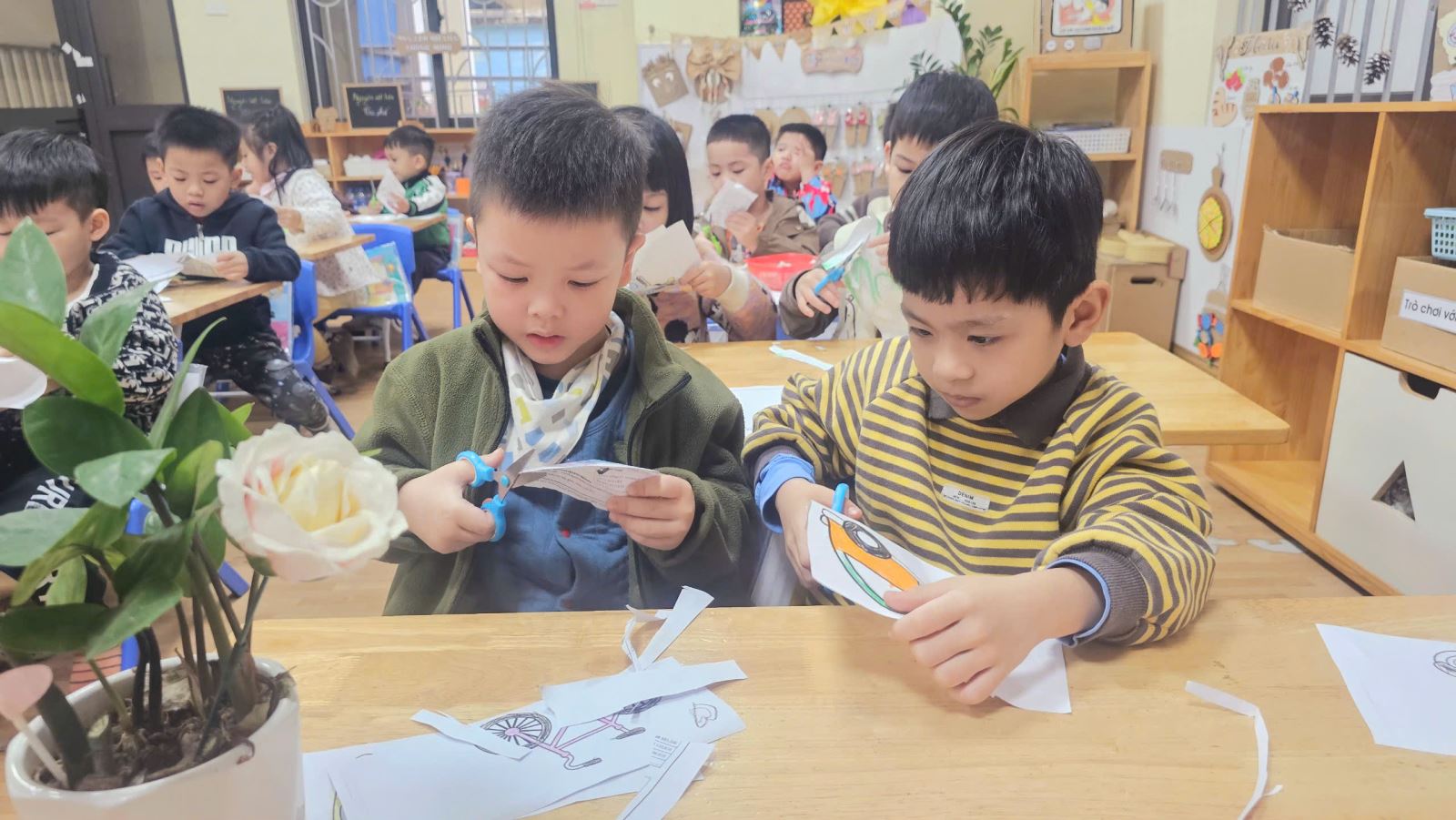 Bằng sự khéo léo của đôi bàn tay trong việc sử dụng kéo để cắt những hình PTGT sau đó dán để tạo thành bức tranh hoàn chình, các bé lớp B1 đã có trải nghiệm vô cùng thú vị bởi cắt và dán là kỹ năng mà bé nào cũng yêu thích.
