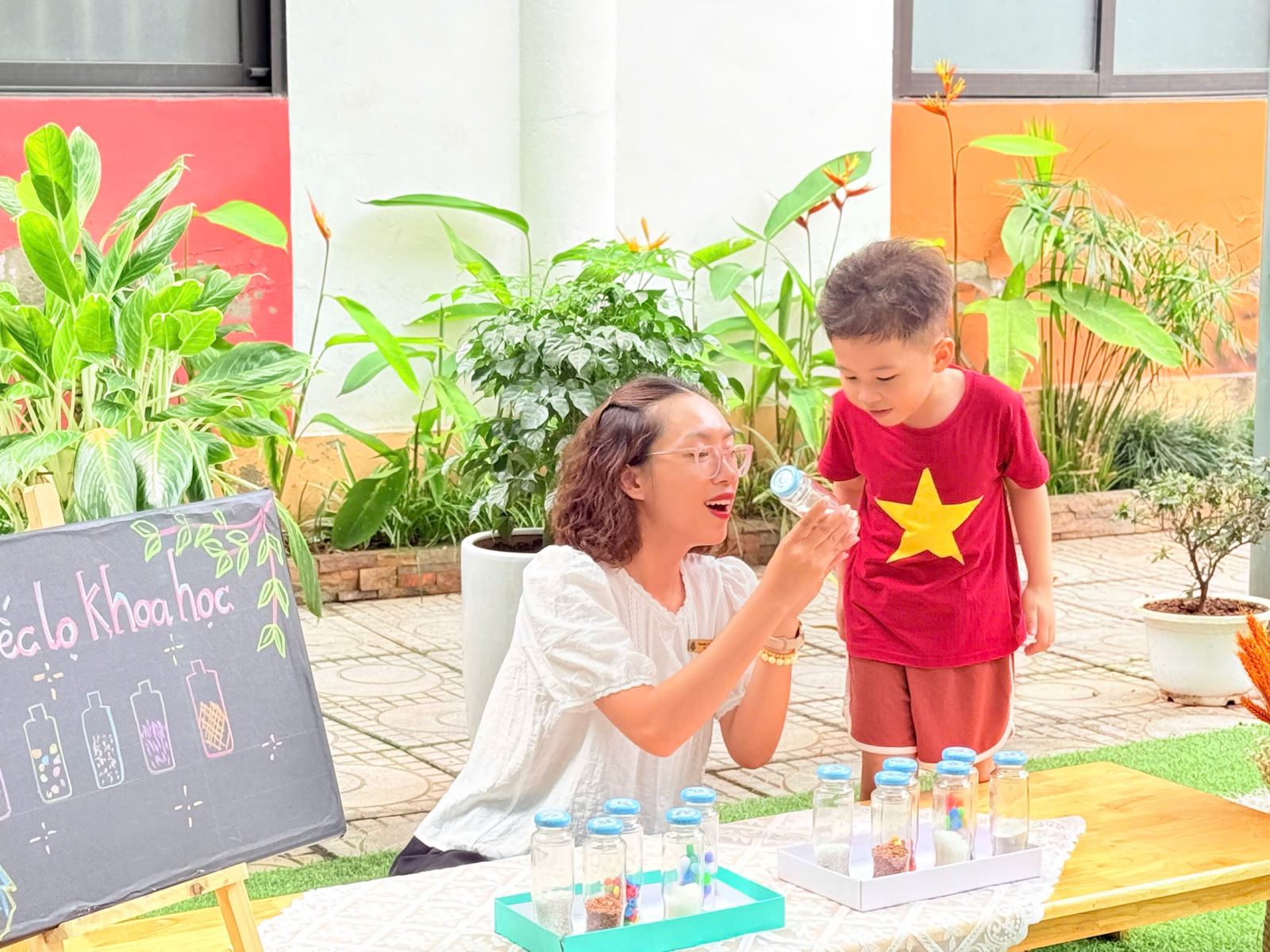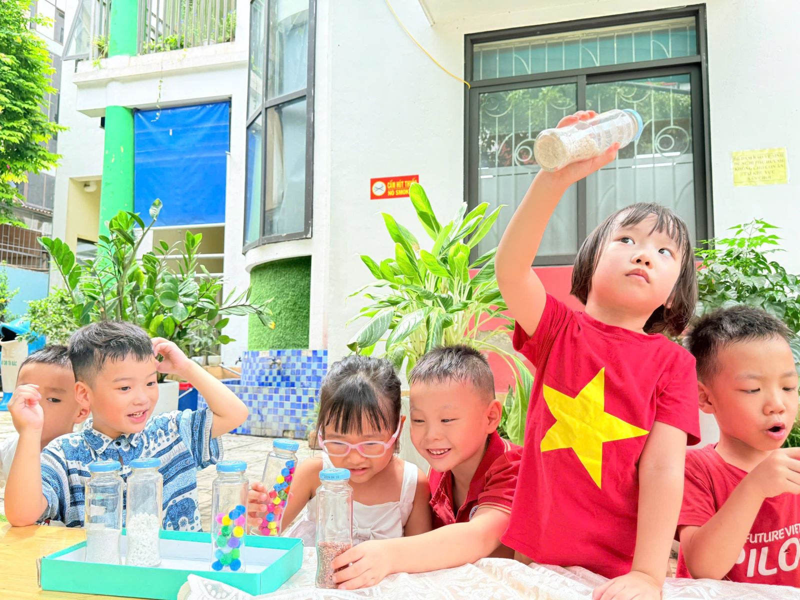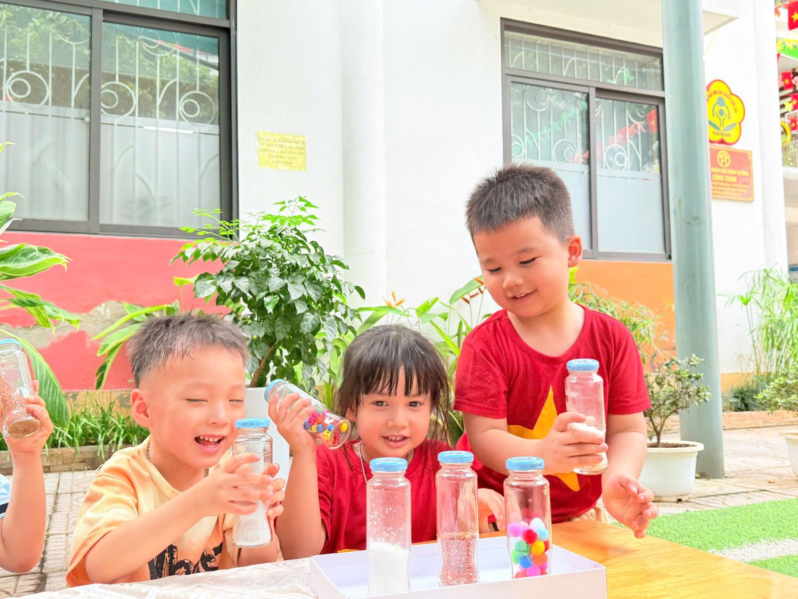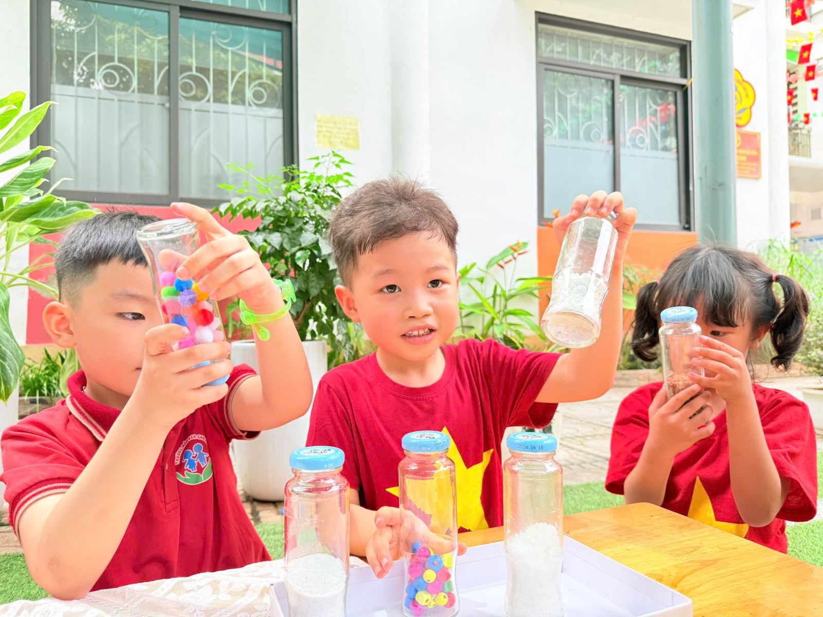 Với chiếc lọ giống hệt nhau nhưng nguyên liệu khác nhau, các bé đã tạo ra những âm thanh thú vị. Trẻ háo hức quan sát, đặt câu hỏi và học cách suy luận, phát triển tư duy logic ngay từ những trải nghiệm gần gũi.