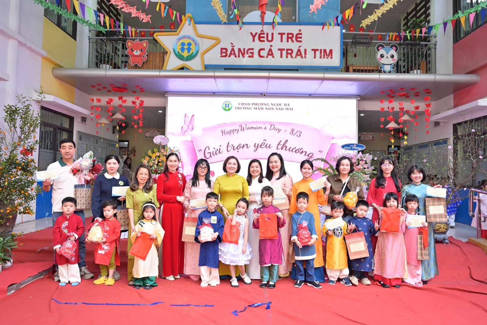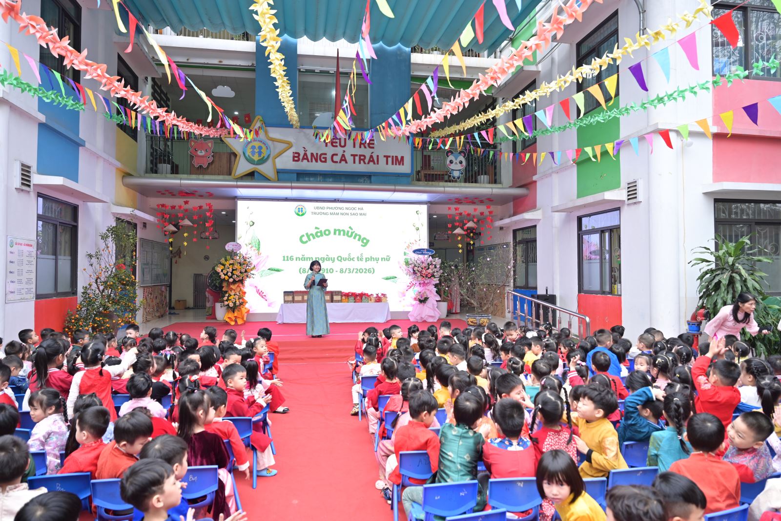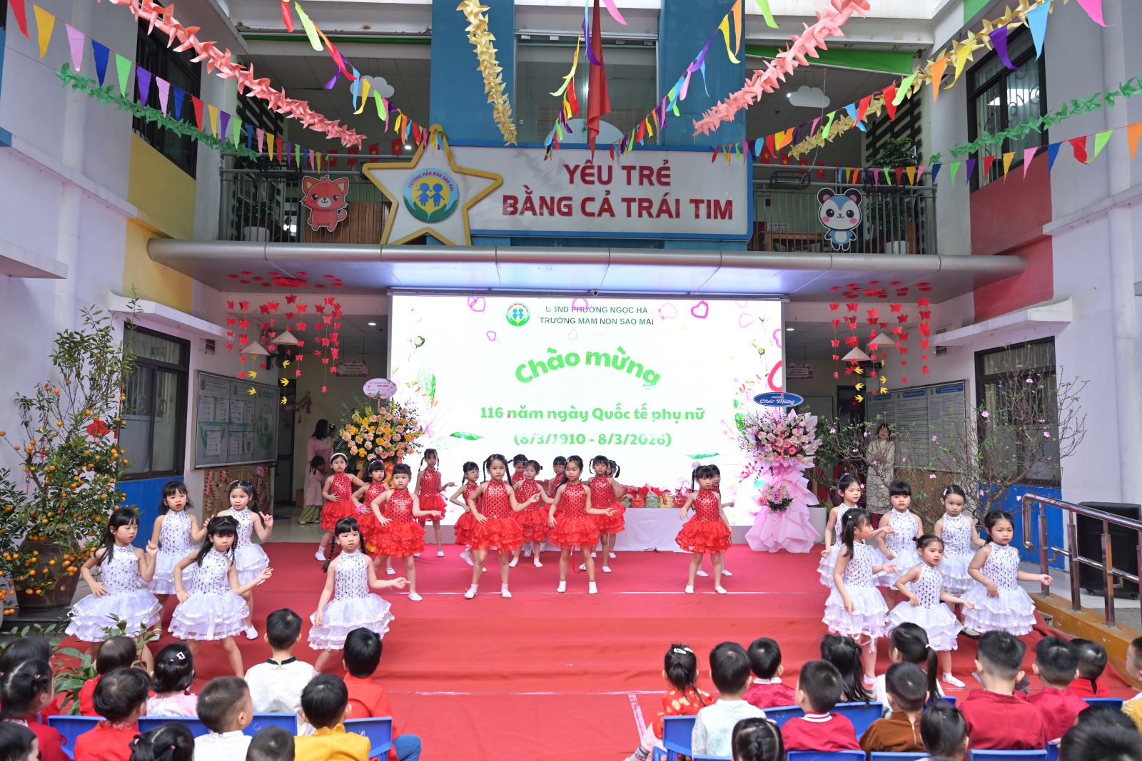 Ngày Quốc tế Phụ nữ 8/3 không chỉ là dịp tôn vinh vẻ đẹp, vai trò và những đóng góp to lớn của người phụ nữ trong gia đình và xã hội, mà còn là cơ hội để giáo dục trẻ lòng biết ơn, tình yêu thương đối với bà, mẹ và cô giáo. Với ý nghĩa đó, Trường Mầm non Sao Mai đã tổ chức chương trình kỷ niệm 116 năm ngày Quốc tế phụ nữ 8/3 kết hợp các hoạt động trải nghiệm, thi đua sôi nổi, tạo sân chơi bổ ích cho trẻ, đồng thời tăng cường sự gắn kết giữa gia đình và nhà trường.