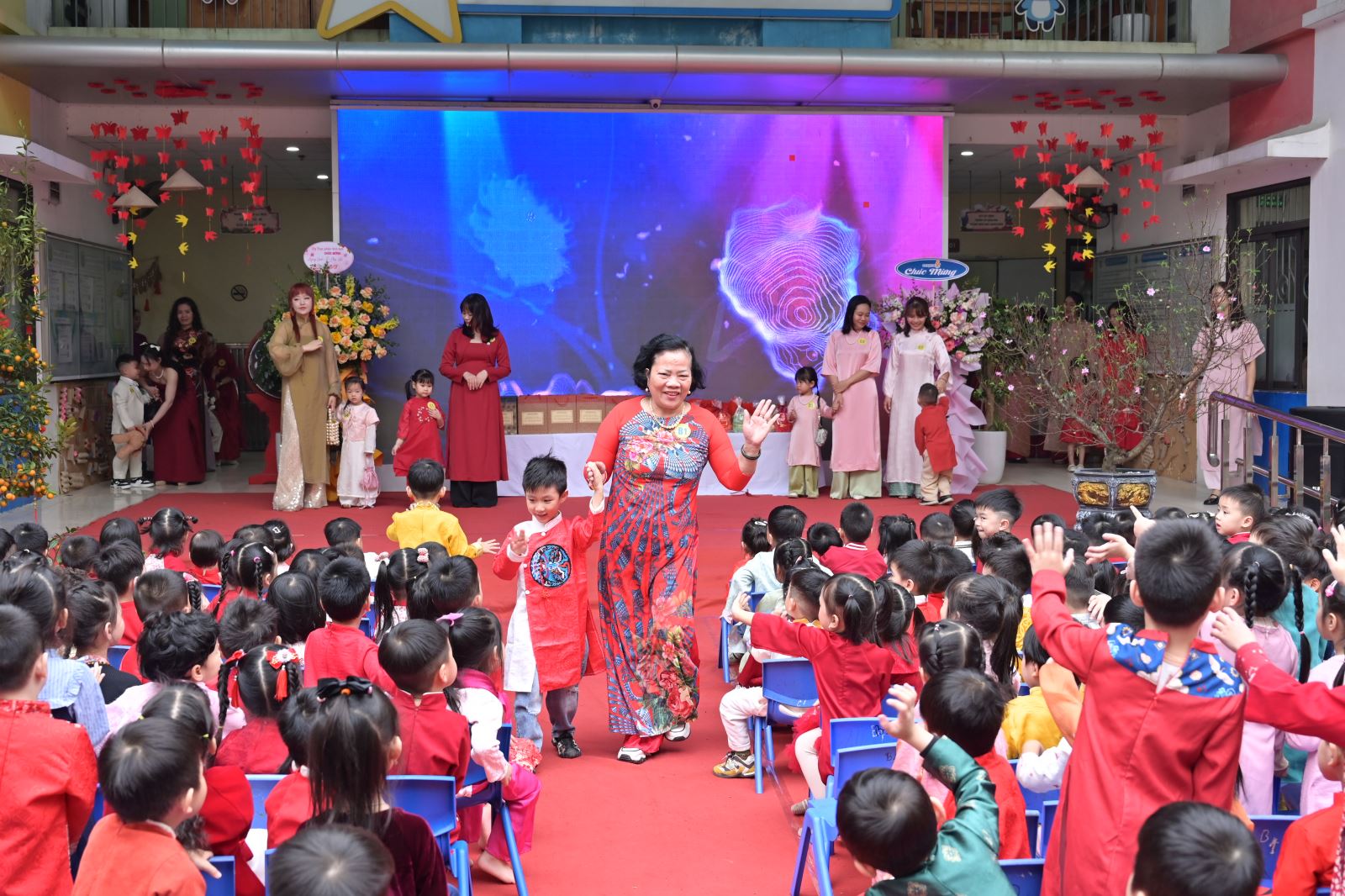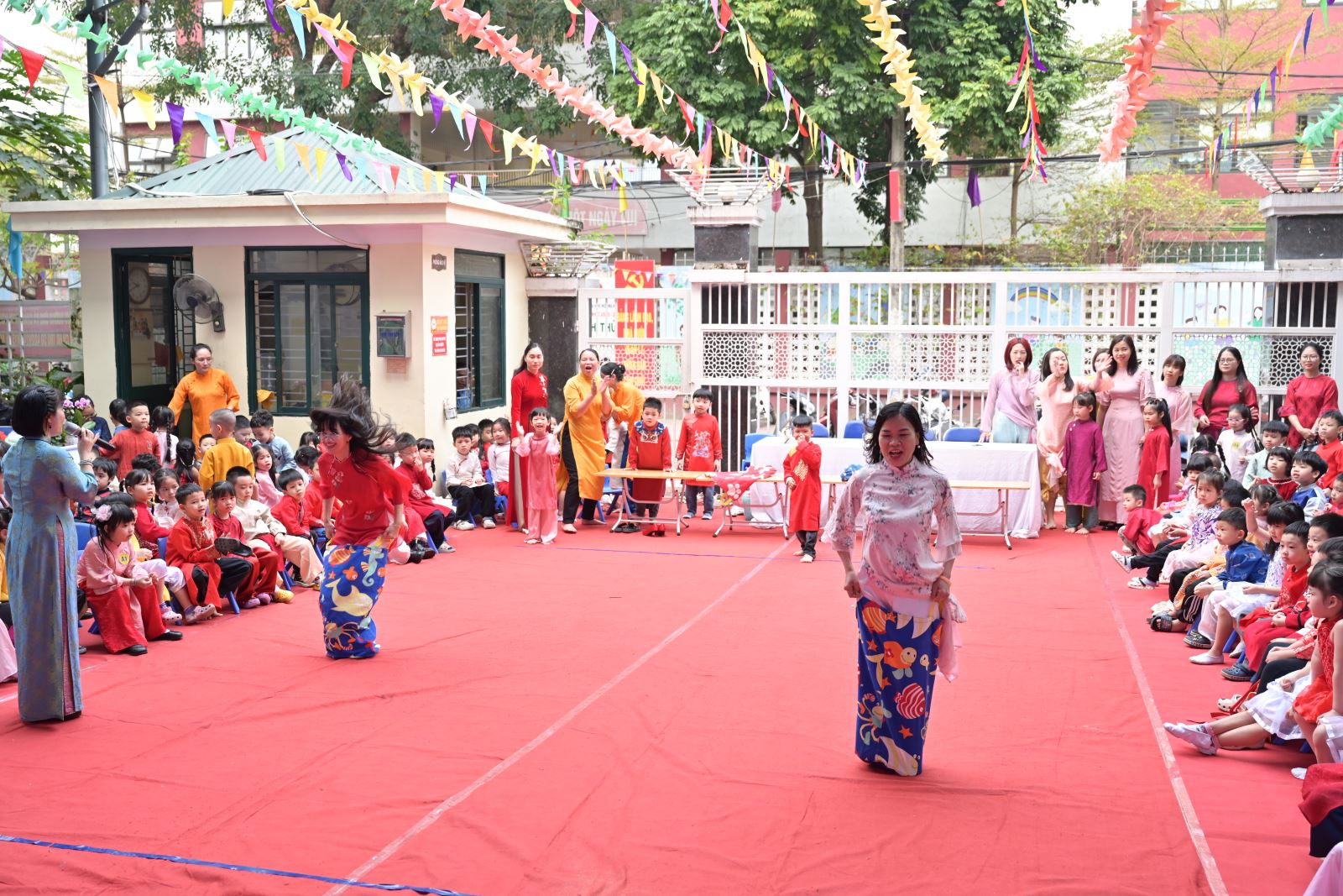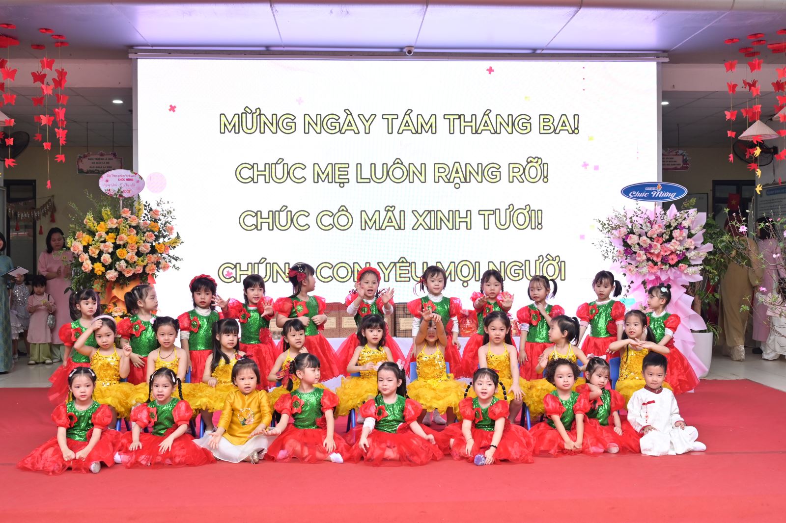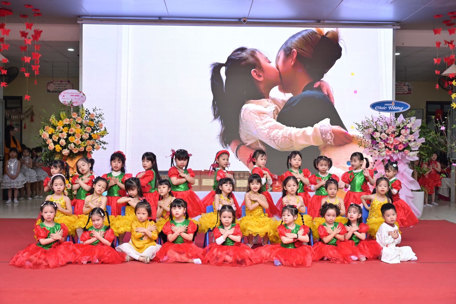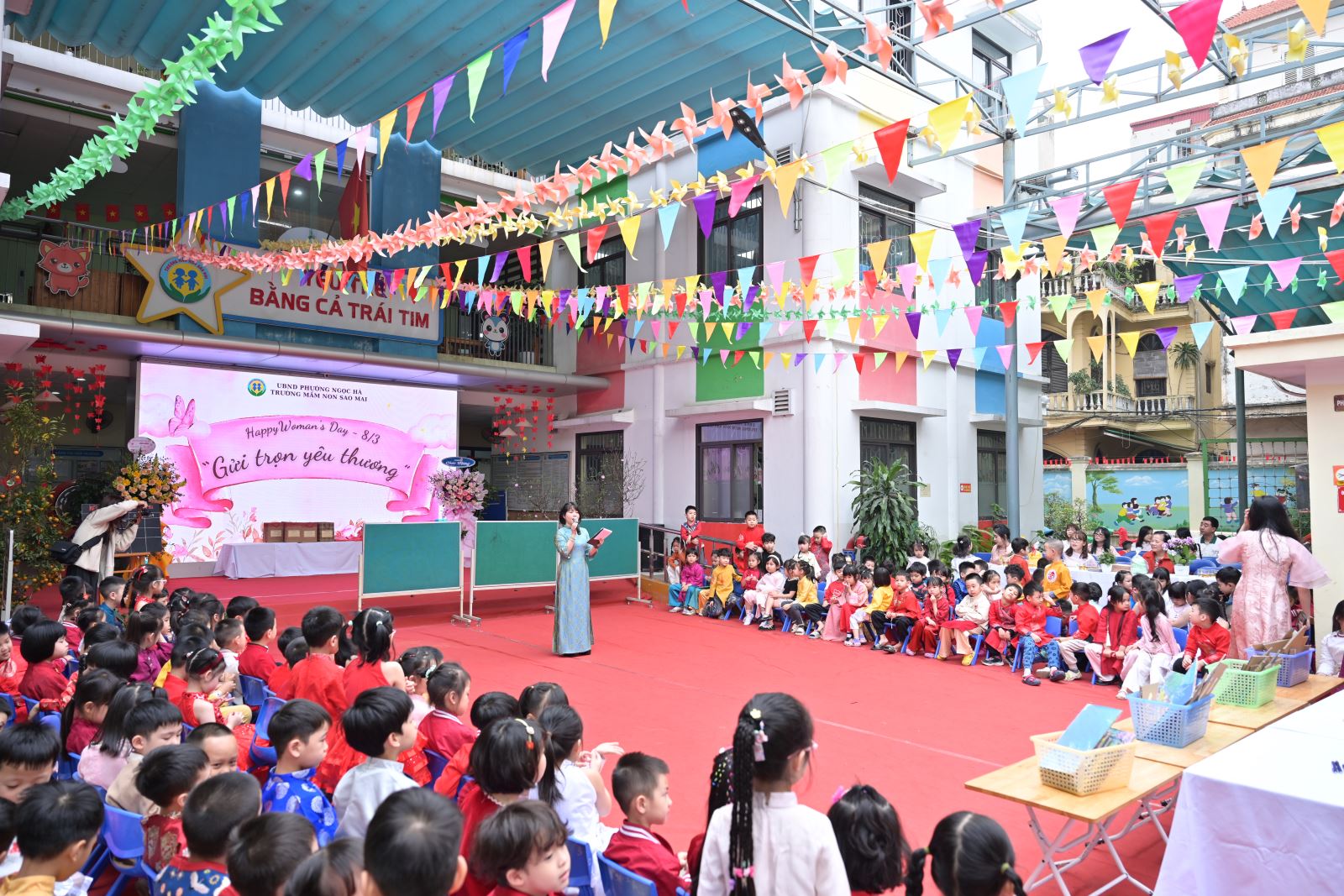 Chương trình mở đầu bằng phần tuyên bố lý do, giới thiệu đại biểu và phát biểu khai mạc của đồng chí Hiệu trưởng Bùi Thị Thu Hiền. Tiếp đó là các tiết mục văn nghệ đặc sắc của các con khối Mẫu giáo Nhỡ và Mẫu giáo Lớn, thể hiện tình cảm yêu thương, kính trọng dành cho bà, cho mẹ và cô giáo.