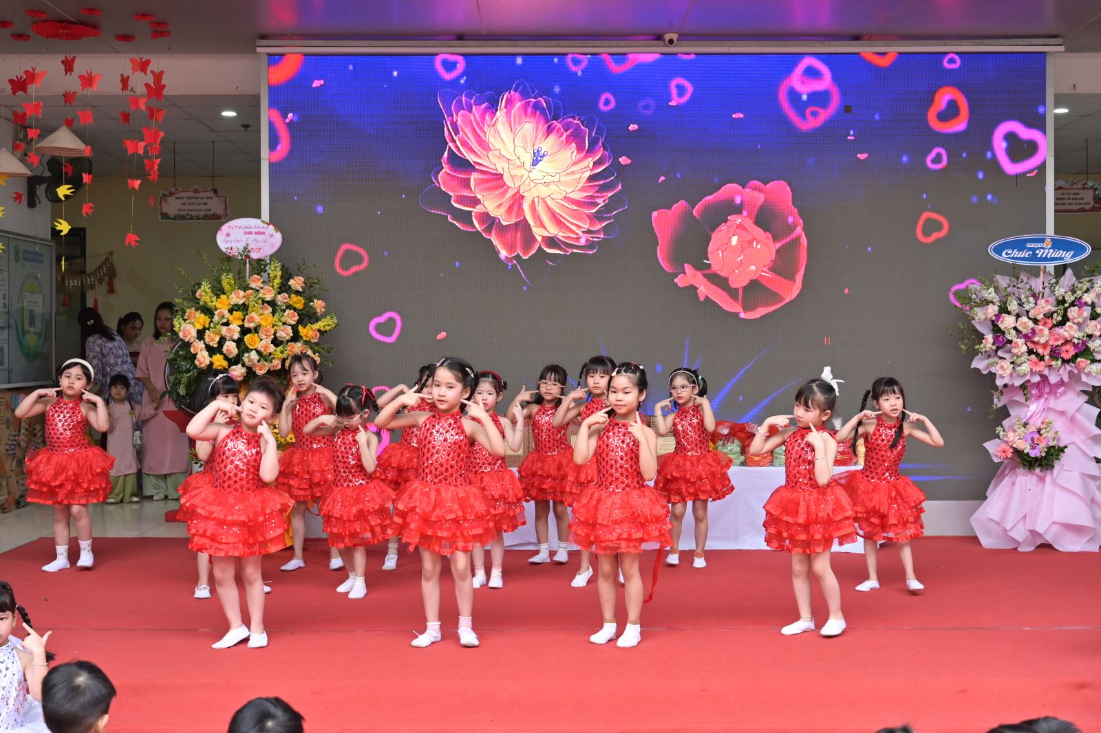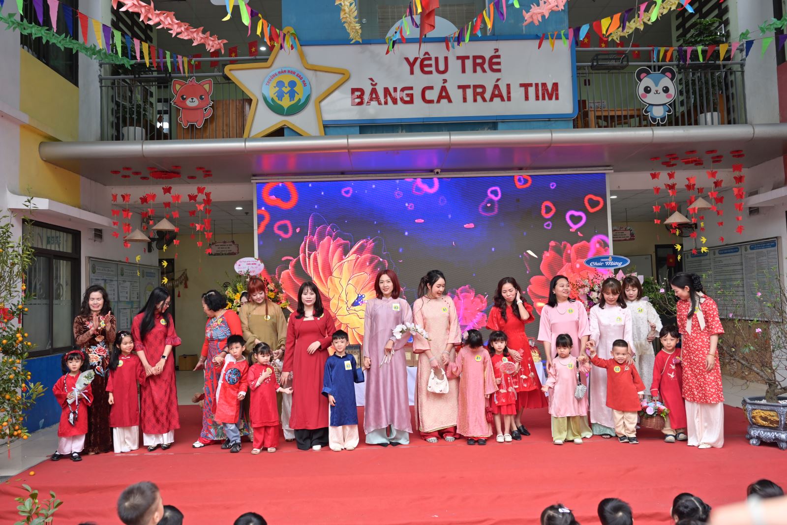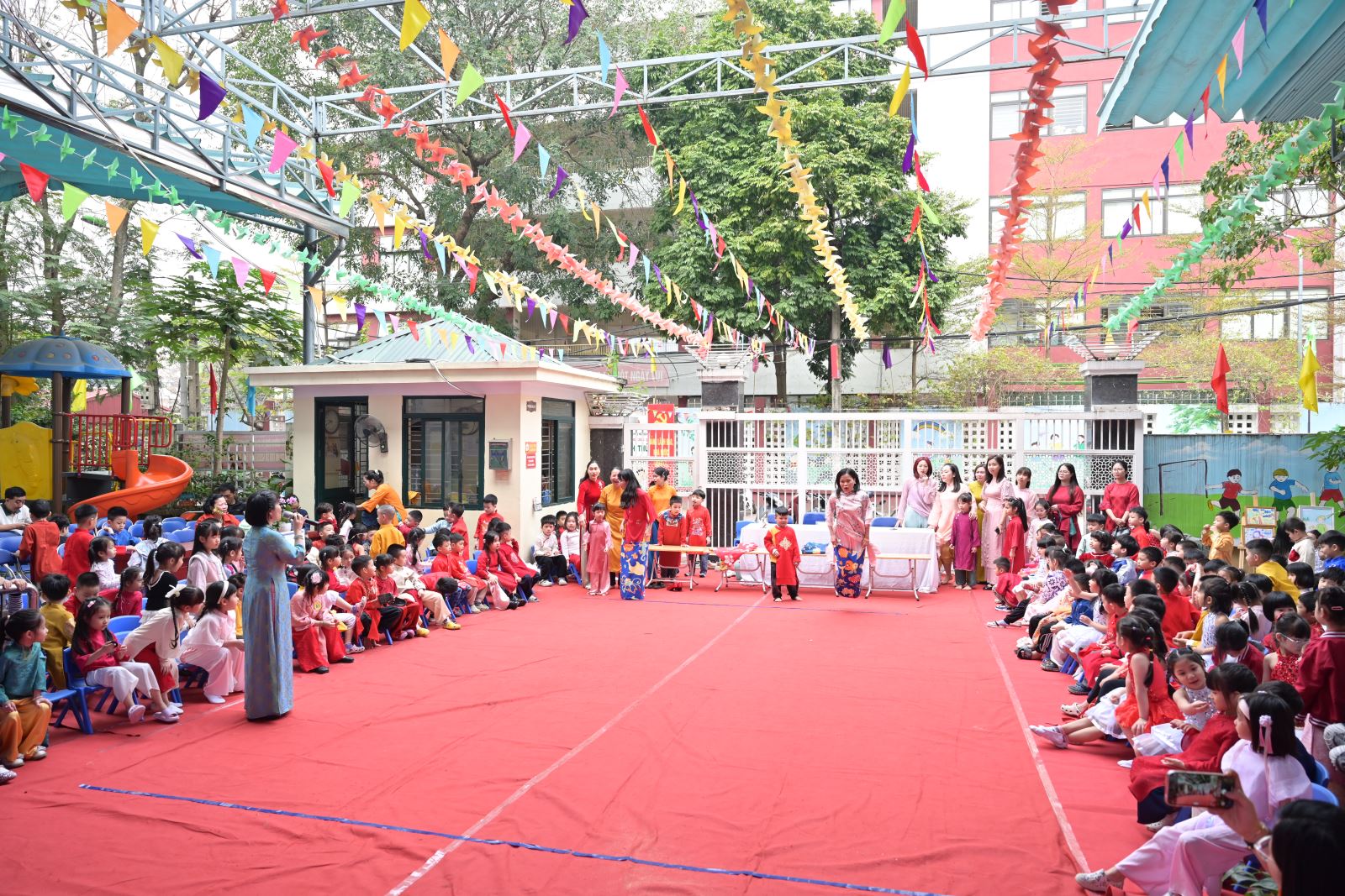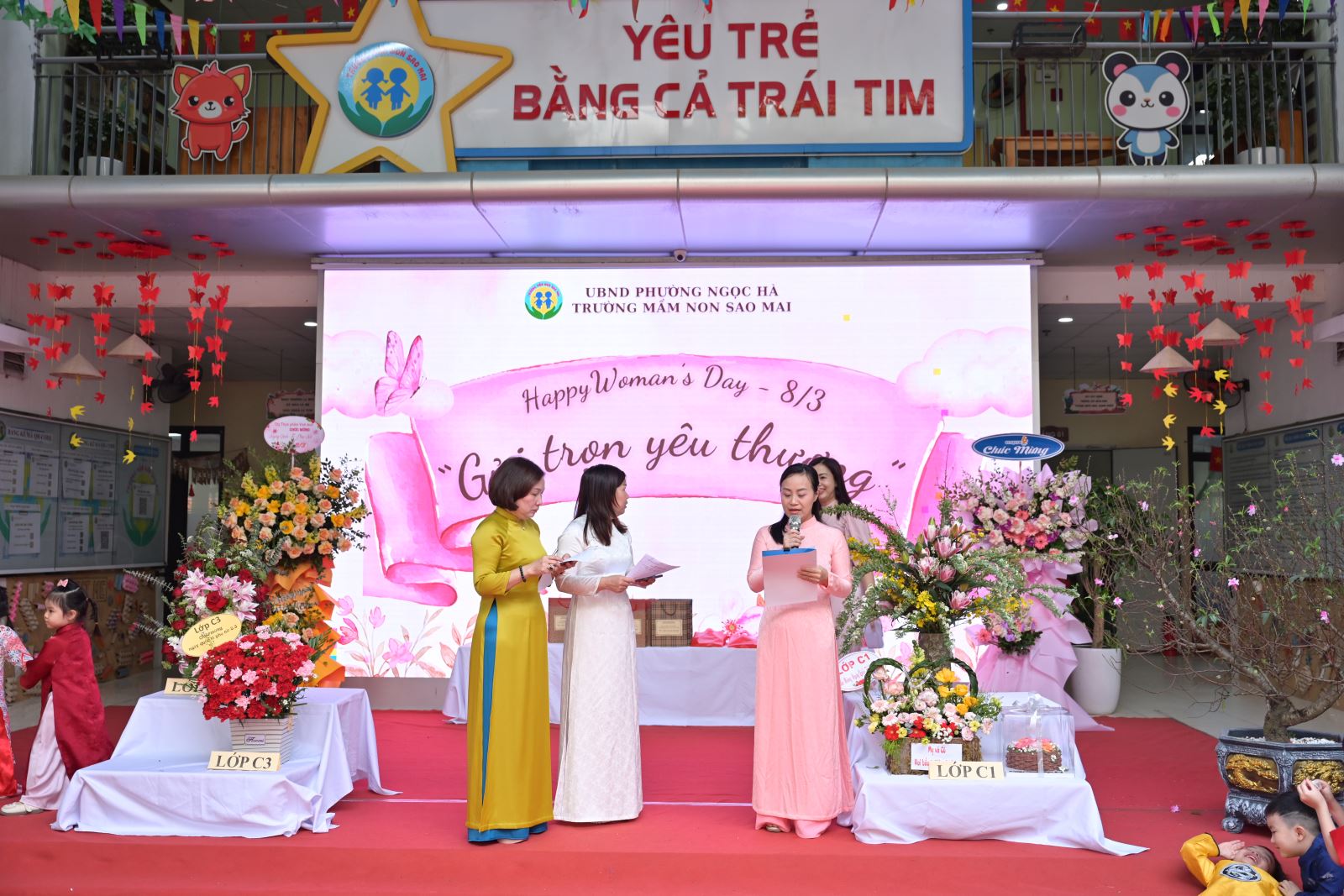 Chương trình mở đầu bằng phần tuyên bố lý do, giới thiệu đại biểu và phát biểu khai mạc của đồng chí Hiệu trưởng Bùi Thị Thu Hiền. Tiếp đó là các tiết mục văn nghệ đặc sắc của các con khối Mẫu giáo Nhỡ và Mẫu giáo Lớn, thể hiện tình cảm yêu thương, kính trọng dành cho bà, cho mẹ và cô giáo.