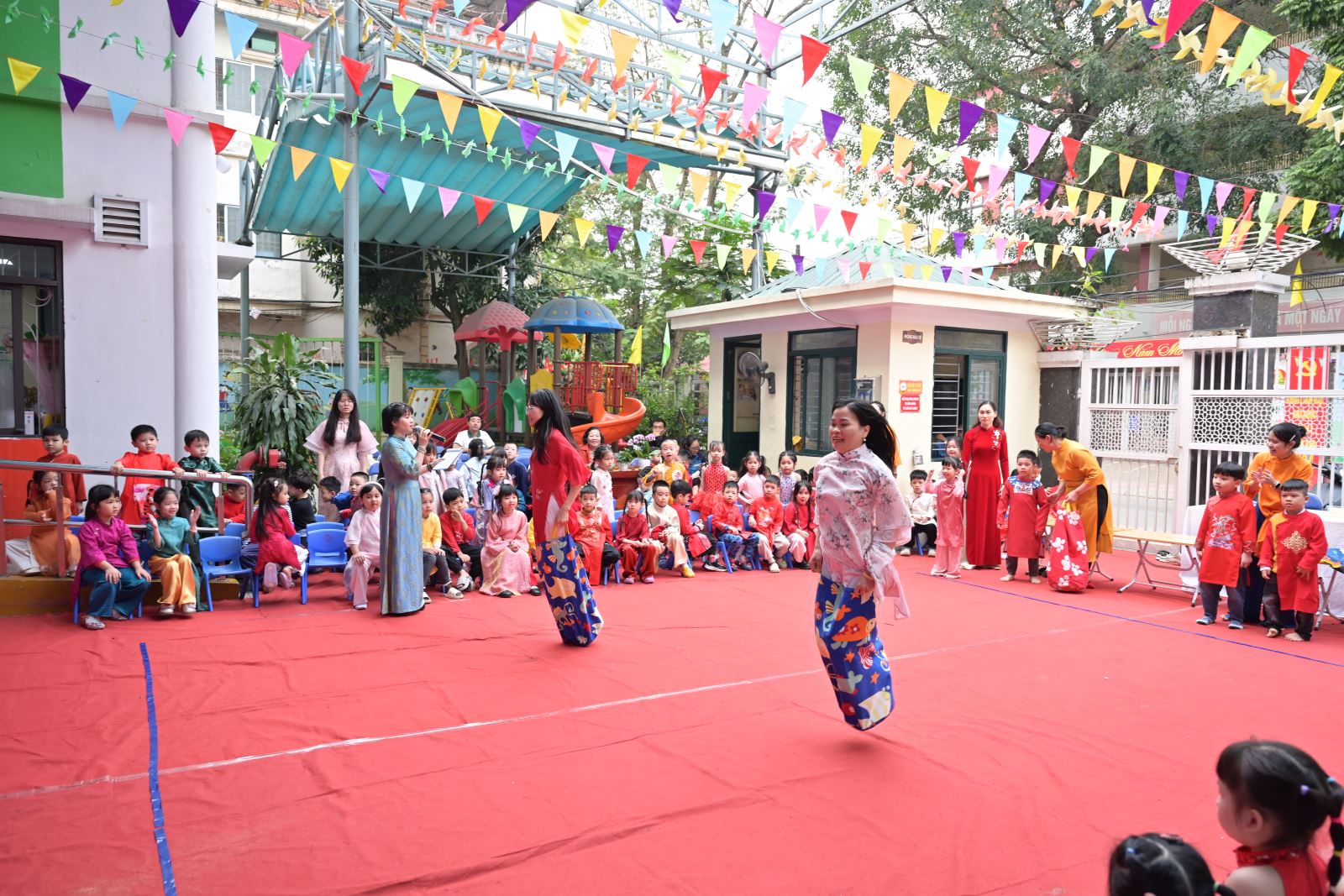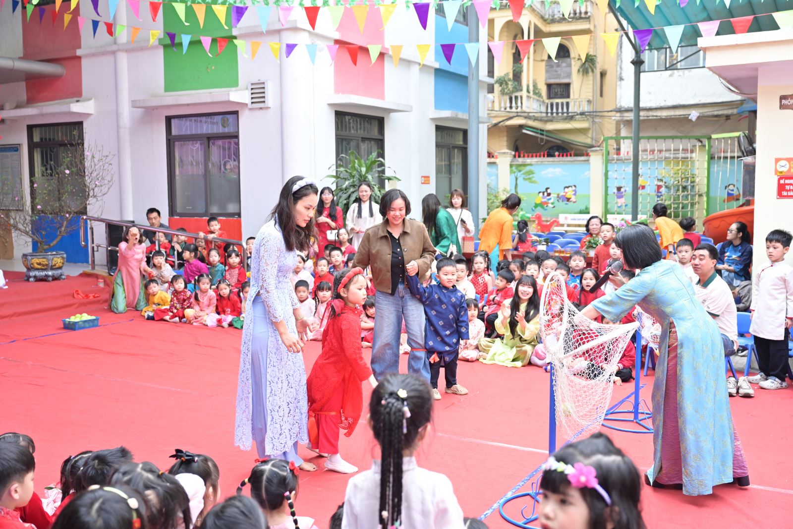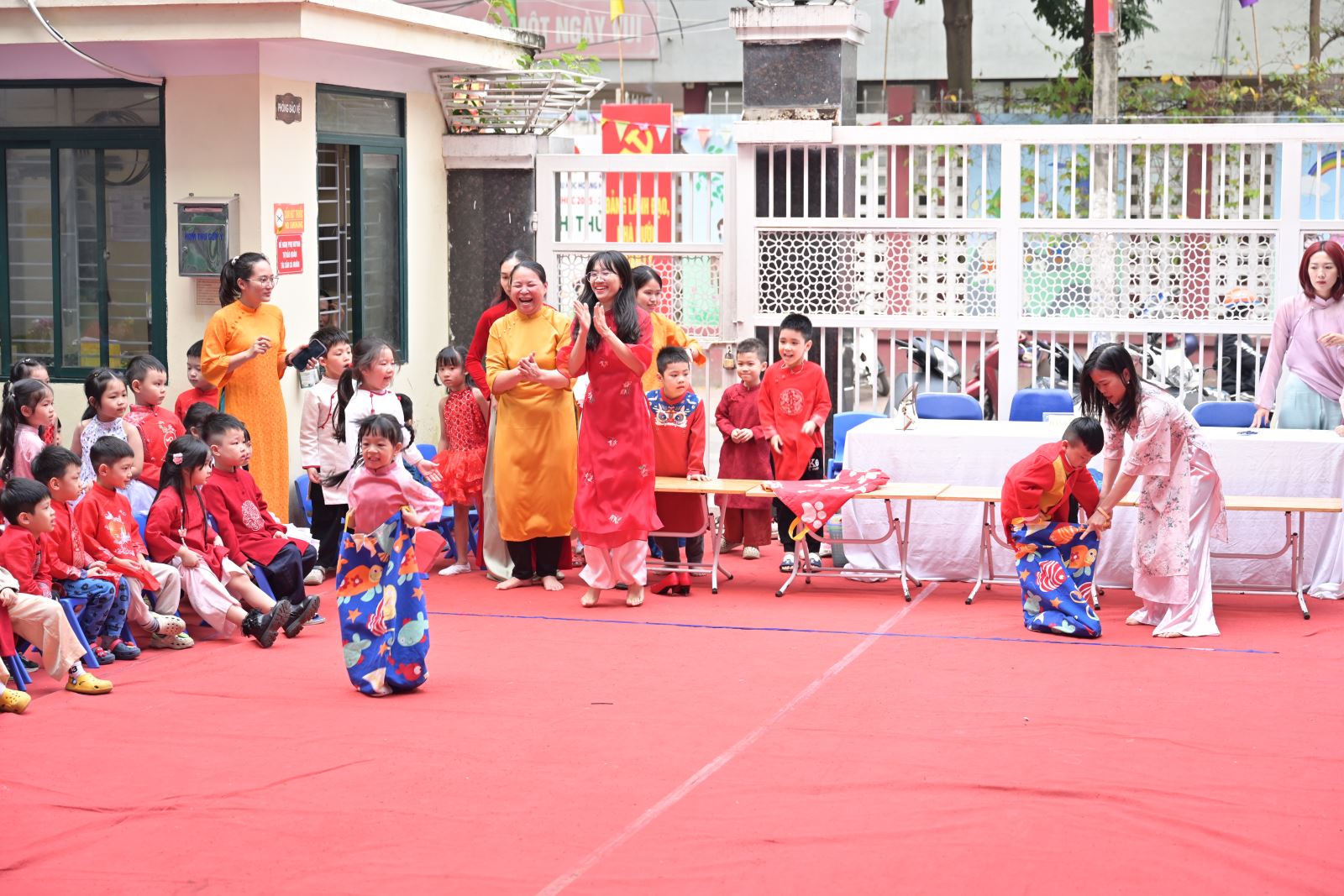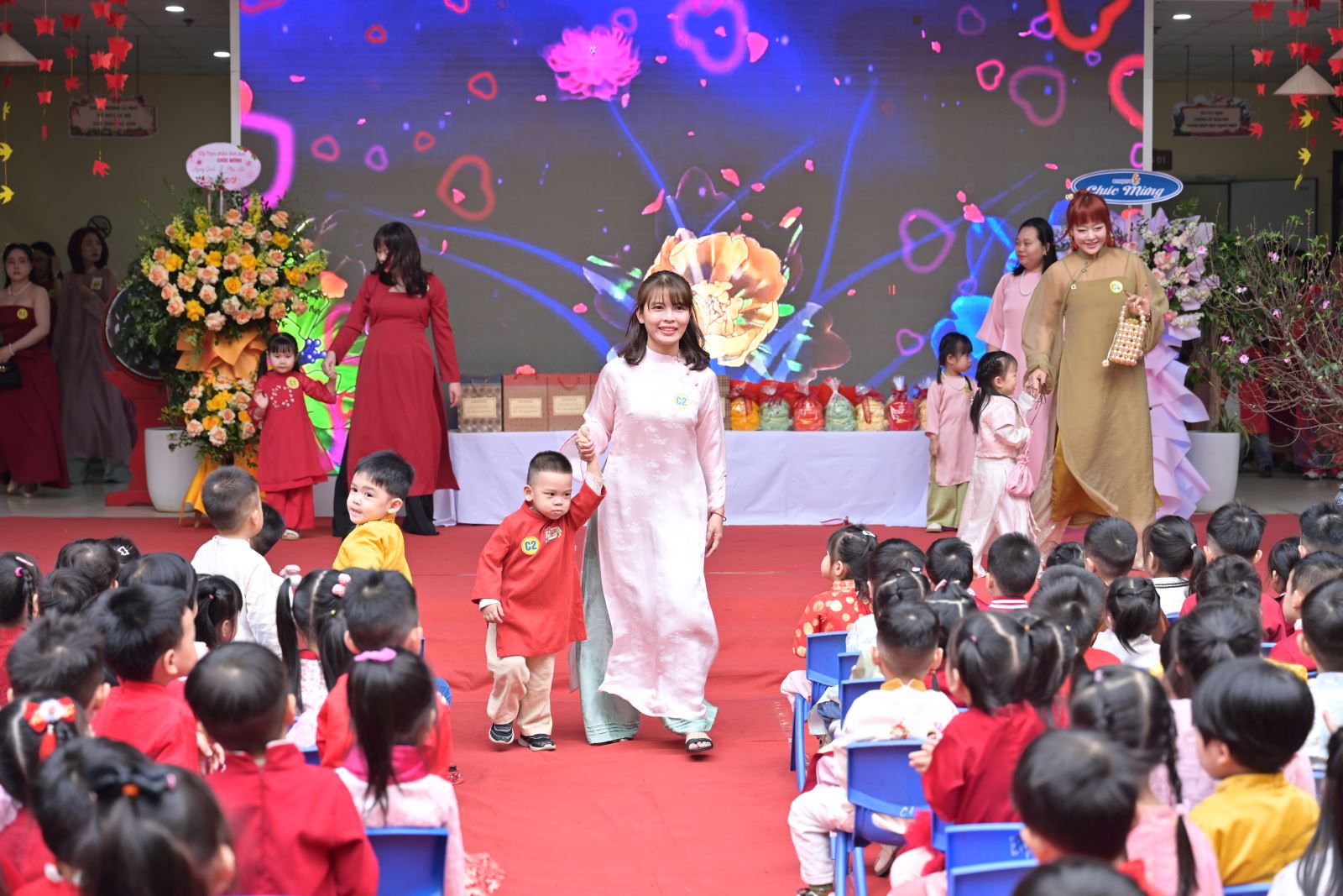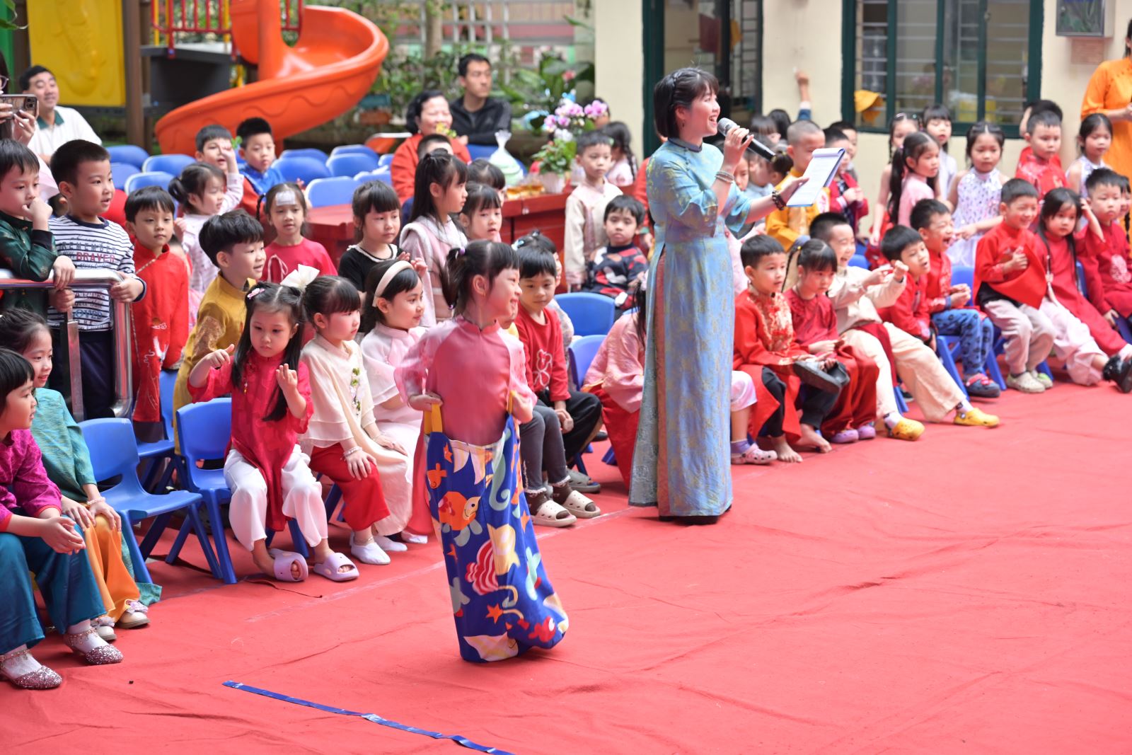 Chương trình mở đầu bằng phần tuyên bố lý do, giới thiệu đại biểu và phát biểu khai mạc của đồng chí Hiệu trưởng Bùi Thị Thu Hiền. Tiếp đó là các tiết mục văn nghệ đặc sắc của các con khối Mẫu giáo Nhỡ và Mẫu giáo Lớn, thể hiện tình cảm yêu thương, kính trọng dành cho bà, cho mẹ và cô giáo.