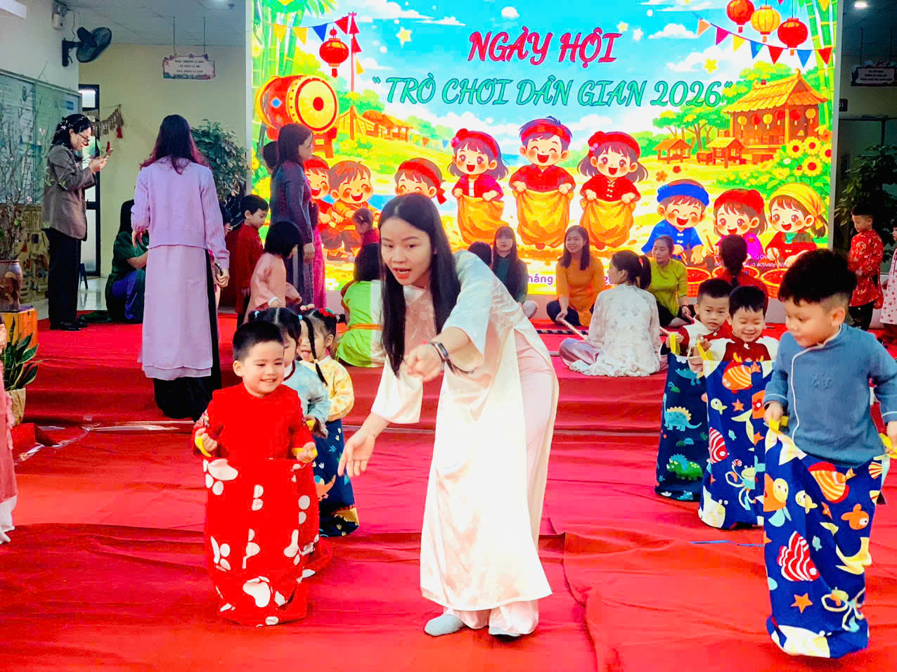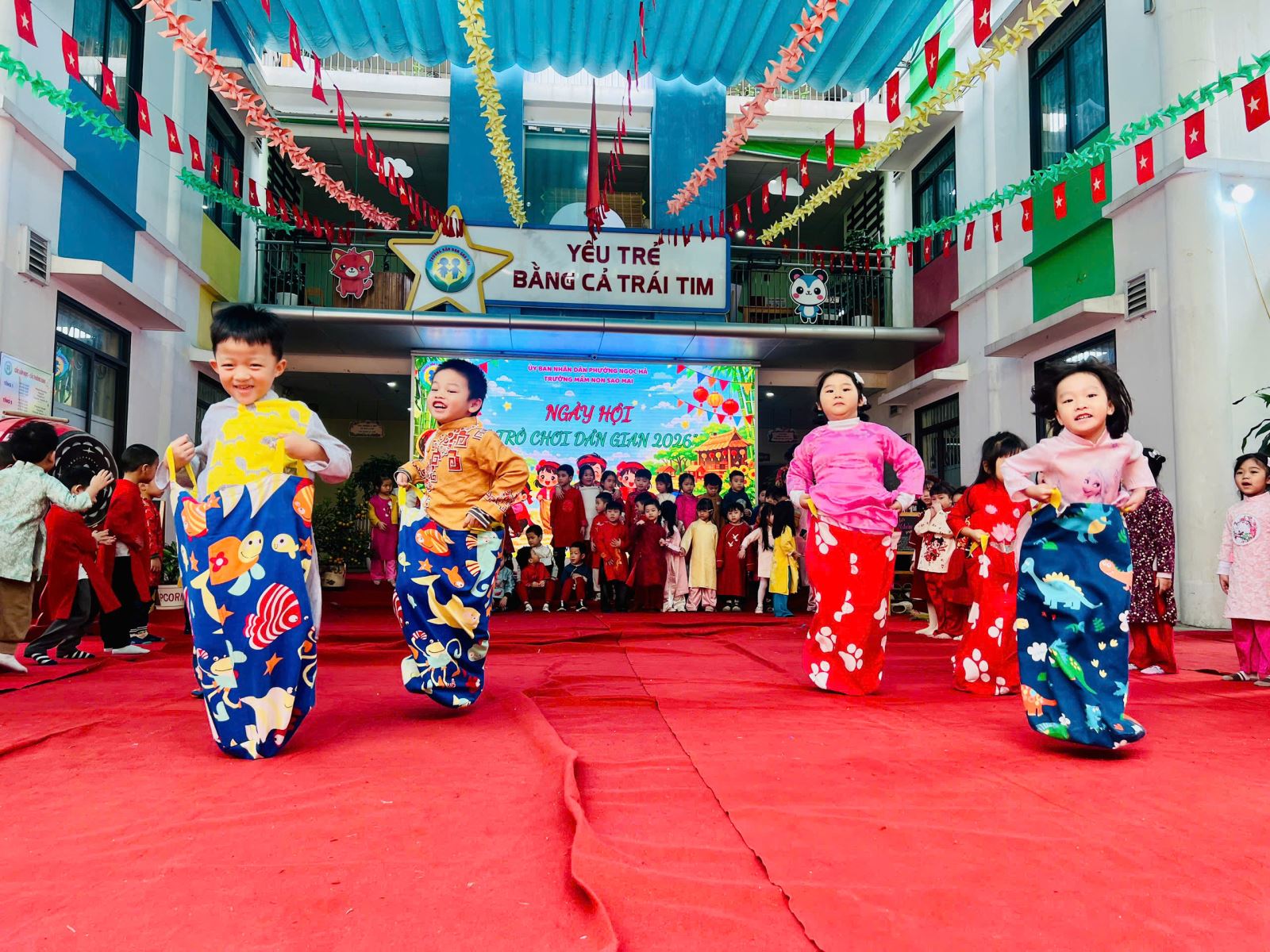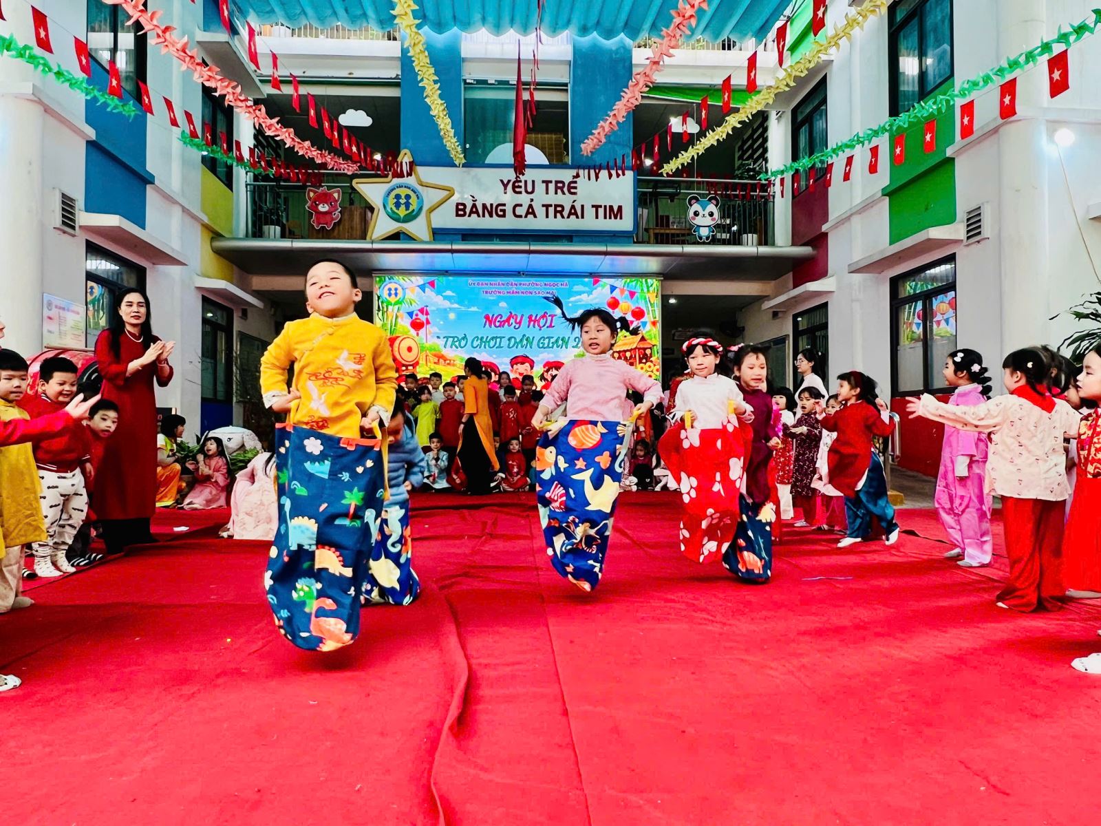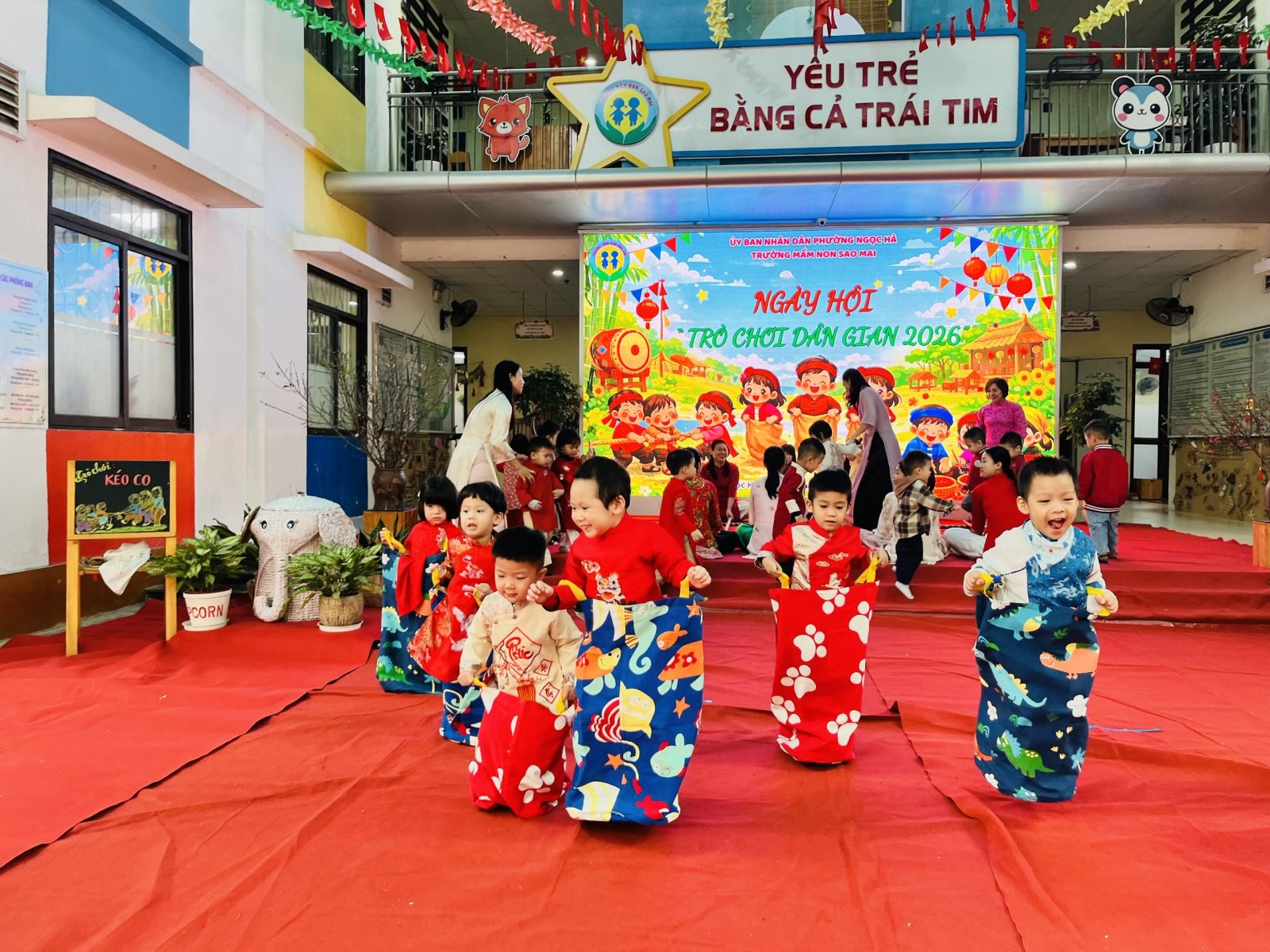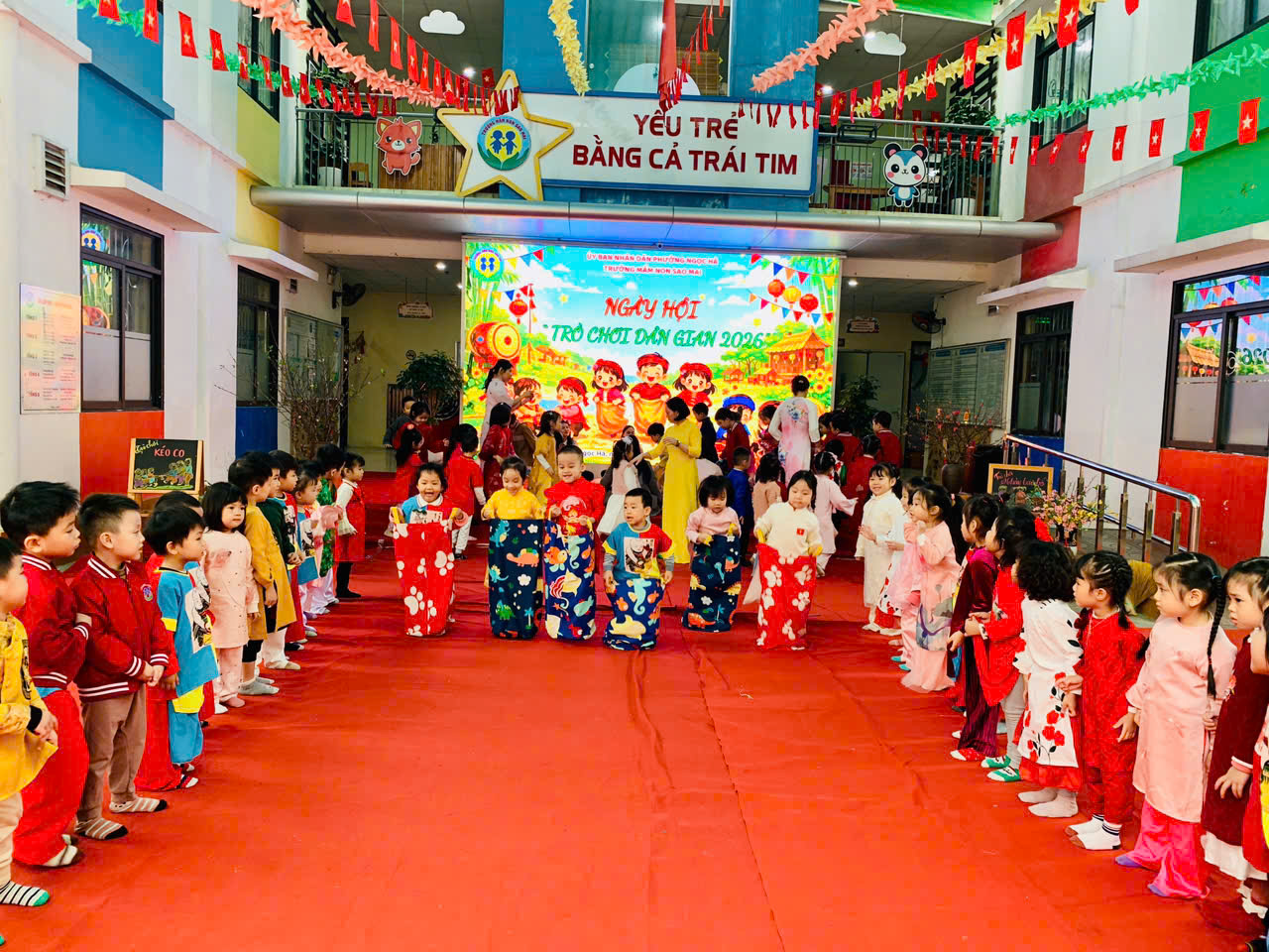Sau đó các bé được tham gia nhiều trò chơi dân gian quen thuộc, phù hợp với lứa tuổi mầm non như: nhảy bao bố, kéo co, ếch qua sông, gắp cua bỏ giỏ, đi cà kheo, ô ăn quan, nhảy sạp… Mỗi trò chơi đều được tổ chức khoa học, đảm bảo an toàn, tạo điều kiện để trẻ mạnh dạn tham gia, tự tin thể hiện bản thân và phối hợp cùng bạn bè.