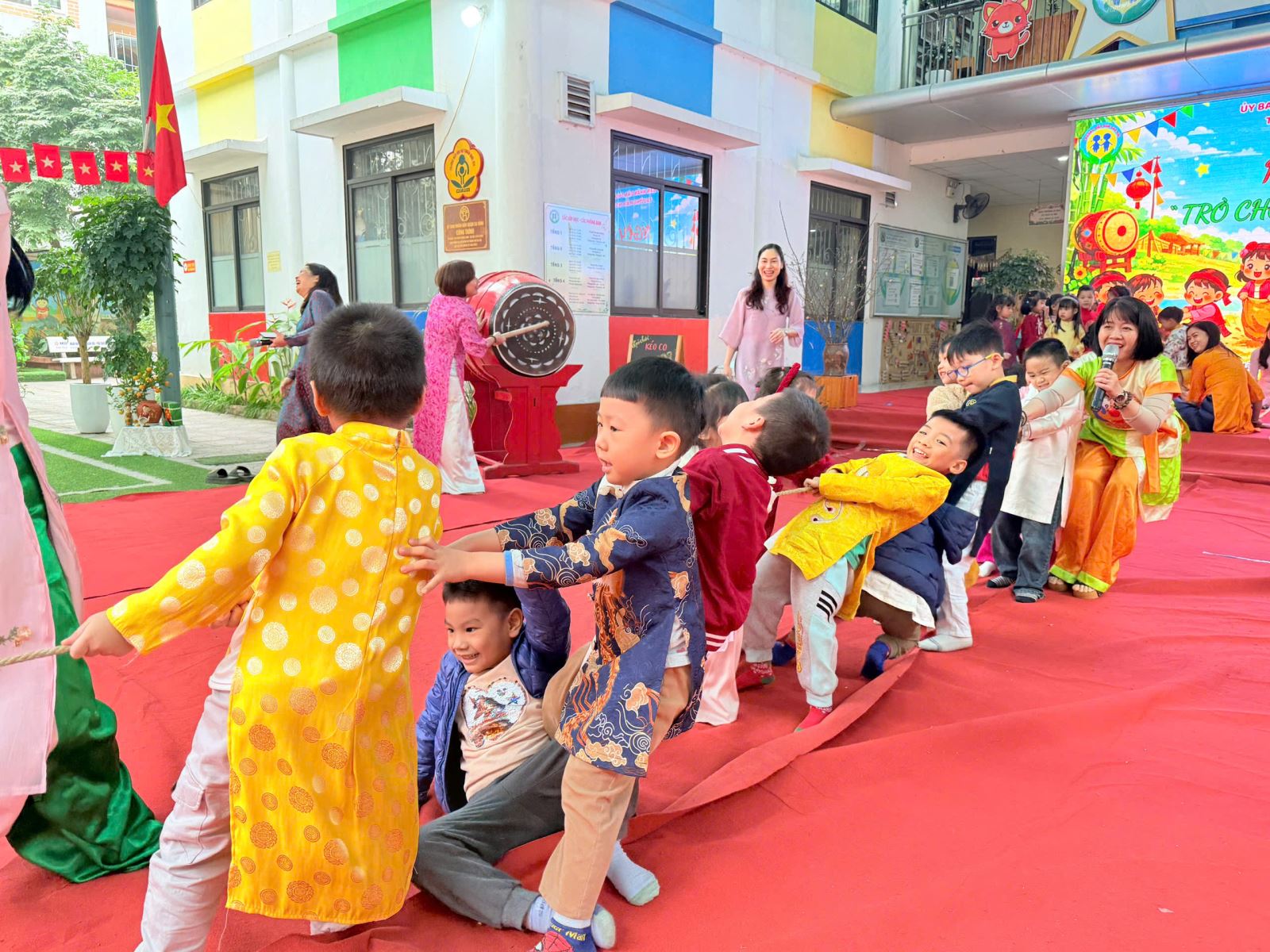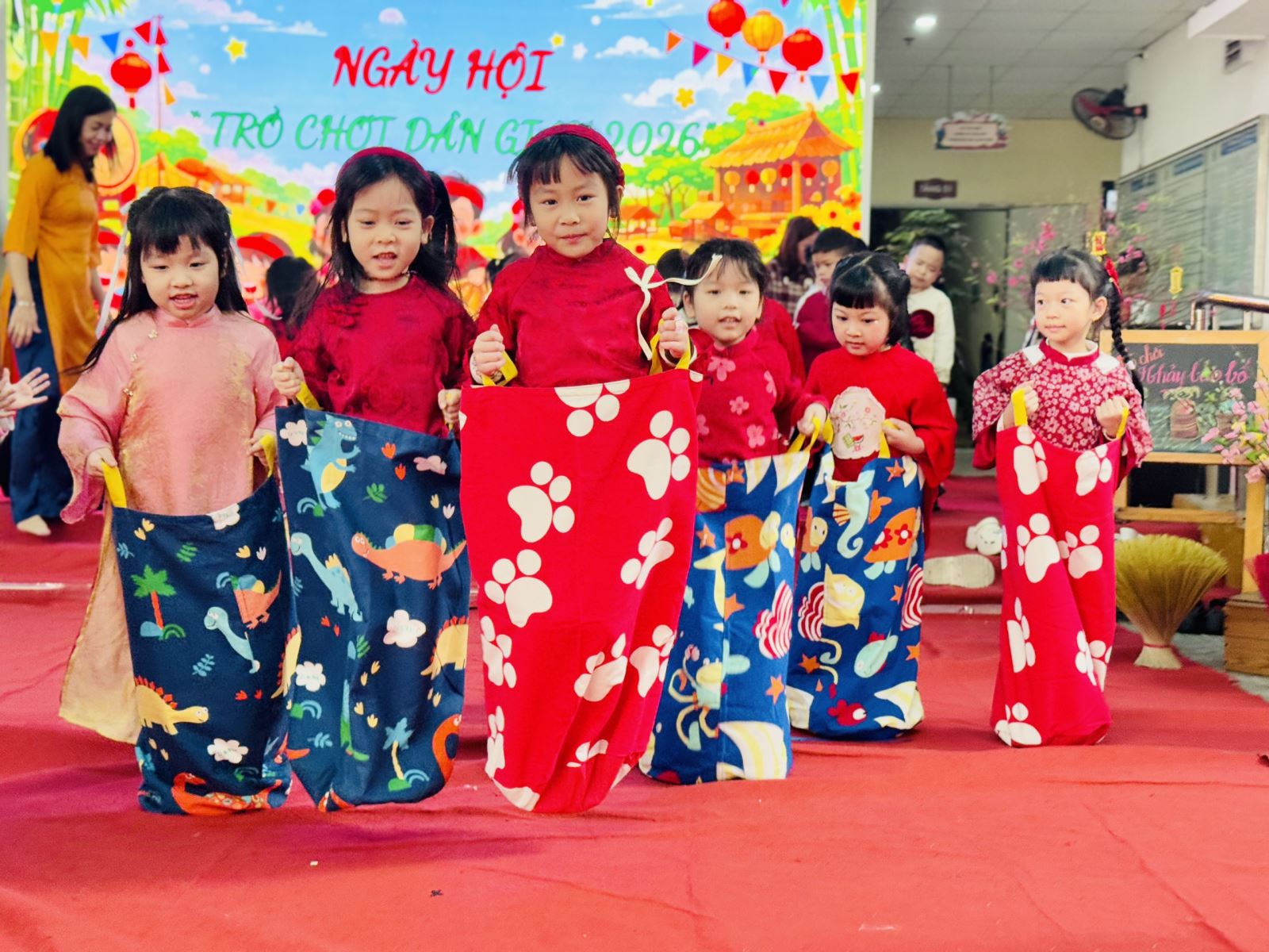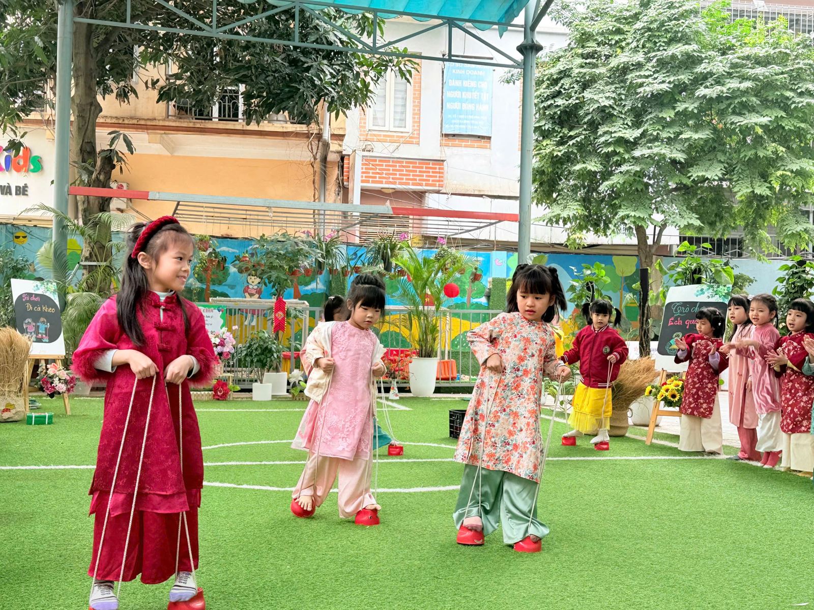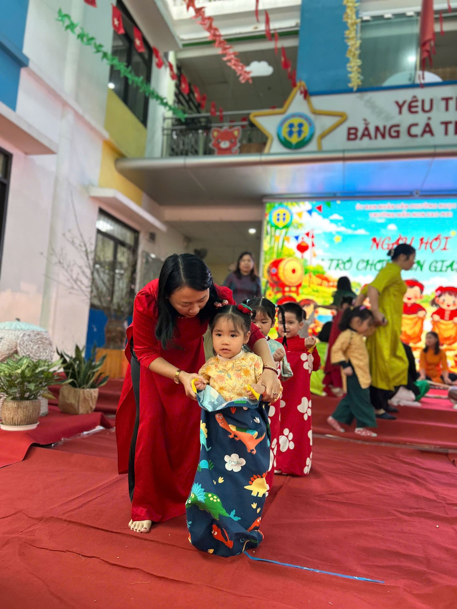 Sau đó các bé được tham gia nhiều trò chơi dân gian quen thuộc, phù hợp với lứa tuổi mầm non như: nhảy bao bố, kéo co, ếch qua sông, gắp cua bỏ giỏ, đi cà kheo, ô ăn quan, nhảy sạp… Mỗi trò chơi đều được tổ chức khoa học, đảm bảo an toàn, tạo điều kiện để trẻ mạnh dạn tham gia, tự tin thể hiện bản thân và phối hợp cùng bạn bè.