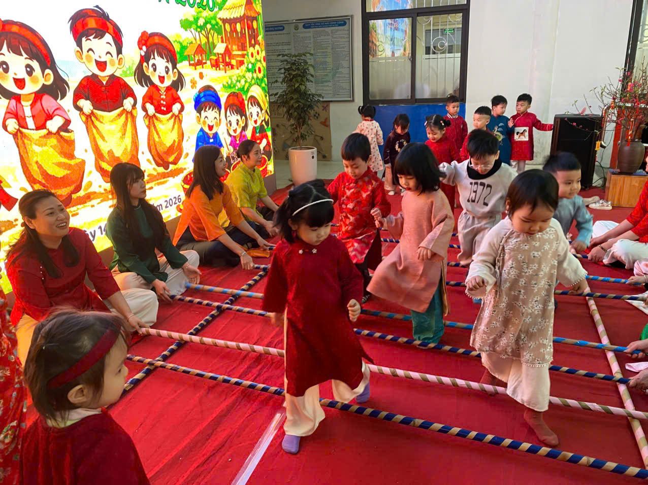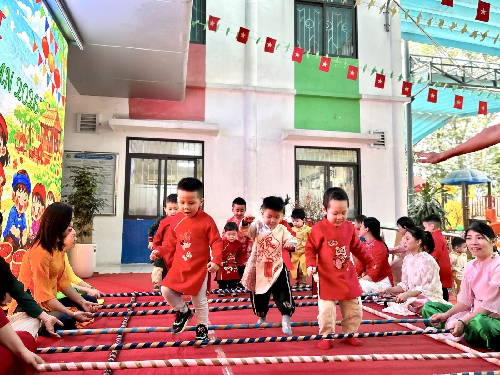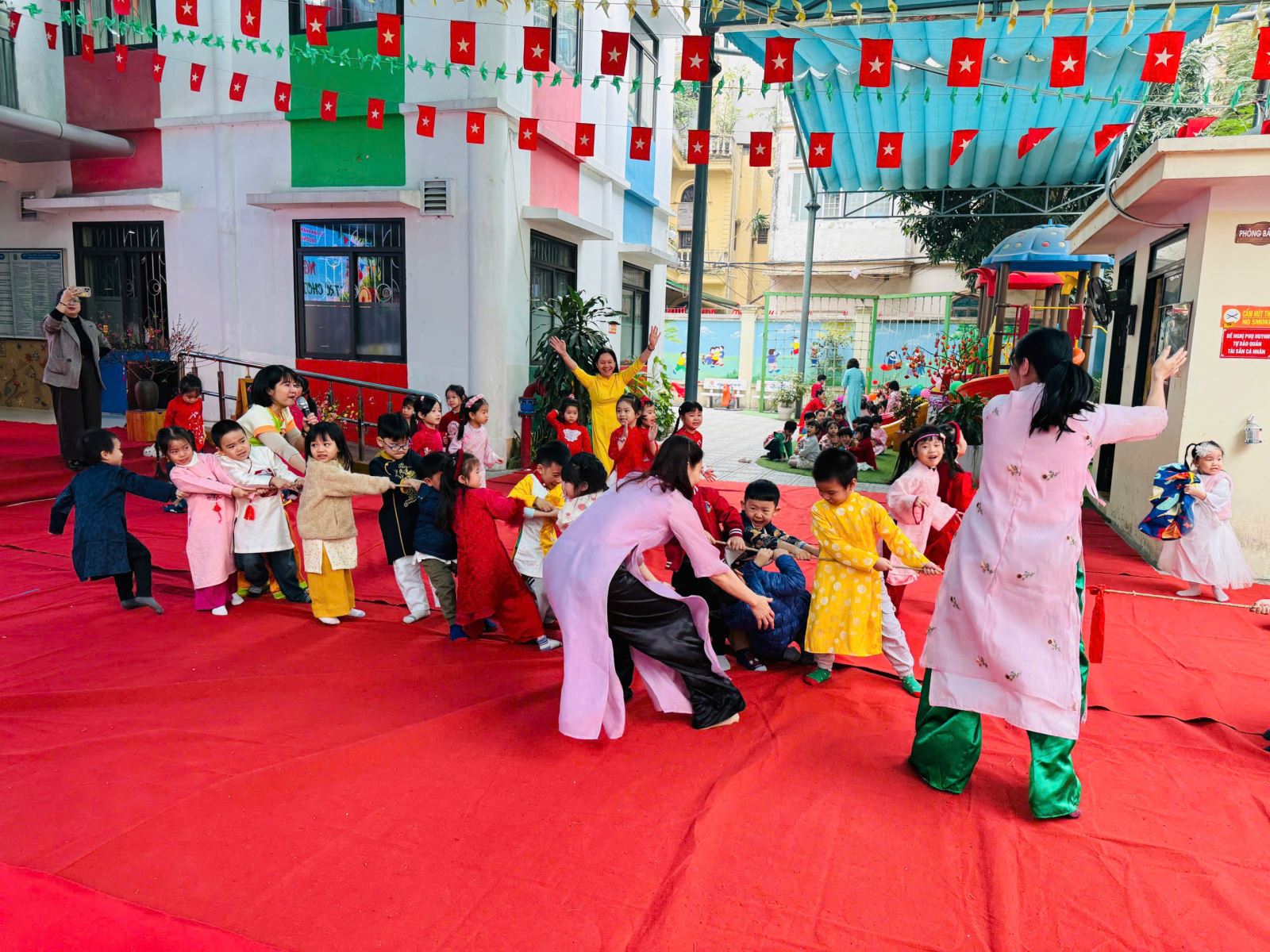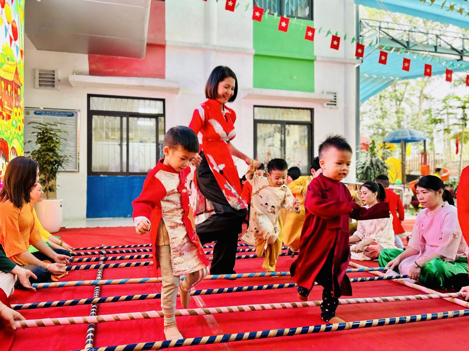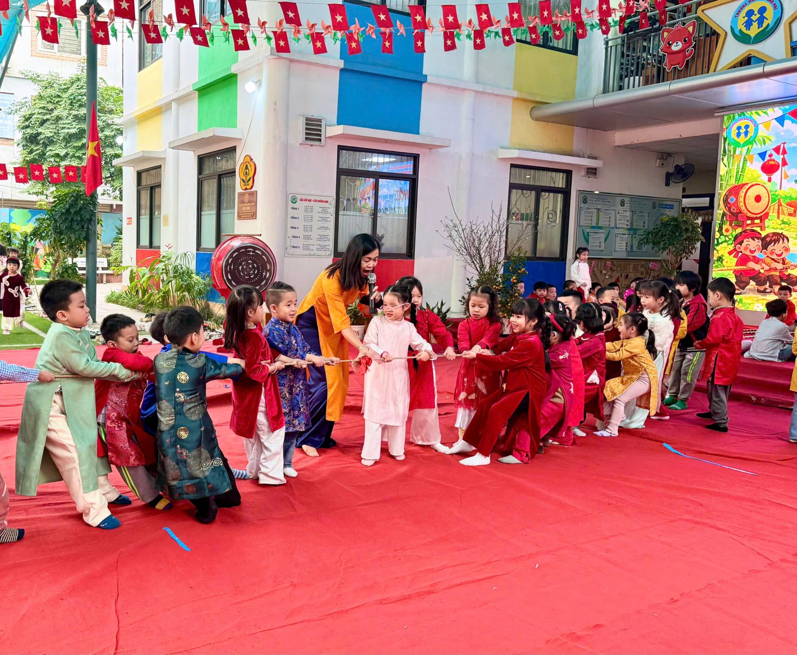 Sau đó các bé được tham gia nhiều trò chơi dân gian quen thuộc, phù hợp với lứa tuổi mầm non như: nhảy bao bố, kéo co, ếch qua sông, gắp cua bỏ giỏ, đi cà kheo, ô ăn quan, nhảy sạp… Mỗi trò chơi đều được tổ chức khoa học, đảm bảo an toàn, tạo điều kiện để trẻ mạnh dạn tham gia, tự tin thể hiện bản thân và phối hợp cùng bạn bè.