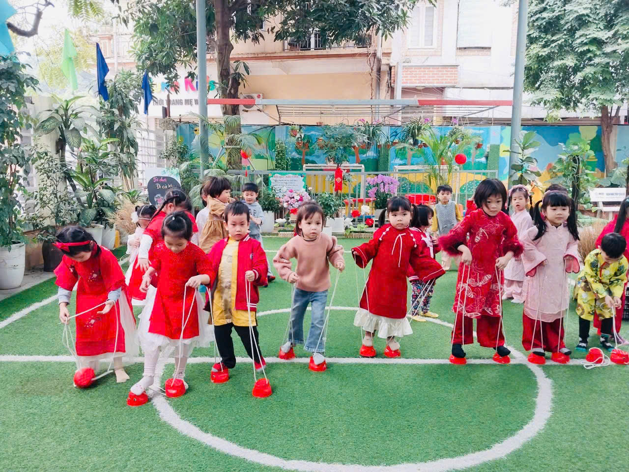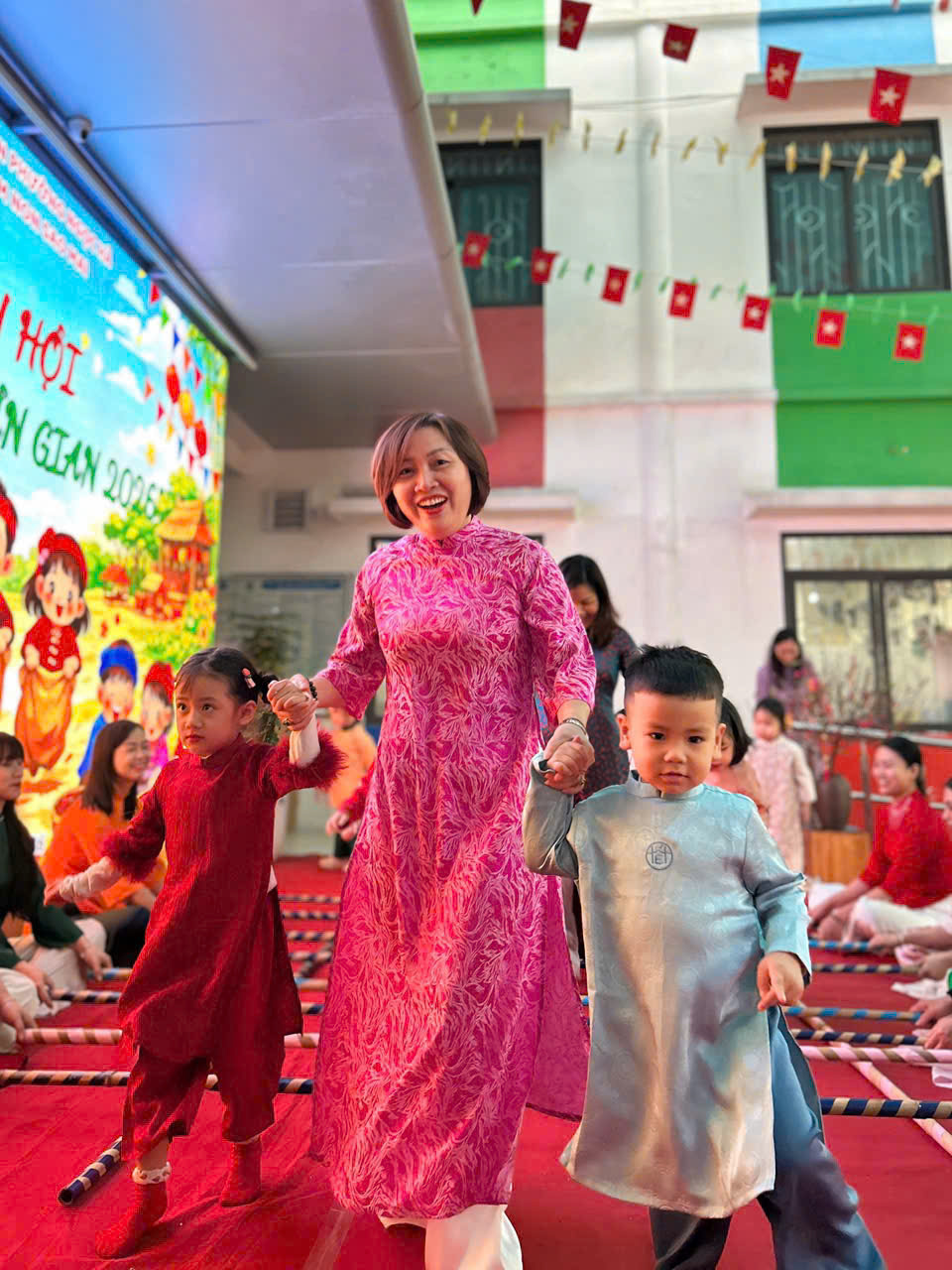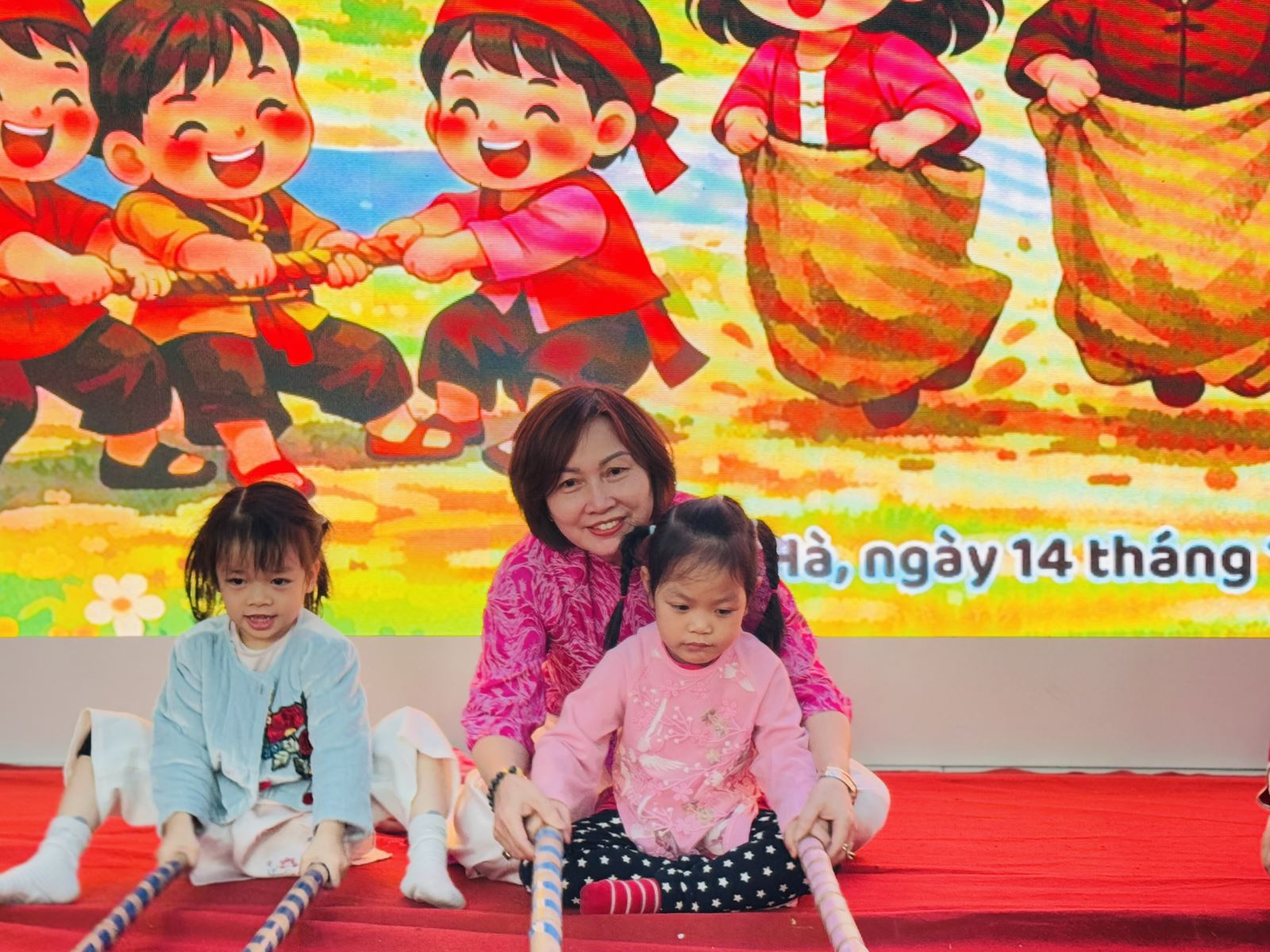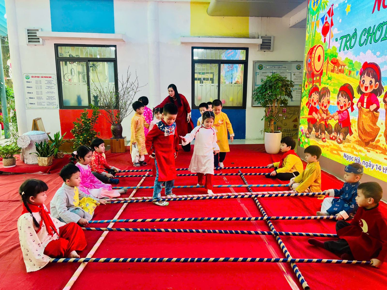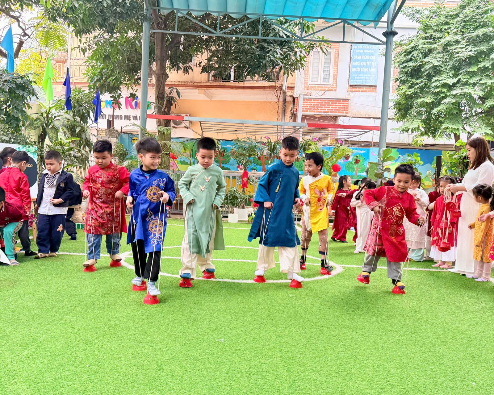 Sau đó các bé được tham gia nhiều trò chơi dân gian quen thuộc, phù hợp với lứa tuổi mầm non như: nhảy bao bố, kéo co, ếch qua sông, gắp cua bỏ giỏ, đi cà kheo, ô ăn quan, nhảy sạp… Mỗi trò chơi đều được tổ chức khoa học, đảm bảo an toàn, tạo điều kiện để trẻ mạnh dạn tham gia, tự tin thể hiện bản thân và phối hợp cùng bạn bè.