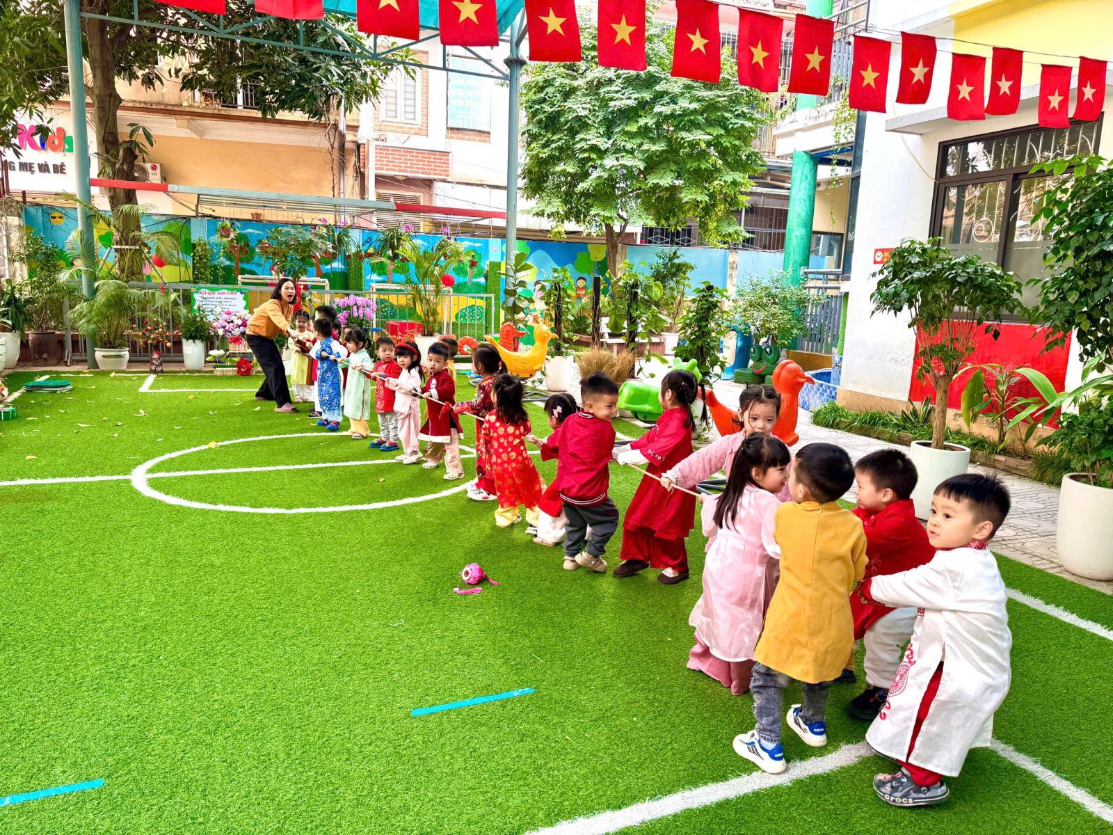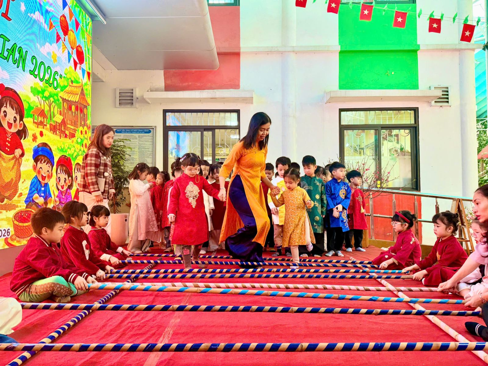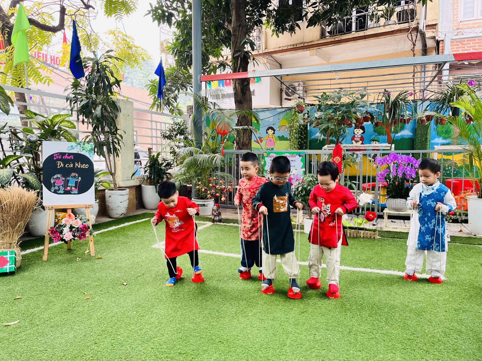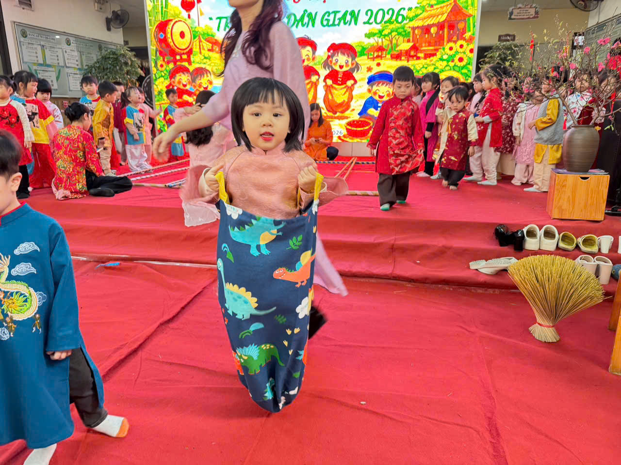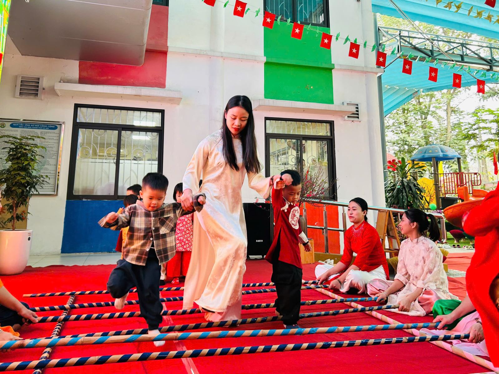 Sau đó các bé được tham gia nhiều trò chơi dân gian quen thuộc, phù hợp với lứa tuổi mầm non như: nhảy bao bố, kéo co, ếch qua sông, gắp cua bỏ giỏ, đi cà kheo, ô ăn quan, nhảy sạp… Mỗi trò chơi đều được tổ chức khoa học, đảm bảo an toàn, tạo điều kiện để trẻ mạnh dạn tham gia, tự tin thể hiện bản thân và phối hợp cùng bạn bè.