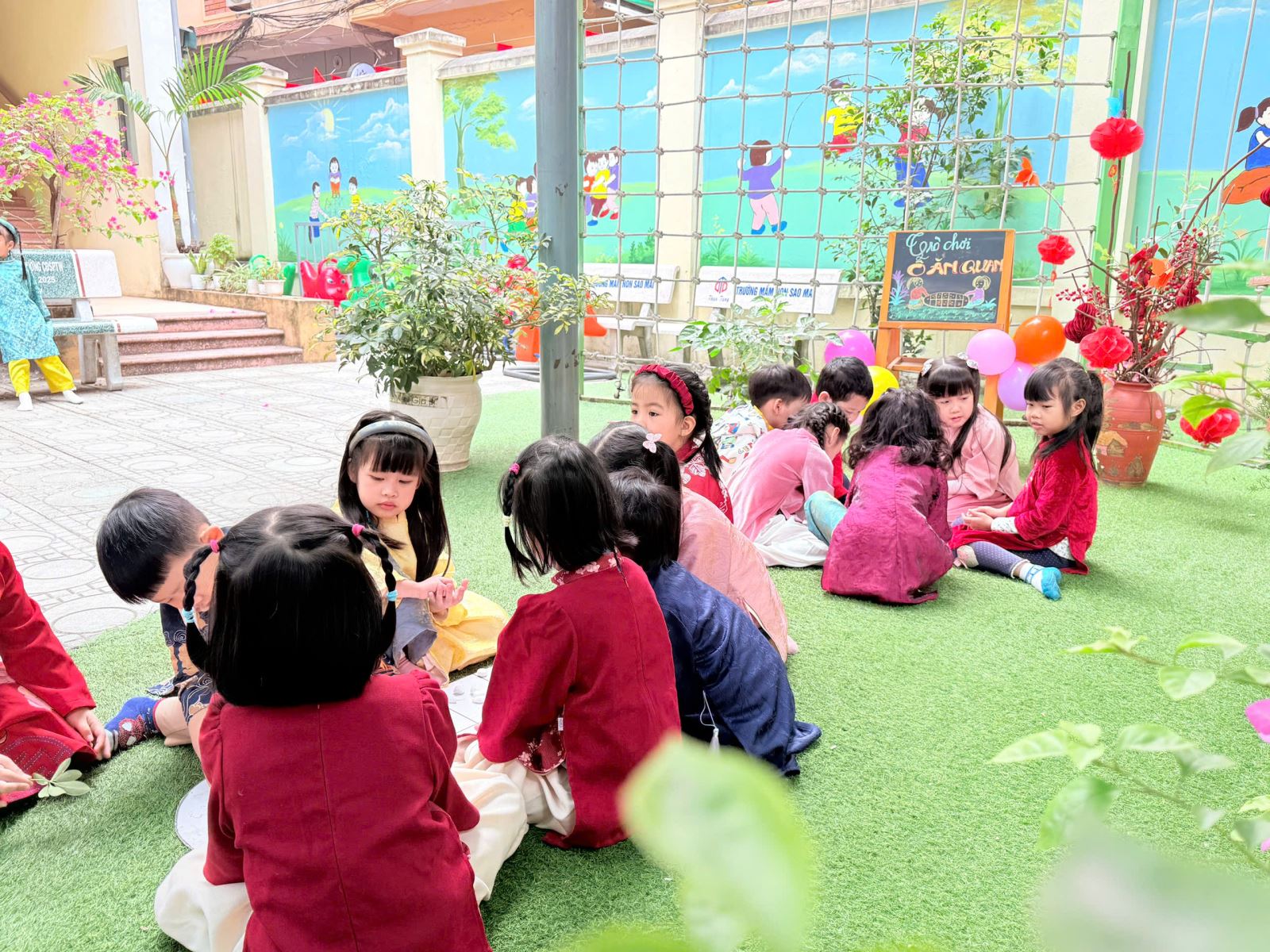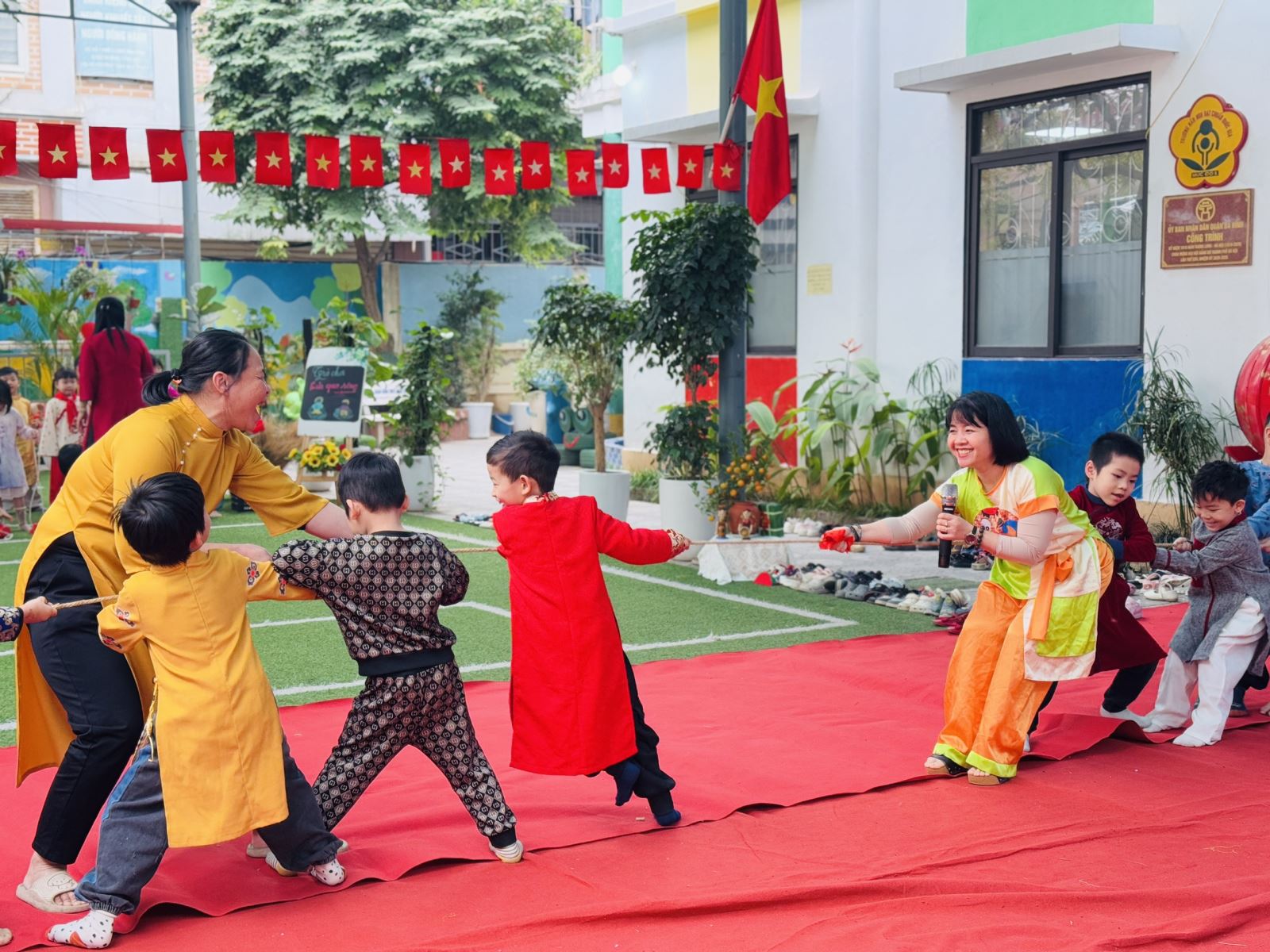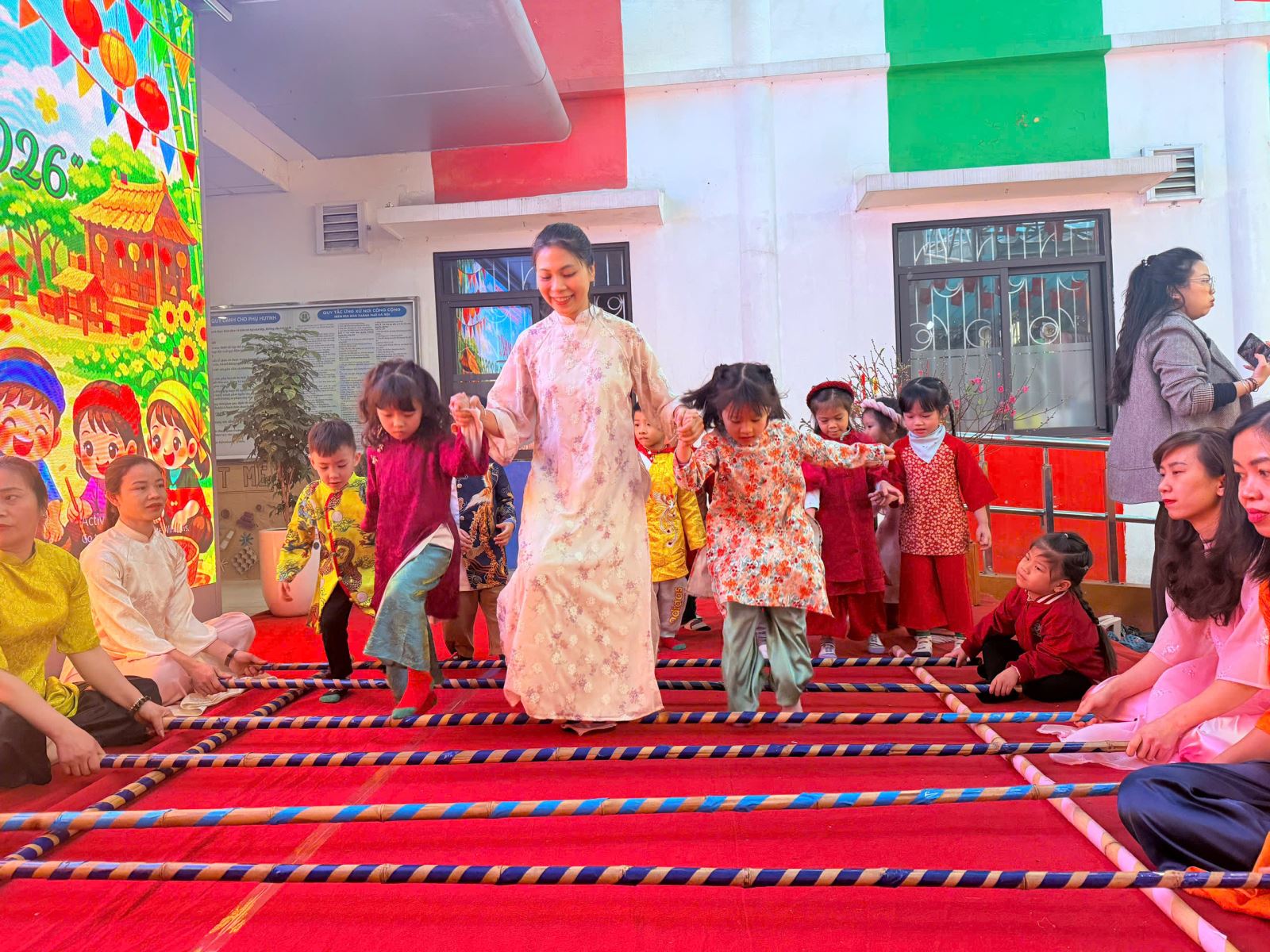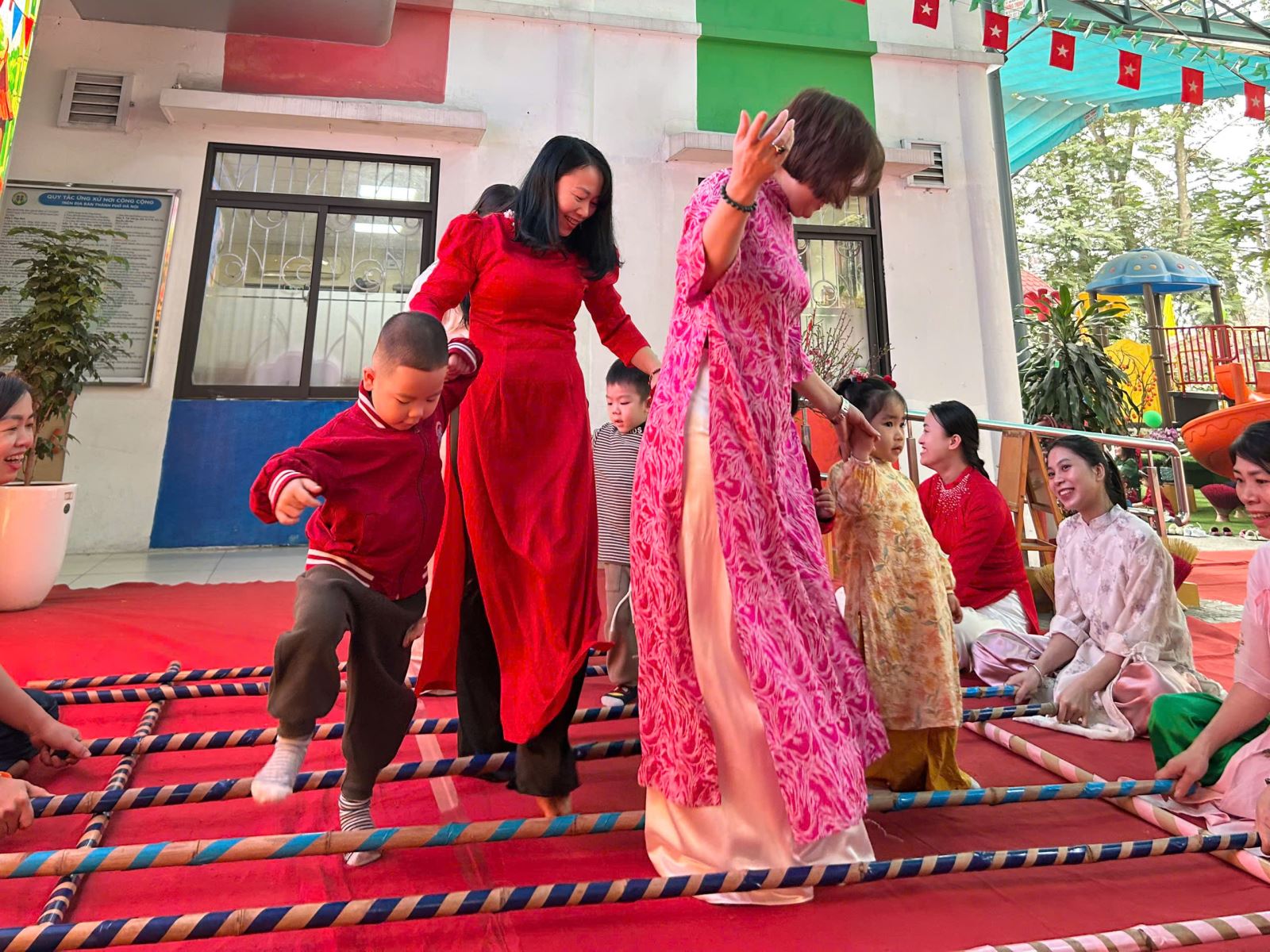 Sau đó các bé được tham gia nhiều trò chơi dân gian quen thuộc, phù hợp với lứa tuổi mầm non như: nhảy bao bố, kéo co, ếch qua sông, gắp cua bỏ giỏ, đi cà kheo, ô ăn quan, nhảy sạp… Mỗi trò chơi đều được tổ chức khoa học, đảm bảo an toàn, tạo điều kiện để trẻ mạnh dạn tham gia, tự tin thể hiện bản thân và phối hợp cùng bạn bè.