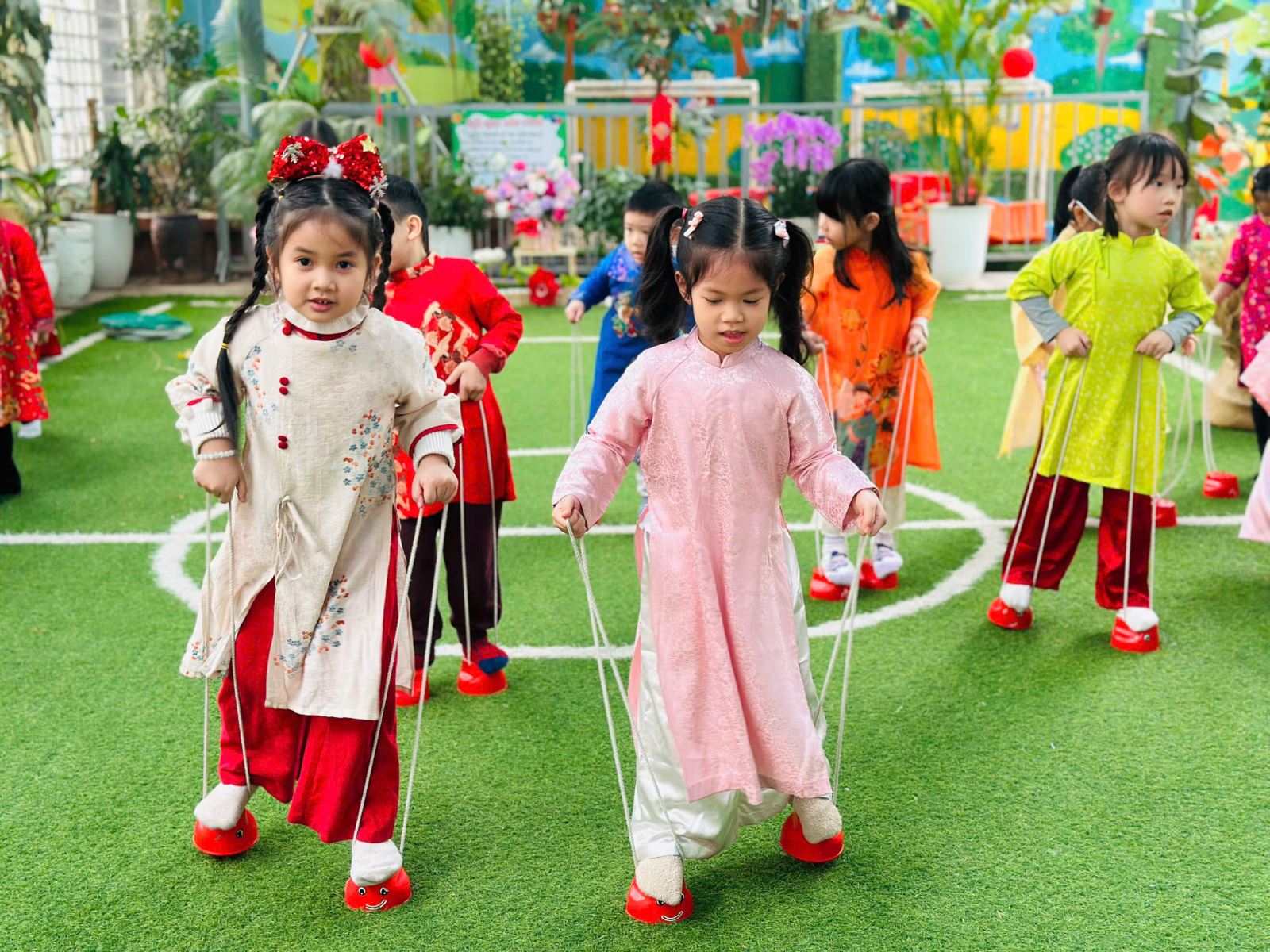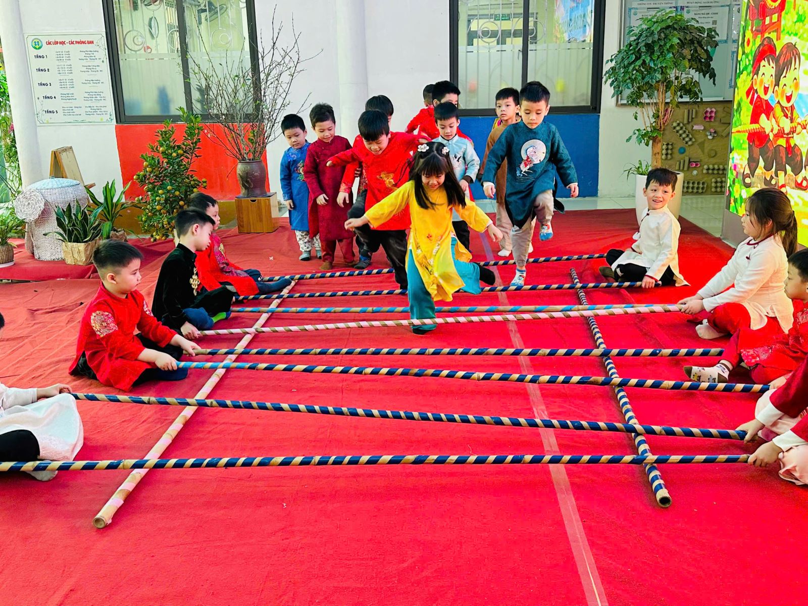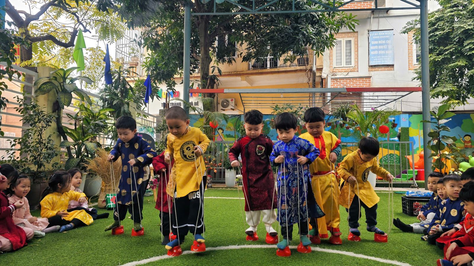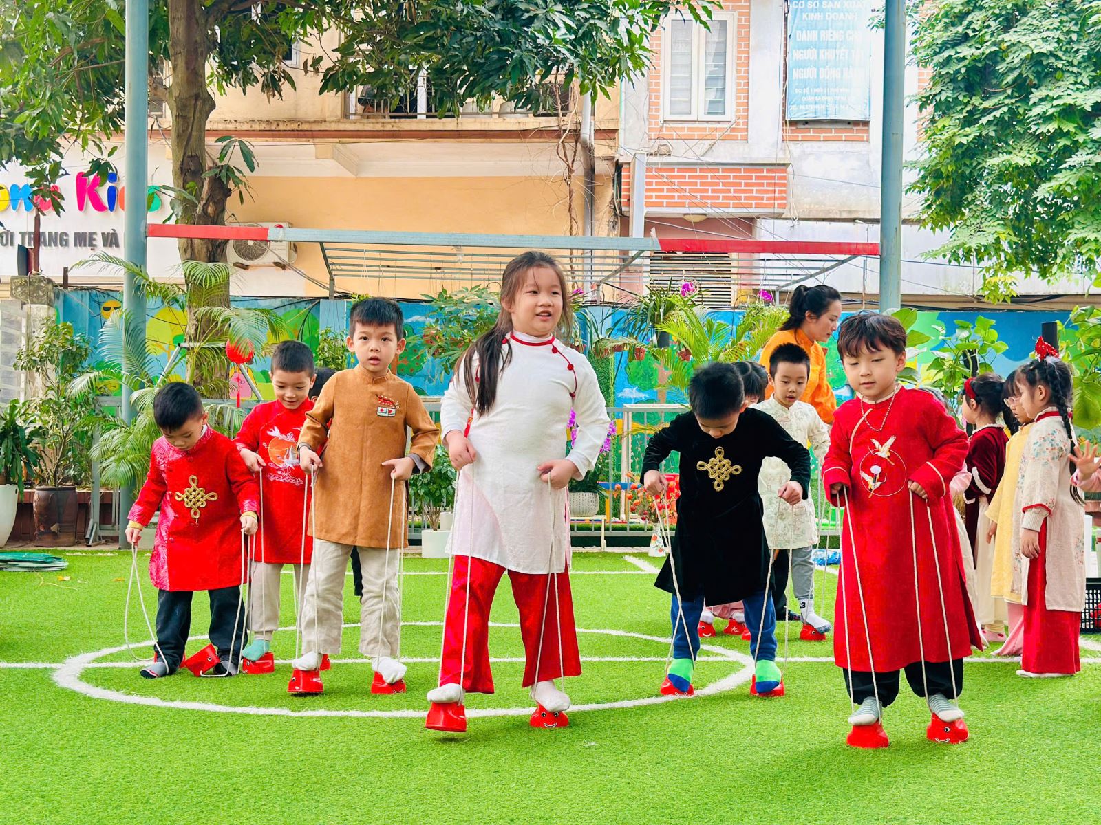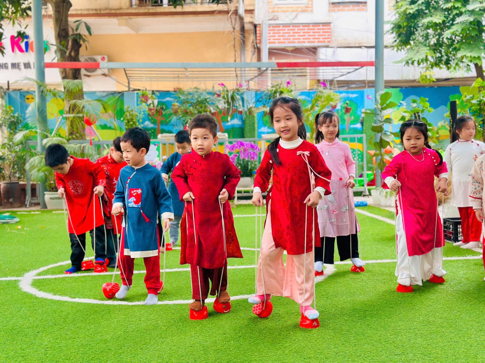 Sau đó các bé được tham gia nhiều trò chơi dân gian quen thuộc, phù hợp với lứa tuổi mầm non như: nhảy bao bố, kéo co, ếch qua sông, gắp cua bỏ giỏ, đi cà kheo, ô ăn quan, nhảy sạp… Mỗi trò chơi đều được tổ chức khoa học, đảm bảo an toàn, tạo điều kiện để trẻ mạnh dạn tham gia, tự tin thể hiện bản thân và phối hợp cùng bạn bè.
