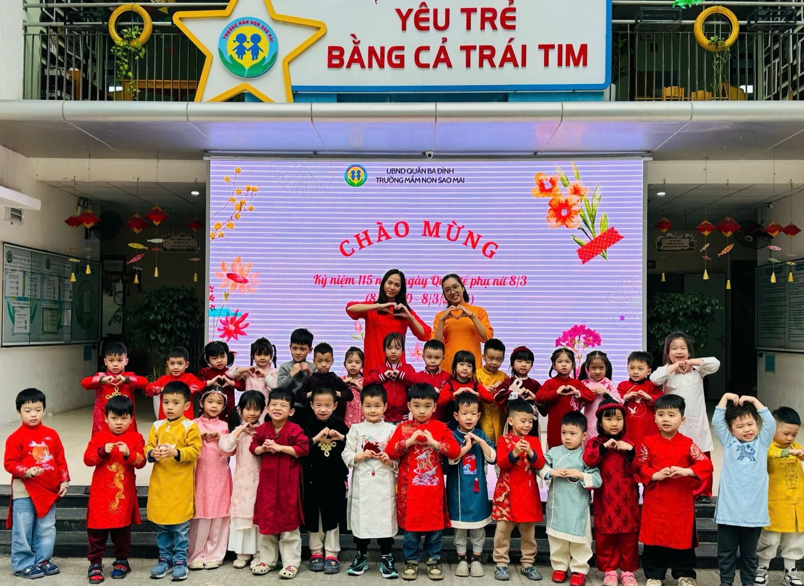 Hưởng ứng “Tuần lễ Áo dài” do Liên đoàn Lao động quận Ba Đình phát động, Trường mầm non Sao Mai đã phối hợp cùng Công đoàn nhà trường tổ chức nhiều hoạt động ý nghĩa nhằm tôn vinh vẻ đẹp của áo dài – biểu tượng văn hóa truyền thống của dân tộc, đồng thời chào mừng kỷ niệm 115 năm ngày Quốc tế Phụ nữ 8/3, 1985 năm Khởi nghĩa Hai Bà Trưng và 60 năm phong trào “Ba đảm đang”.