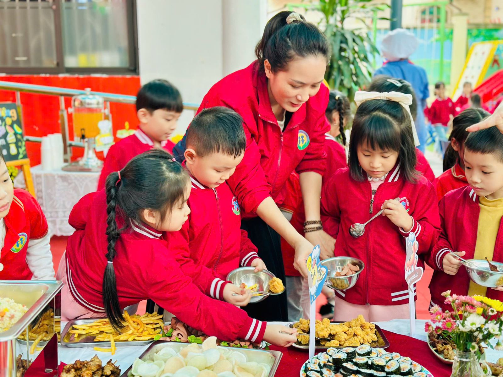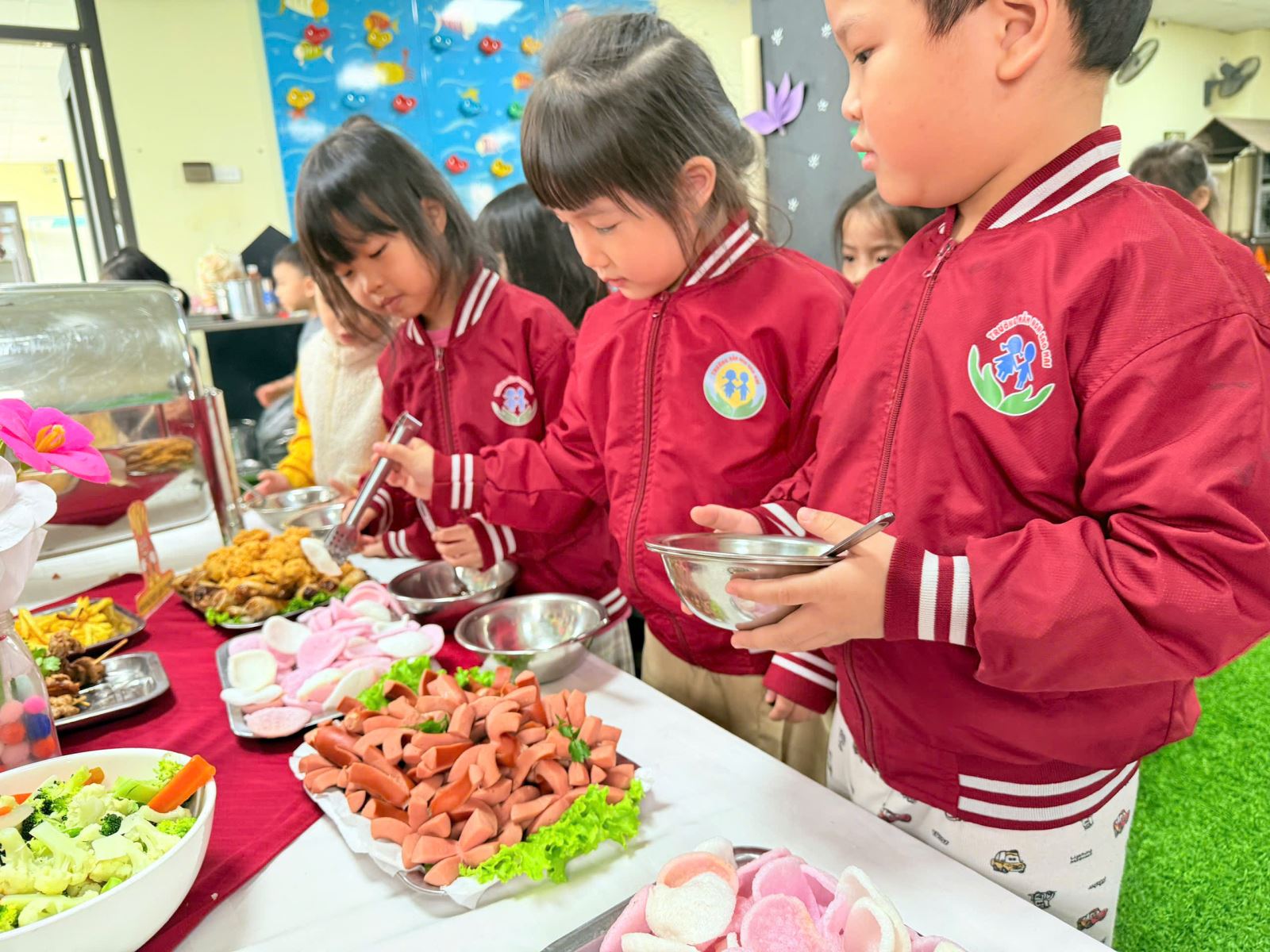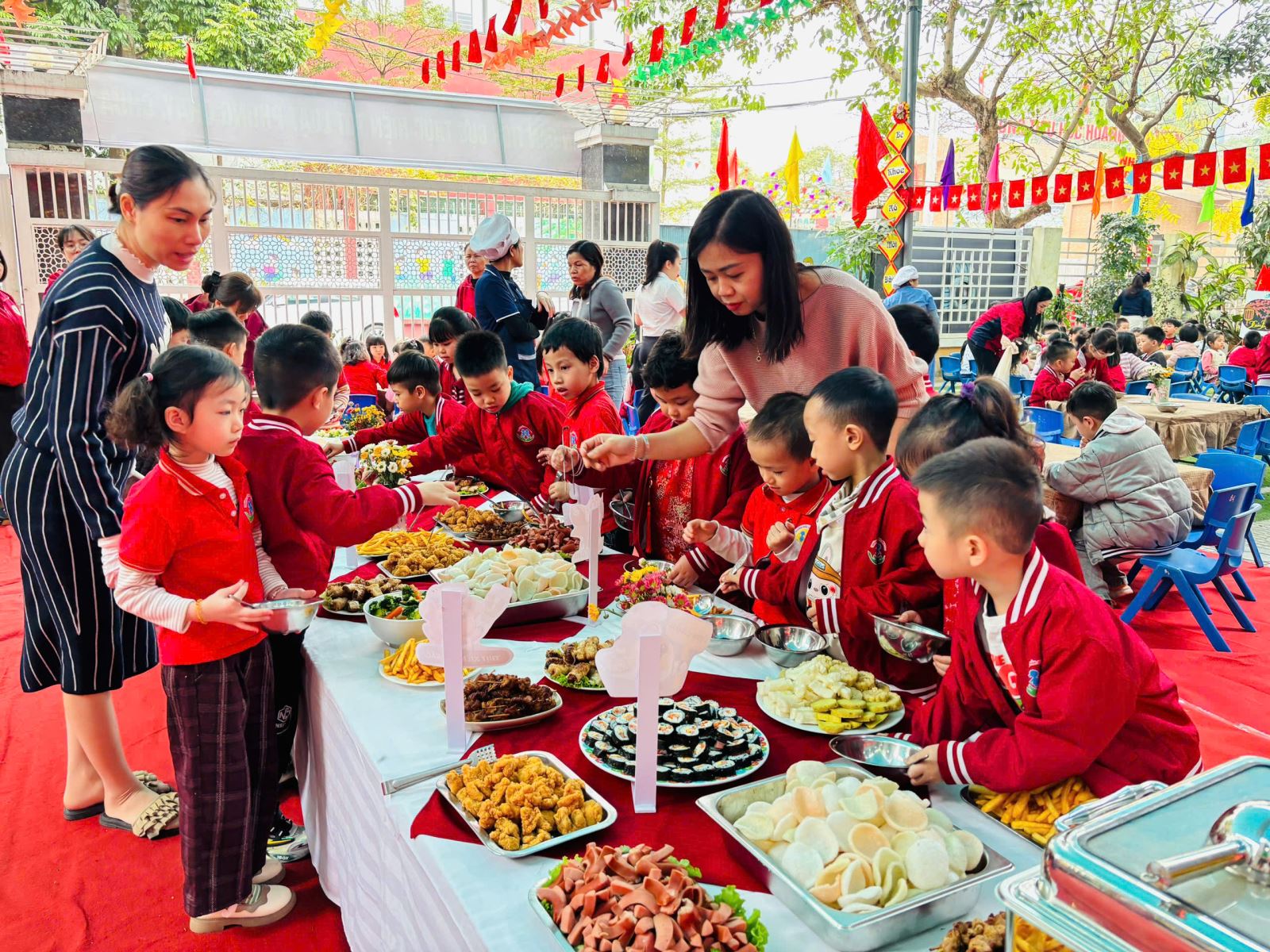 Bữa tiệc buffet được nhà trường chuẩn bị chu đáo với thực đơn phong phú, đa dạng, đảm bảo đầy đủ dinh dưỡng và phù hợp với lứa tuổi mầm non. Các món ăn quen thuộc được trình bày sinh động, đẹp mắt, tạo sự thích thú và hào hứng cho trẻ. Dưới sự hướng dẫn ân cần của các cô giáo, các bé được tự tay lựa chọn món ăn, biết xếp hàng ngay ngắn, lịch sự, cùng nhau thưởng thức bữa tiệc trong không khí vui tươi, thân thiện.