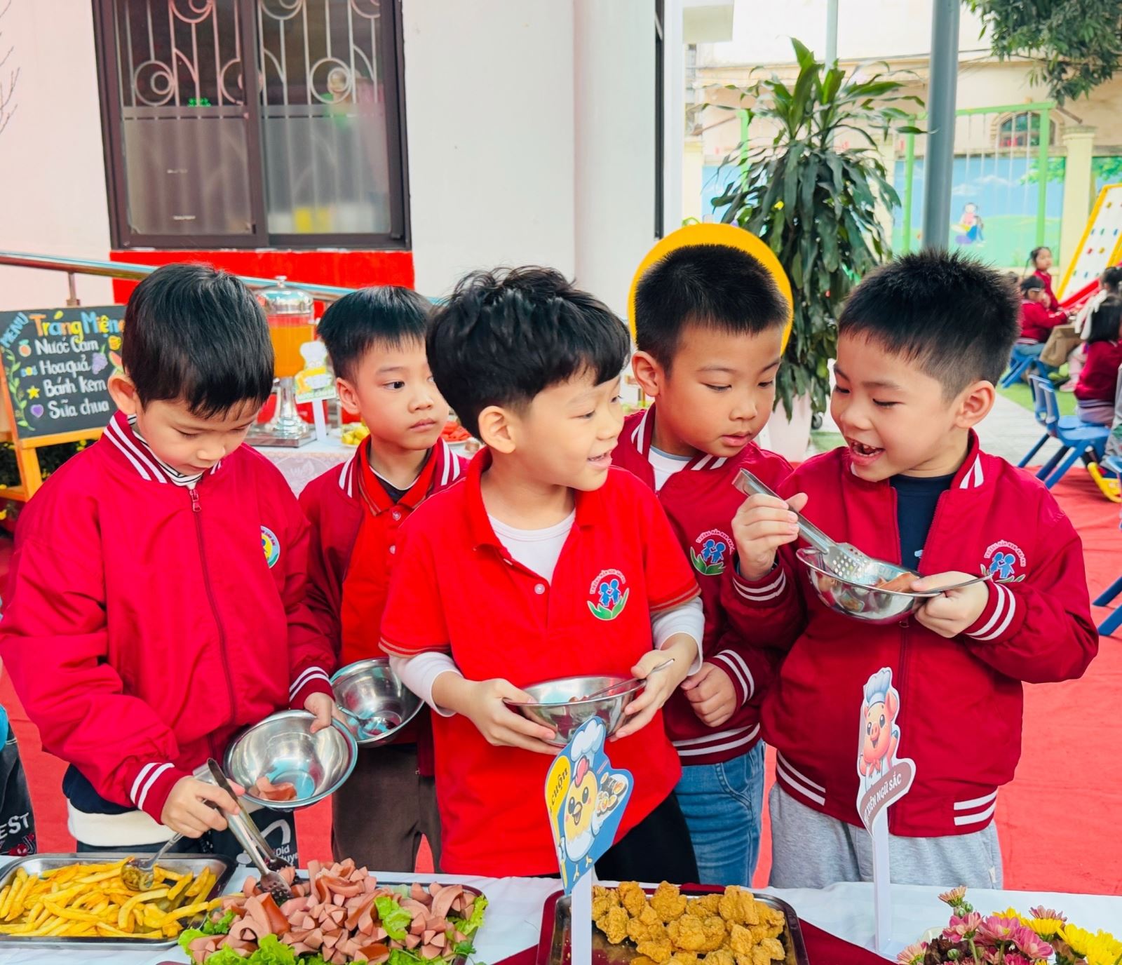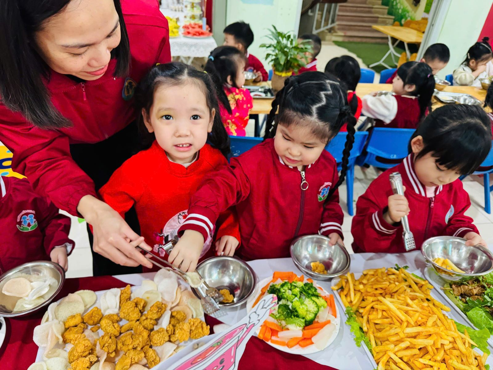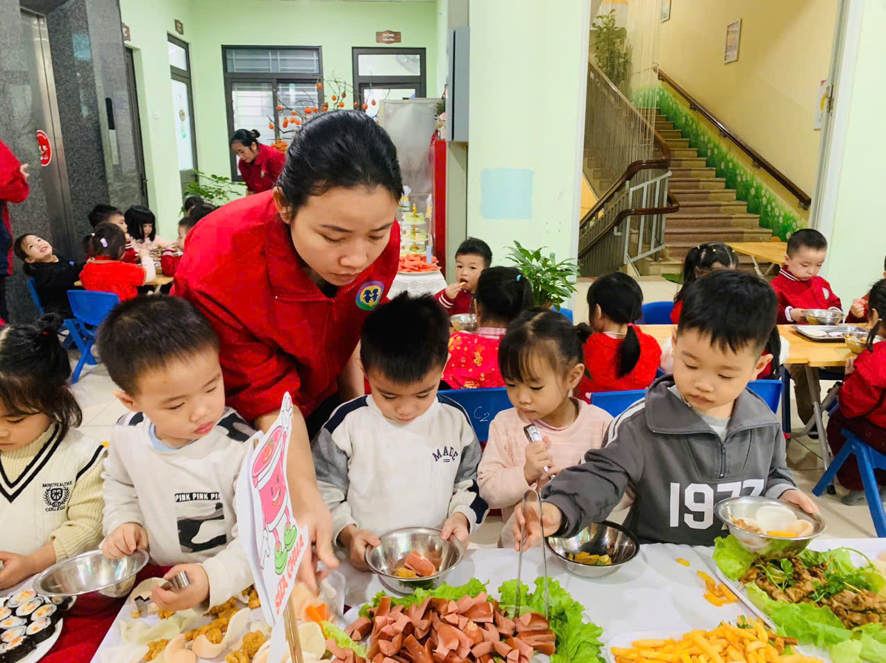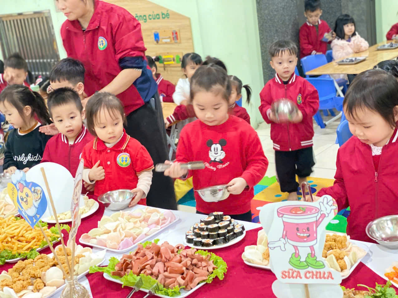 Bữa tiệc buffet được nhà trường chuẩn bị chu đáo với thực đơn phong phú, đa dạng, đảm bảo đầy đủ dinh dưỡng và phù hợp với lứa tuổi mầm non. Các món ăn quen thuộc được trình bày sinh động, đẹp mắt, tạo sự thích thú và hào hứng cho trẻ. Dưới sự hướng dẫn ân cần của các cô giáo, các bé được tự tay lựa chọn món ăn, biết xếp hàng ngay ngắn, lịch sự, cùng nhau thưởng thức bữa tiệc trong không khí vui tươi, thân thiện.