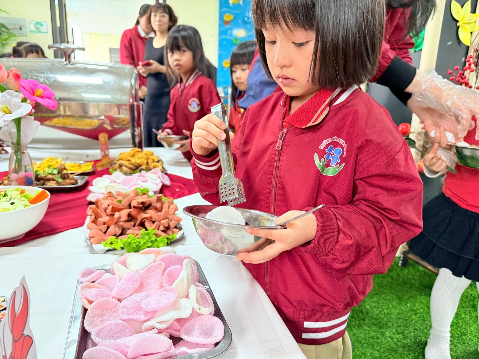 Từ sự háo hức hiện rõ trên từng gương mặt thơ ngây, bữa tiệc dần mở ra như một món quà đầu xuân. Những bàn ăn được chuẩn bị gọn gàng, xinh xắn; các món ăn quen thuộc trở nên hấp dẫn hơn bởi cách bày trí sinh động và đầy màu sắc. Trong sự dìu dắt ân cần của các cô giáo, các bé tự tin lựa chọn món ăn mình yêu thích, nhẹ nhàng xếp hàng, chờ đến lượt – những hành động nhỏ nhưng là bước đầu để các con học cách tự lập và cư xử văn minh. Không chỉ là một hoạt động chào xuân, tiệc buffet Xuân Bính Ngọ còn là dịp để trẻ được trải nghiệm và rèn luyện các kỹ năng sống cần thiết như: kỹ năng tự phục vụ, kỹ năng giao tiếp, biết chia sẻ, nhường nhịn bạn bè, giữ gìn vệ sinh và trân trọng giá trị của thực phẩm. Qua đó, trẻ thêm mạnh dạn, tự tin, hình thành nếp sống văn minh ngay từ những năm đầu đời.