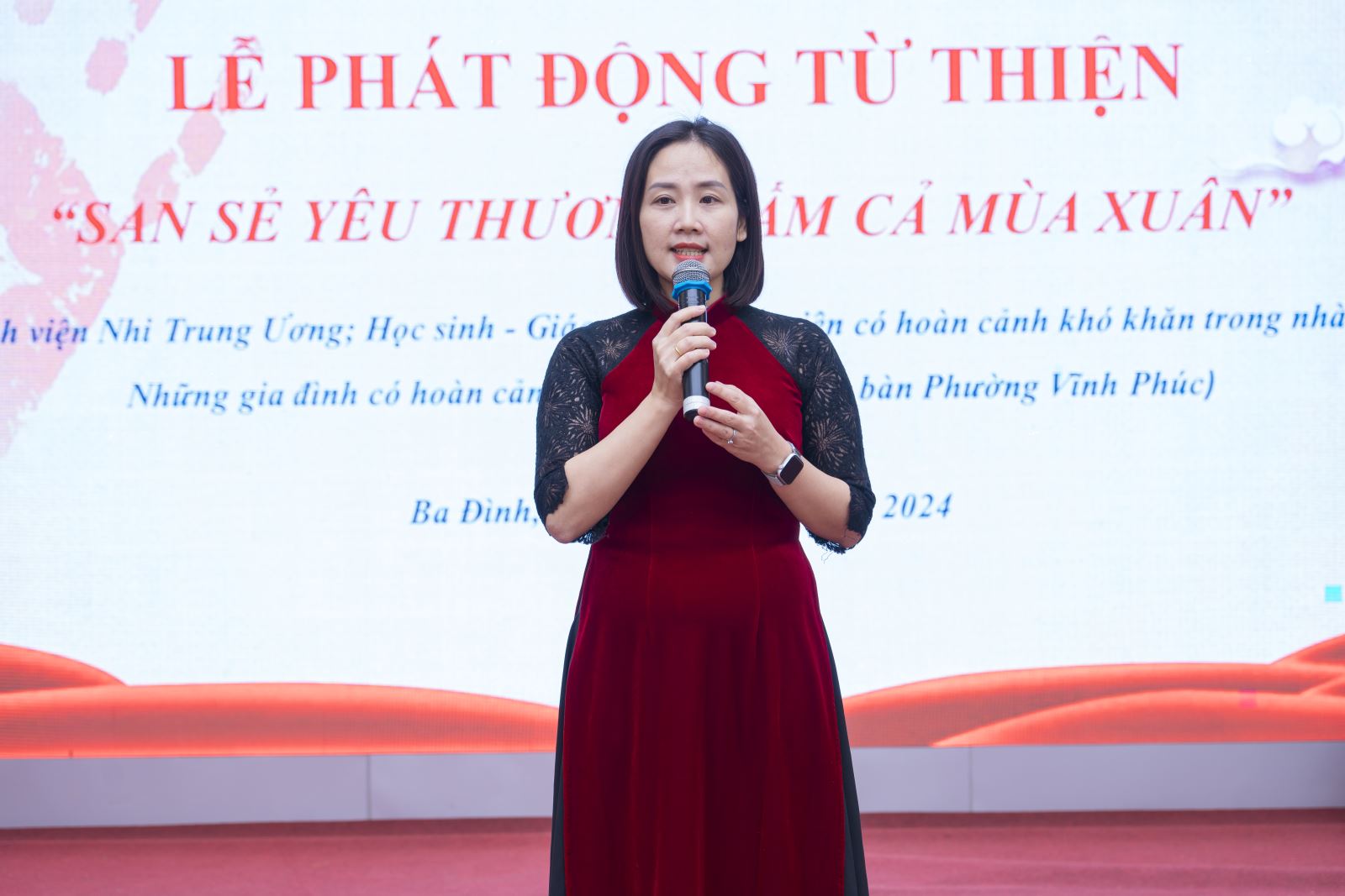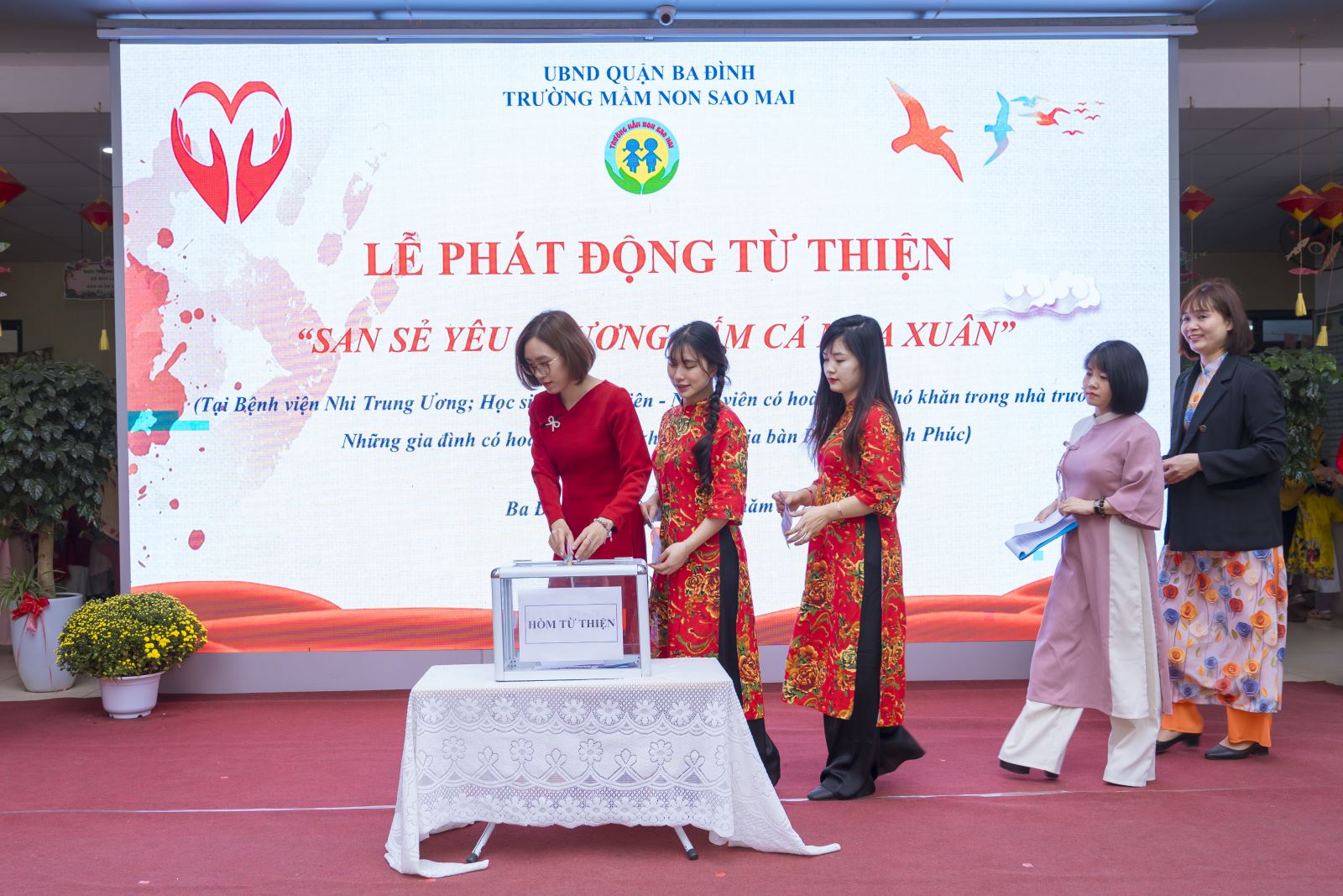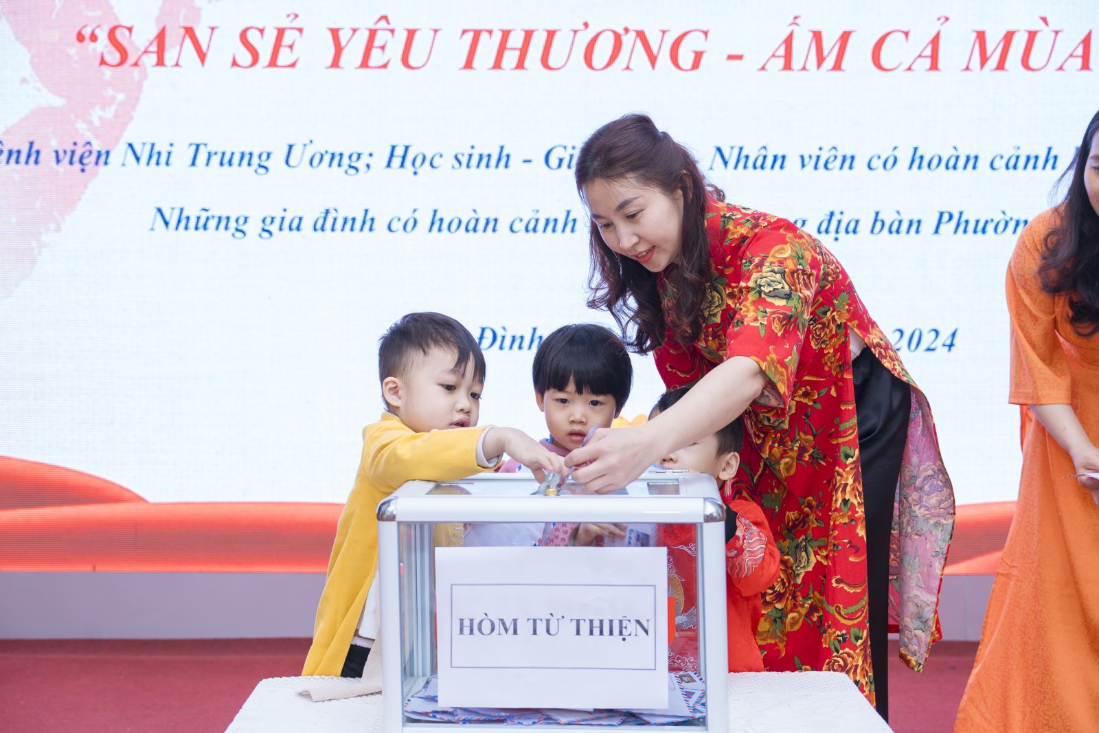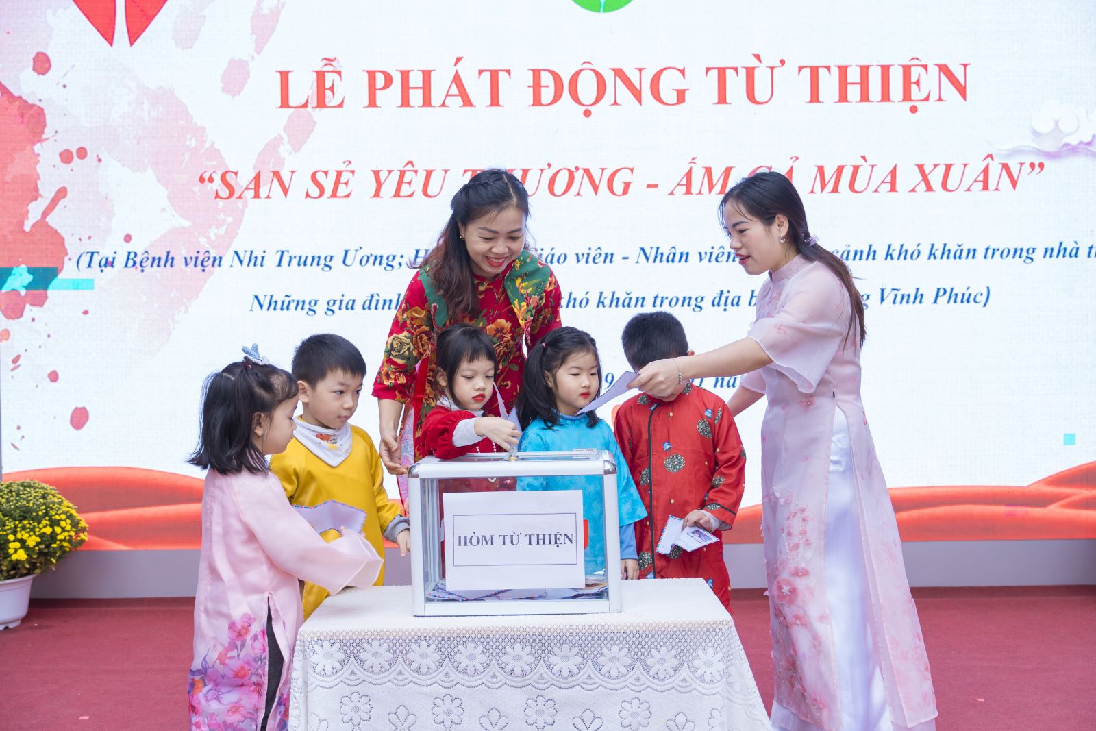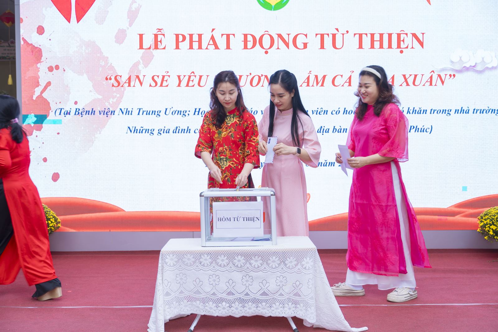 Hiệu trưởng nhà trường cũng cho biết, trong buổi lễ, nhà trường cũng đã phát động chương trình “san sẻ yêu thương - Ấm cả mùa xuân” nhằm gây quỹ từ thiện đến với trẻ em và gia đình cán bộ, giáo viên nhân viên Nhà trường có hoàn cảnh khó khăn, gia đình có hoàn cảnh khó khăn trên địa bàn phường Vĩnh Phúc, trẻ mắc bệnh hiểm nghèo tại Viện Nhi TW. Nhà trường cũng tổ chức chuỗi các sự kiện chào mừng Xuân Ất Tỵ năm 2025 với rất nhiều hoạt động lý thú, bổ ích và ý nghĩa.