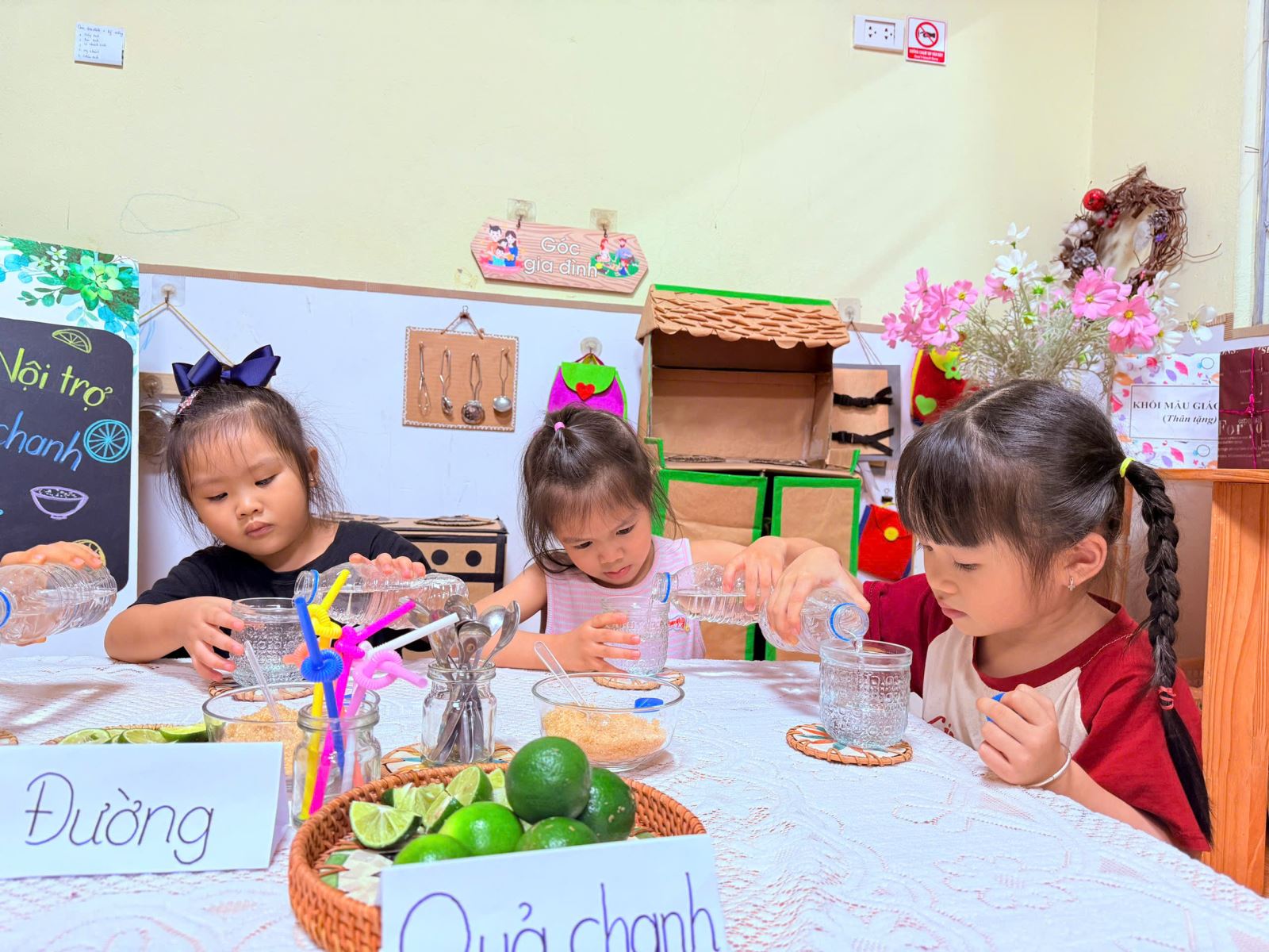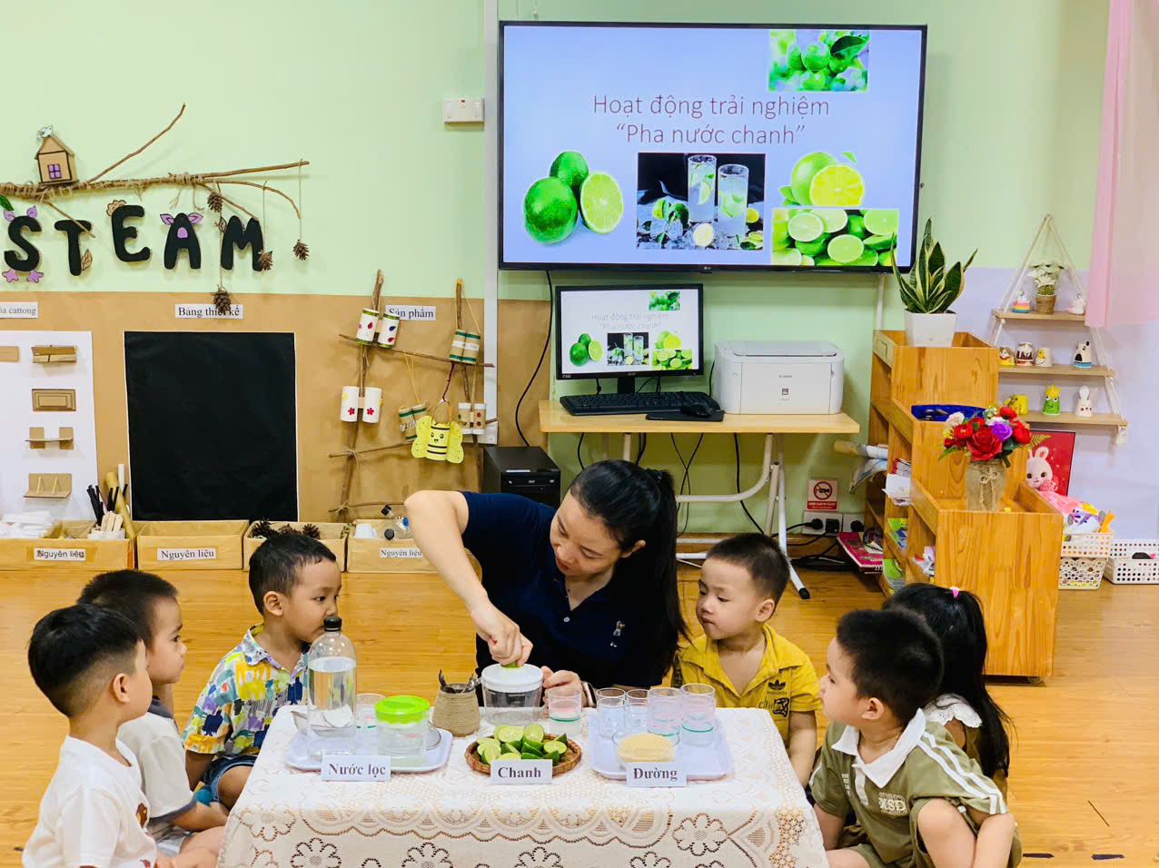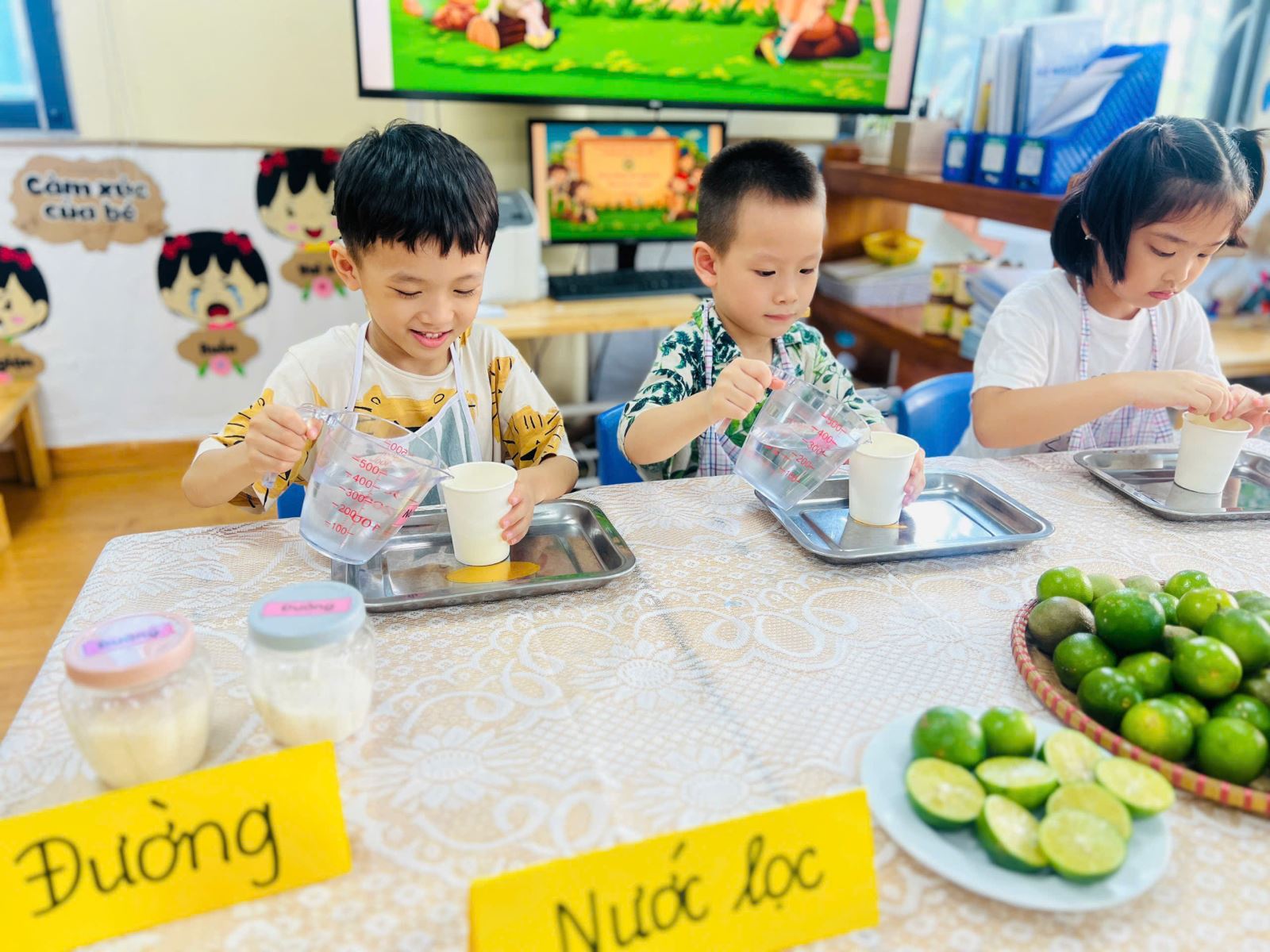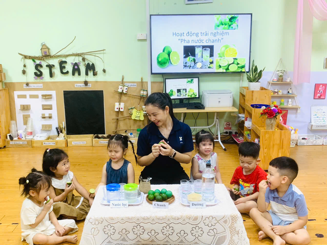 Các bé được tựu tay chuẩn bị nguyên liệu, quan sát sự thay đổi khi nước chanh hòa quyện với đường và nước, nếm thử hương vị chua ngọt hài hòa