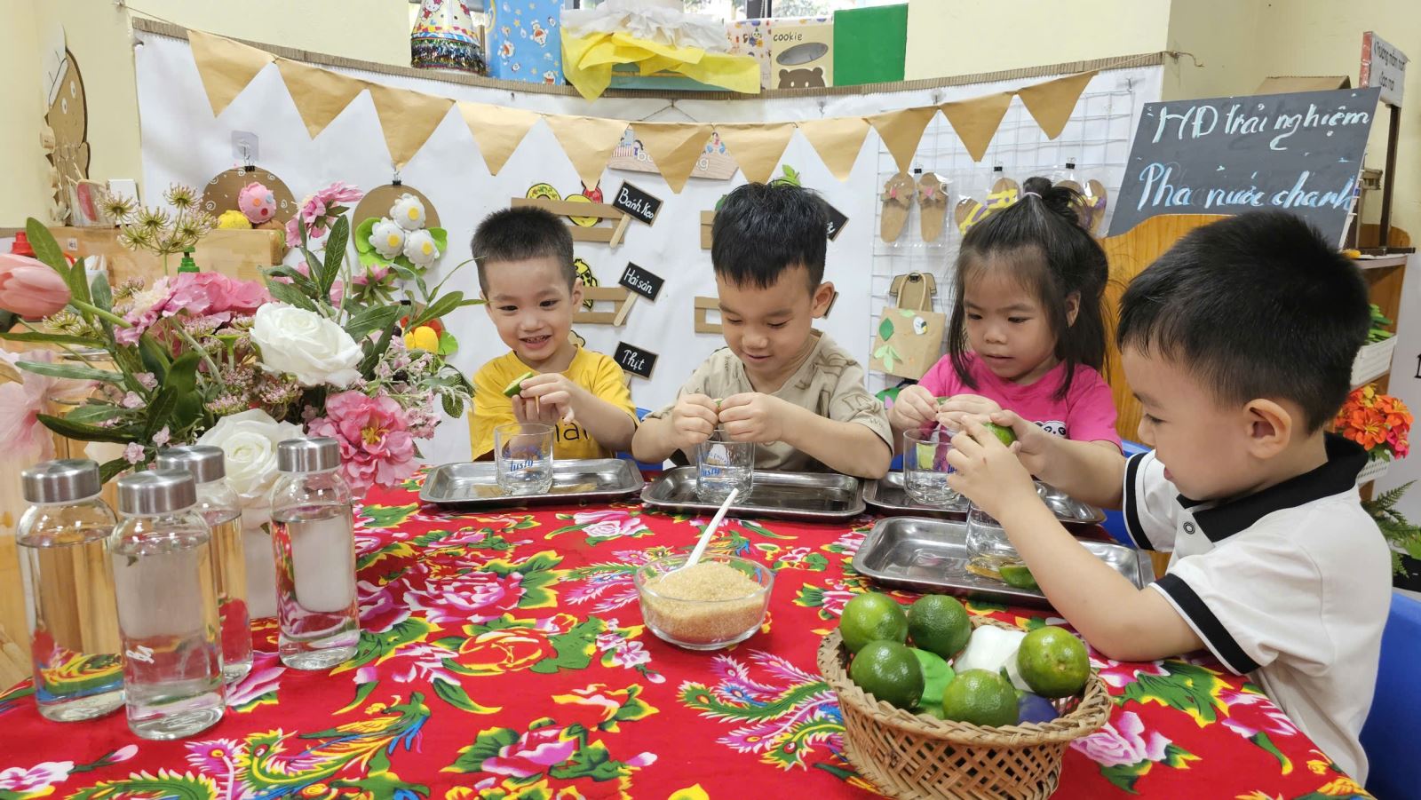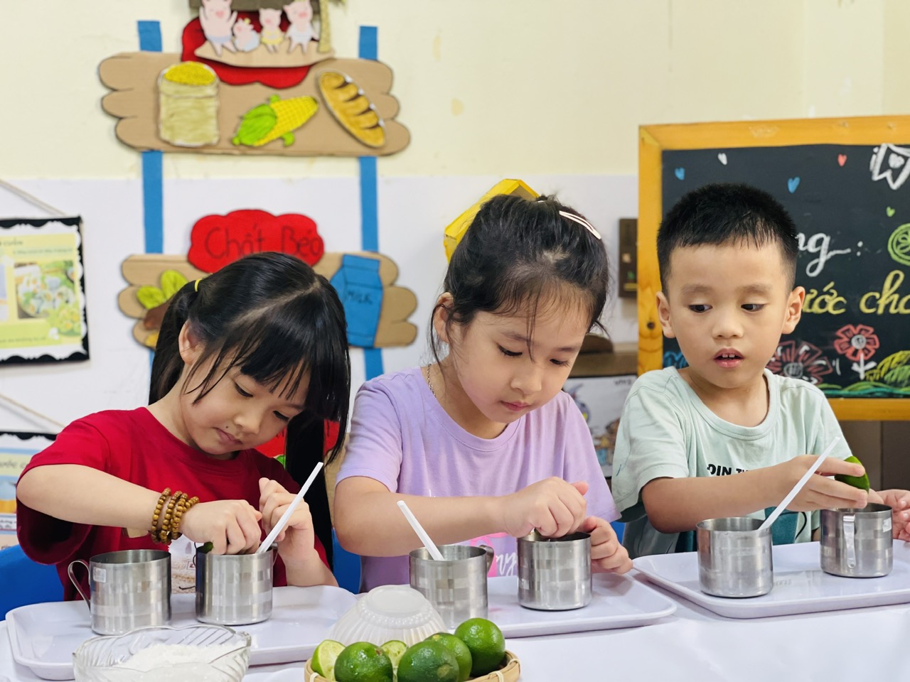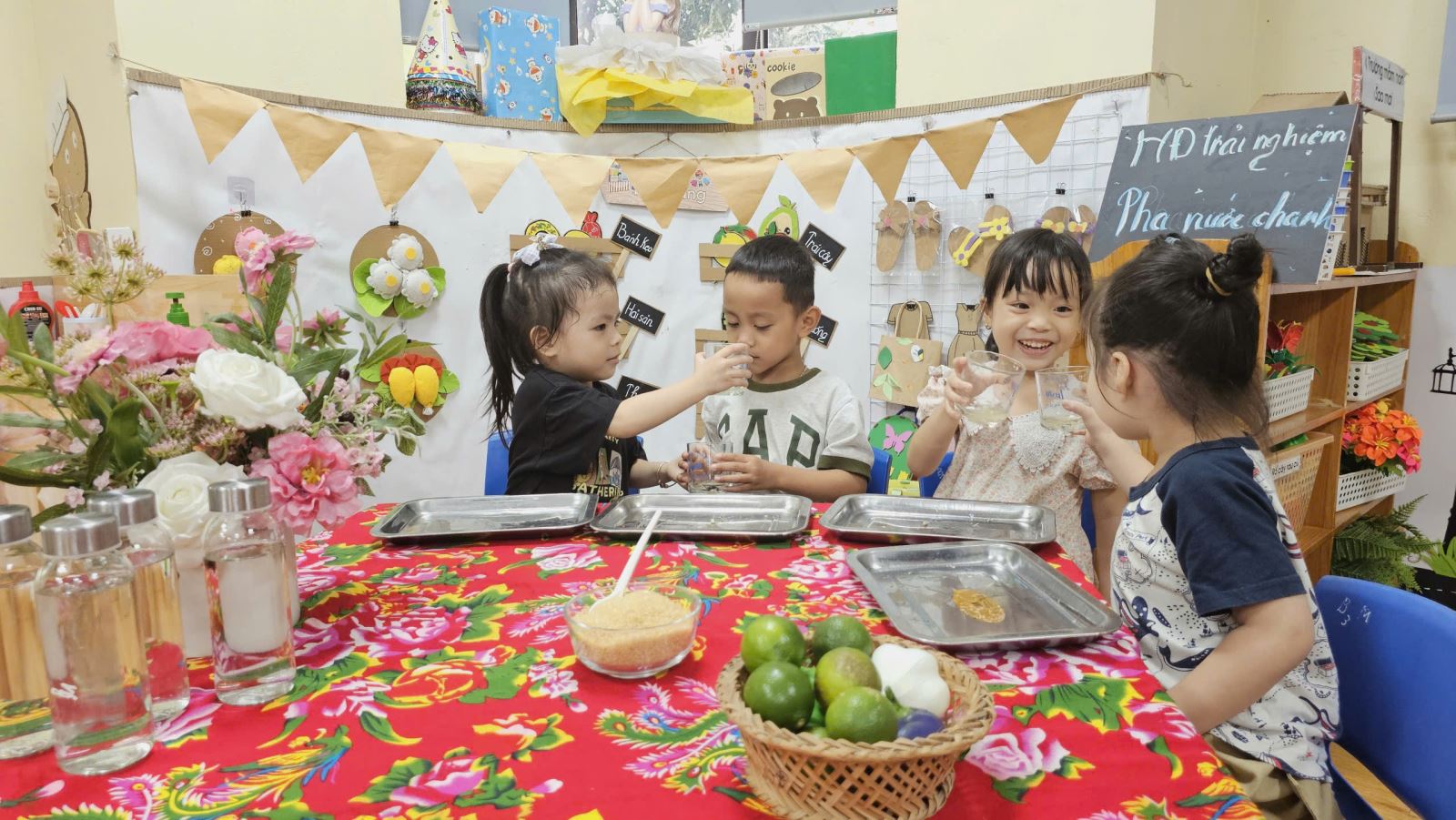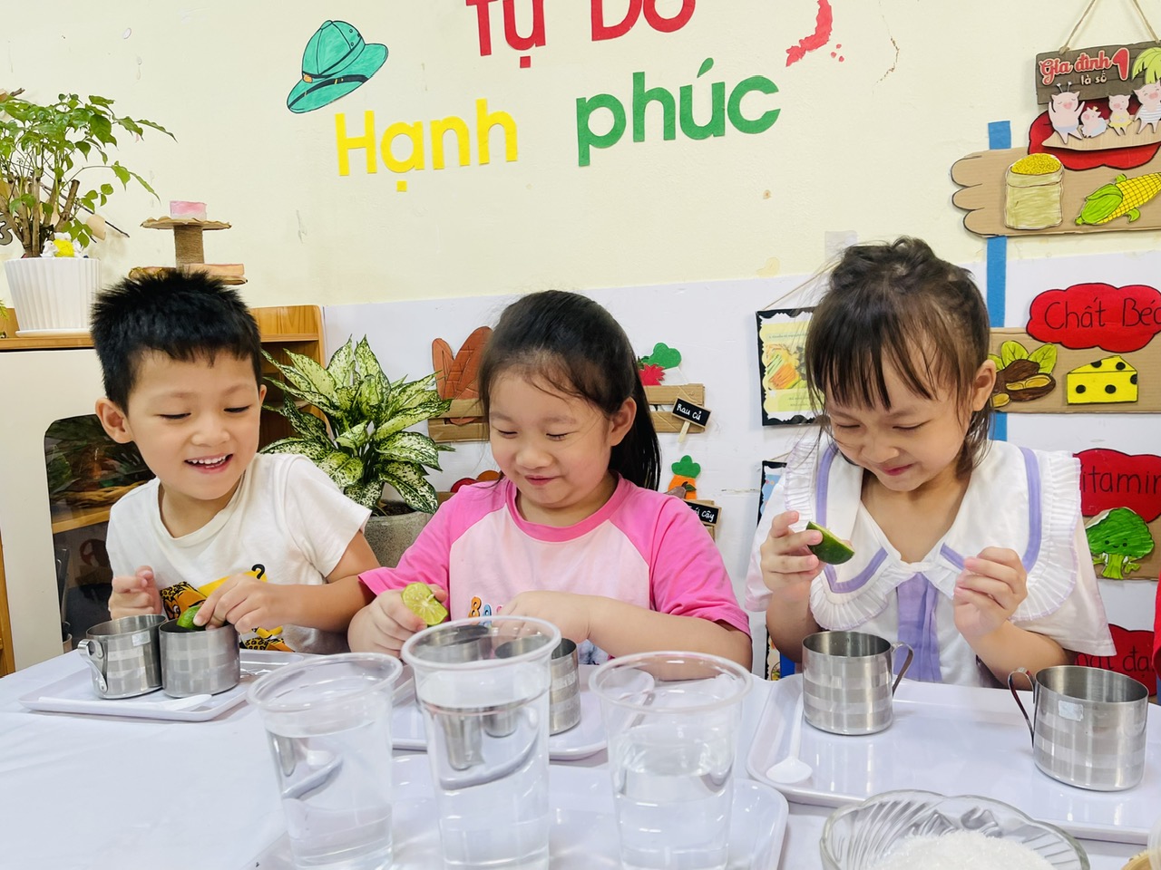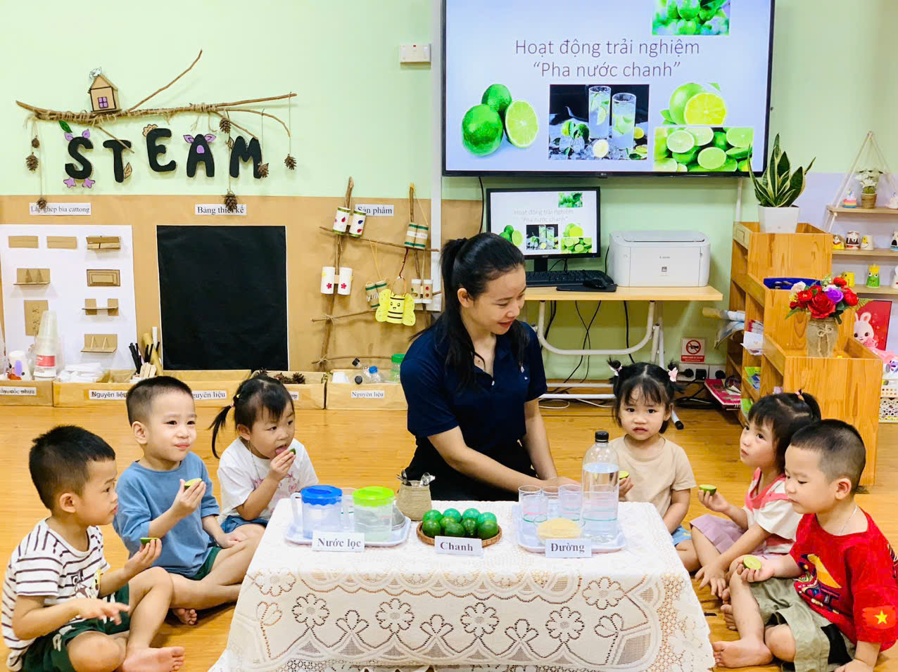 Các bé được tựu tay chuẩn bị nguyên liệu, quan sát sự thay đổi khi nước chanh hòa quyện với đường và nước, nếm thử hương vị chua ngọt hài hòa