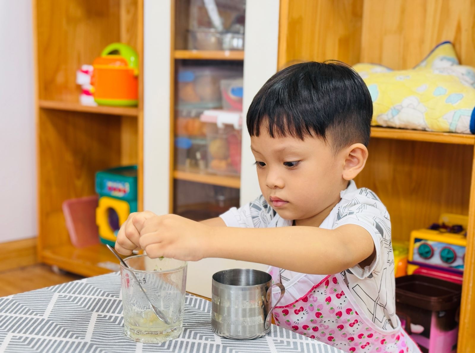 🍋Với các bé Mẫu giáo bé, đây là lần đầu tiên được cầm muỗng khuấy nước, học cách cẩn thận để không làm đổ.