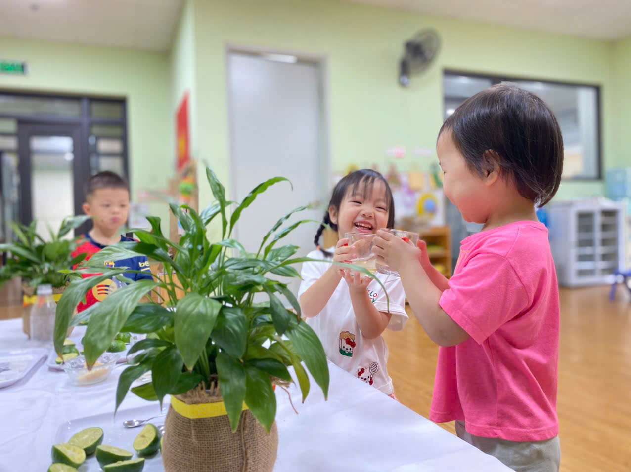 🍋 Còn các anh chị Mẫu giáo lớn lại khéo léo trong từng thao tác, biết chia sẻ phần nước chanh mình pha cho bạn cùng lớp – một hành động nhỏ mà chứa đựng tinh thần sẻ chia, yêu thương.