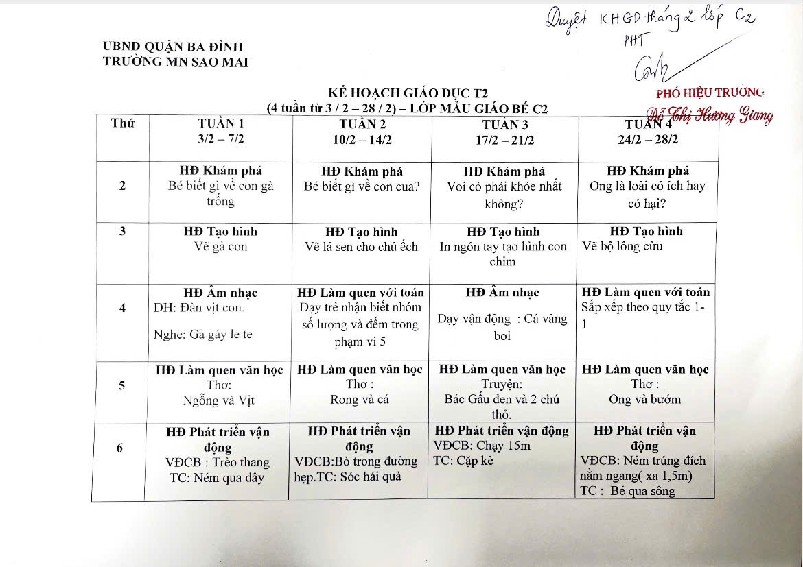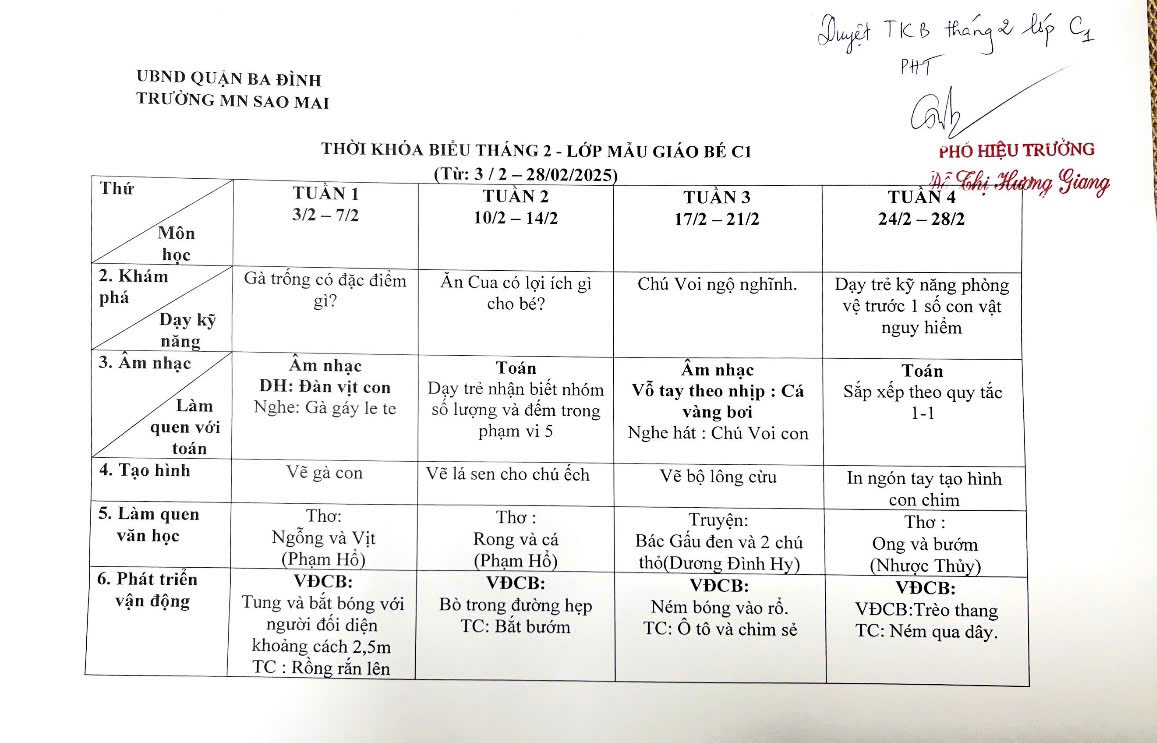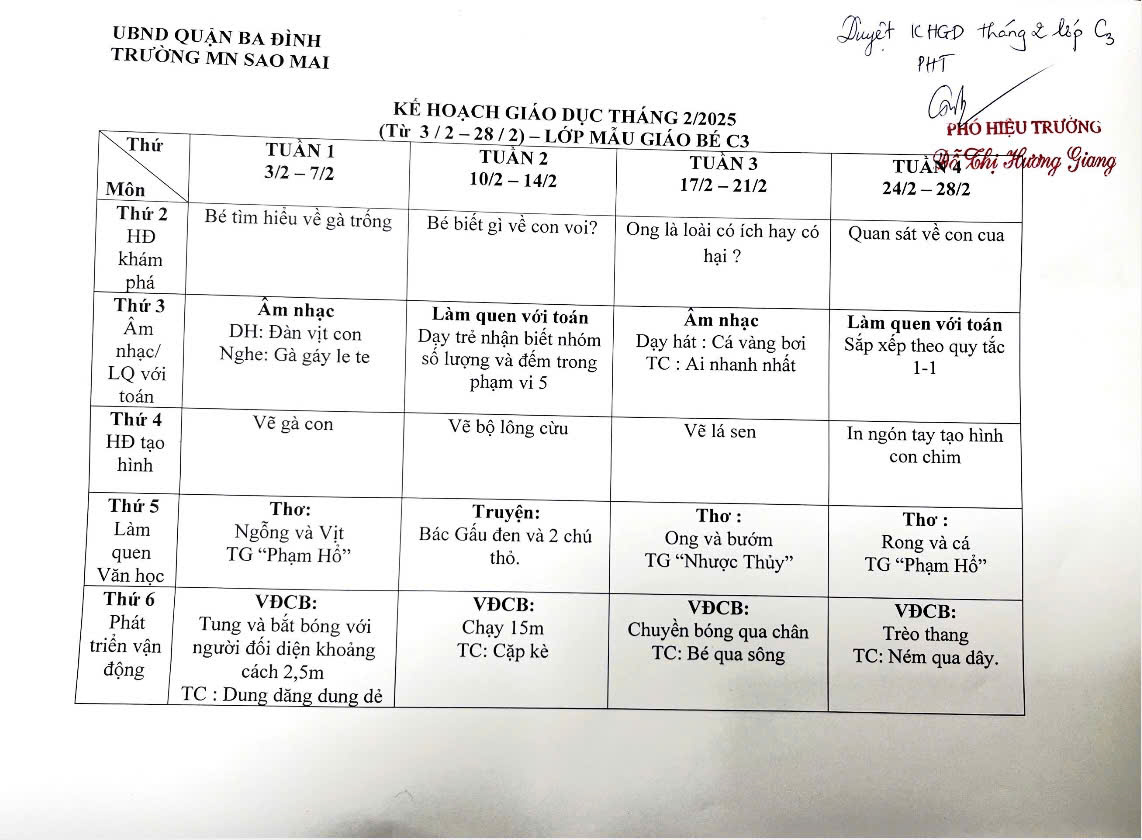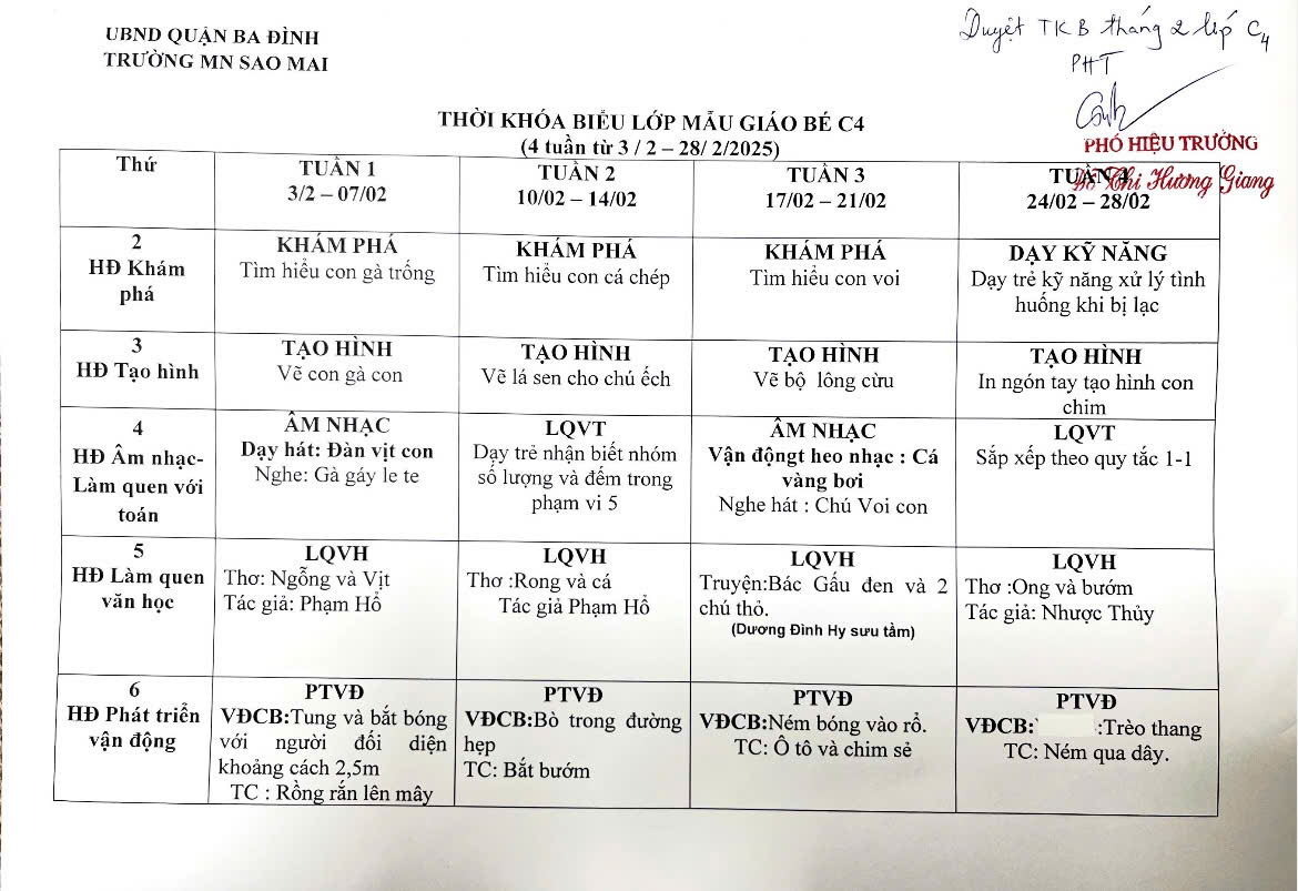 Thời khóa biểu tháng 02/2025 khối Mẫu giáo bé.