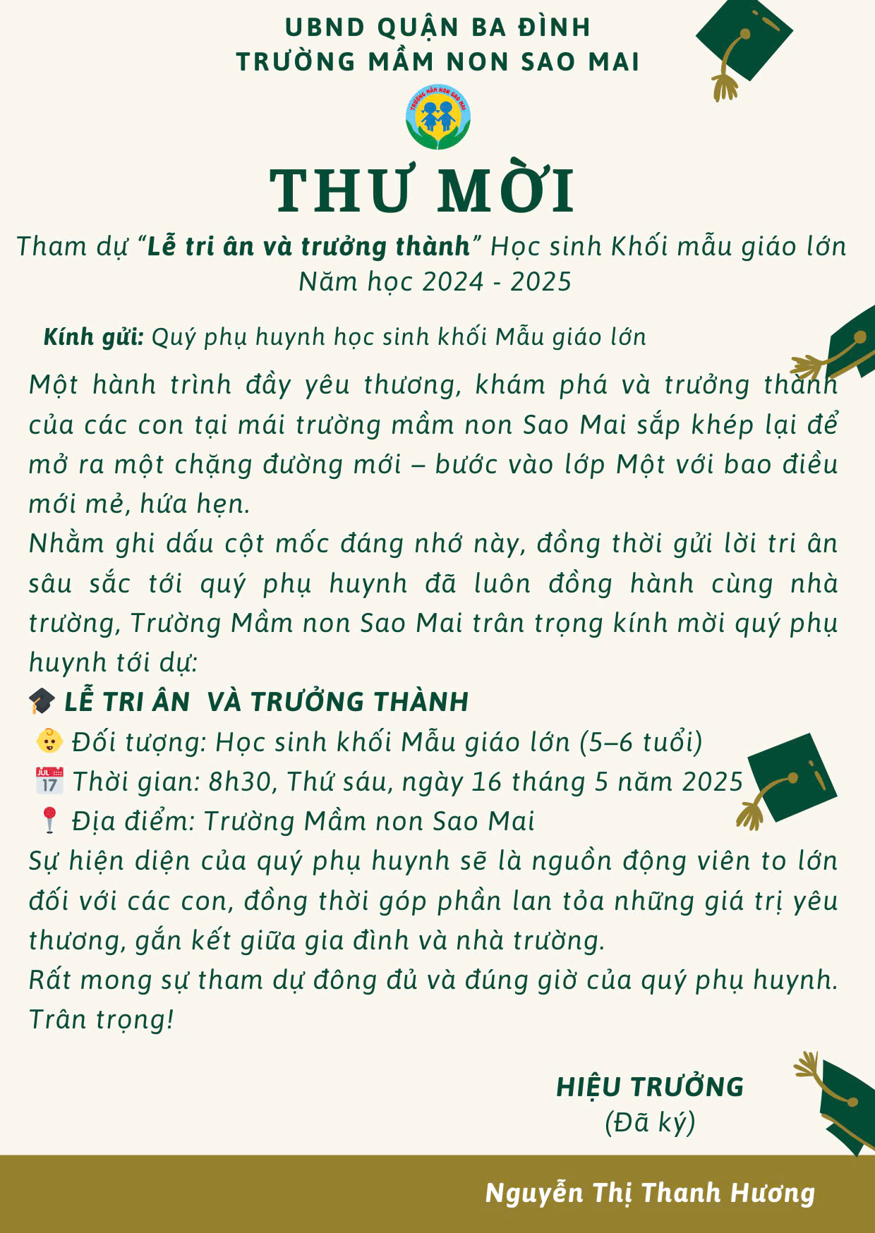 Thông báo chương trình "Lễ Tri ân và trưởng thành" học sinh khối mẫu giáo lớn năm học 2024 - 2025 của trường mầm non Sao Mai