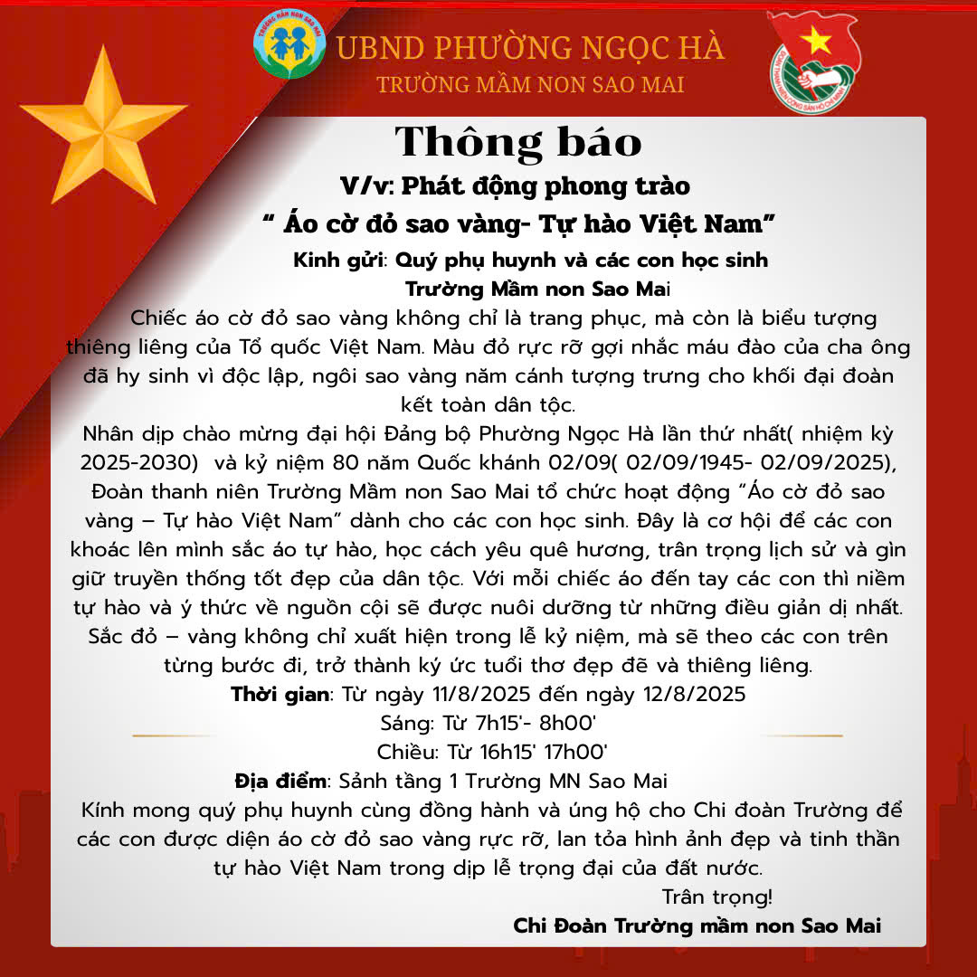 Thông báo phát động phong trào " Áo cờ đỏ sao vàng - Tự hào Việt Nam" của Chi Đoàn Trường mầm non Sao Mai.