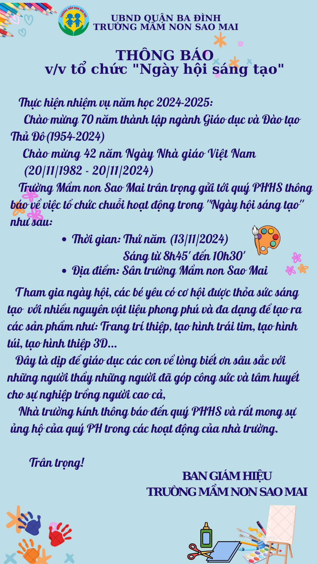 Trường Mầm non Sao Mai trân trọng gửi tới quý phụ huynh thông báo về việc tổ chức "Ngày hội sáng tạo" chào mừng 70 năm thành lập Ngành Giáo dục & Đào tạo Thủ đô (1954-2024) và 42 năm ngày Nhà giáo Việt Nam (20/11/1982 - 20/11/2024)