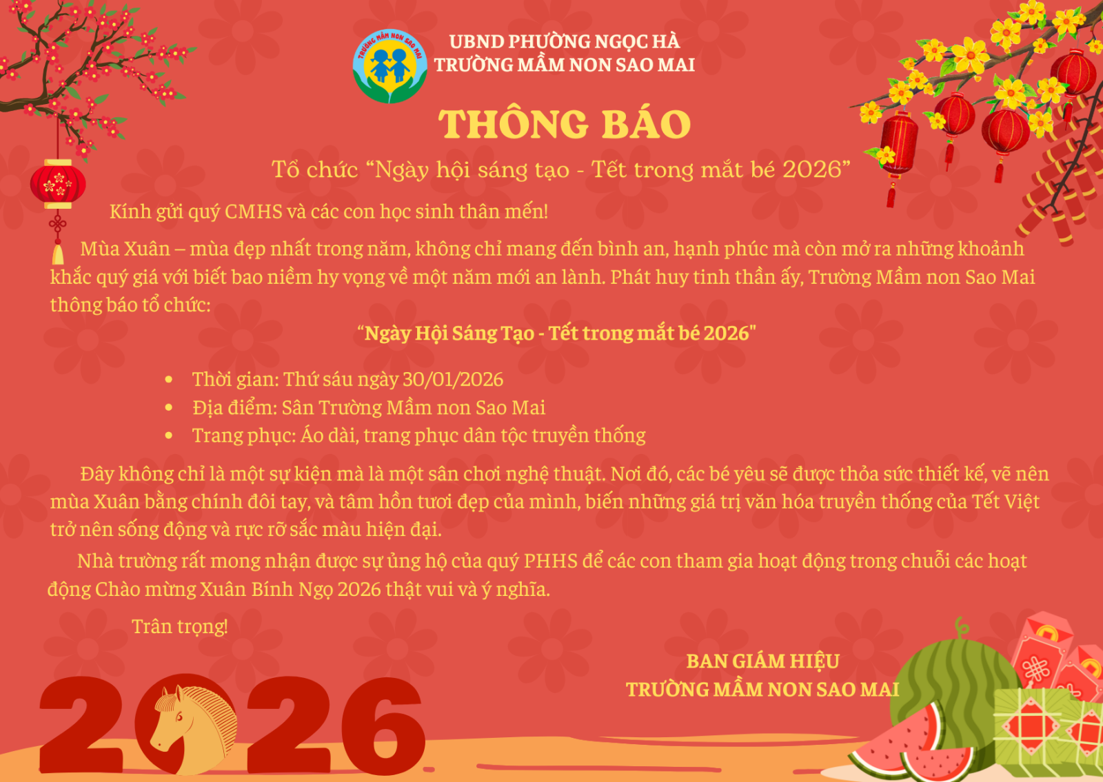 Thông báo tổ chức "Ngày hội sáng tạo - Tết trong mắt bé 2026" của Trường Mầm non Sao Mai