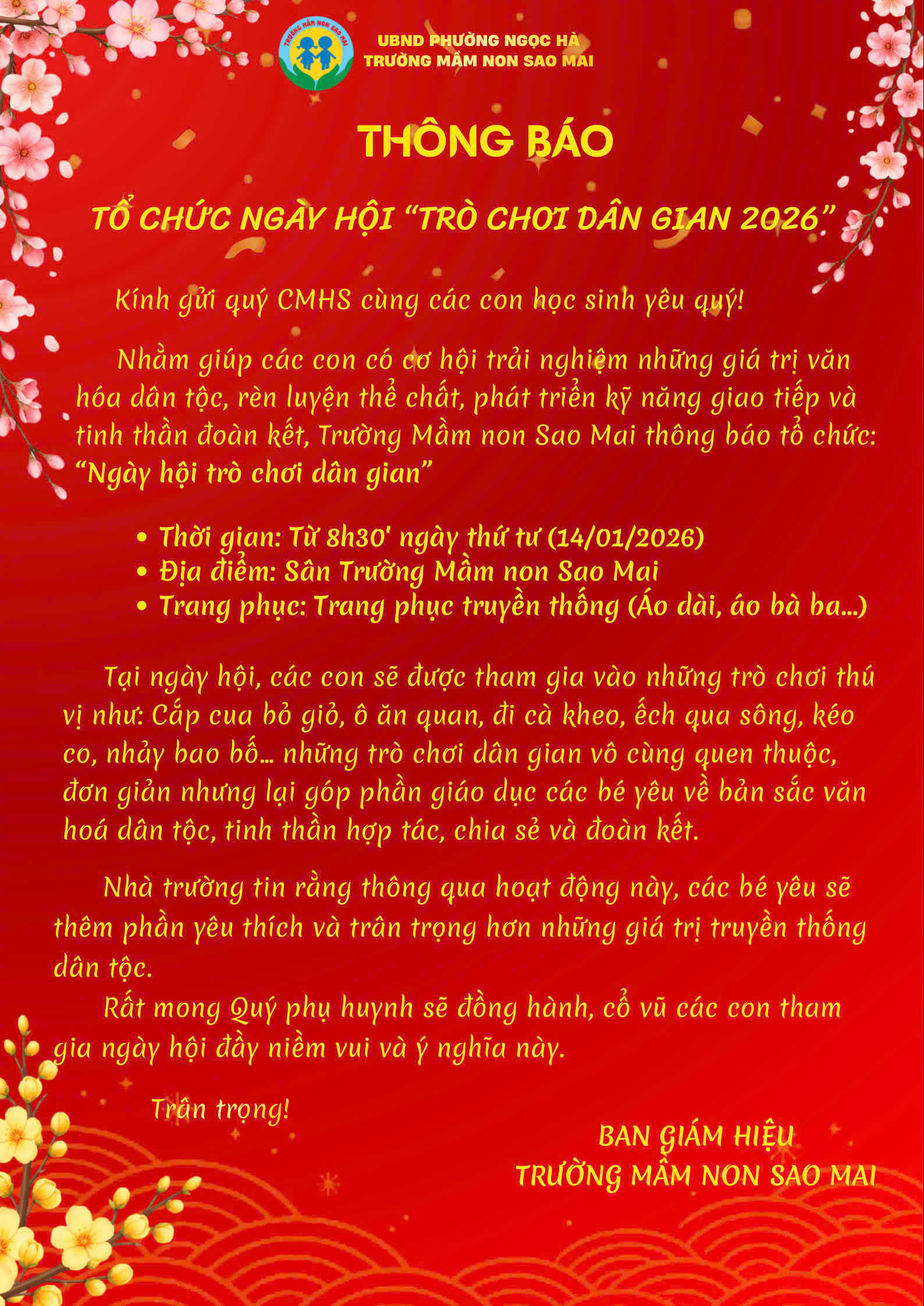 Thông báo tổ chức "Ngày hội Trò chơi dân gian 2026" của Trường Mầm non Sao Mai