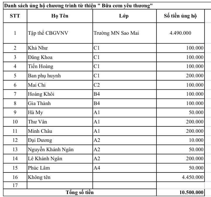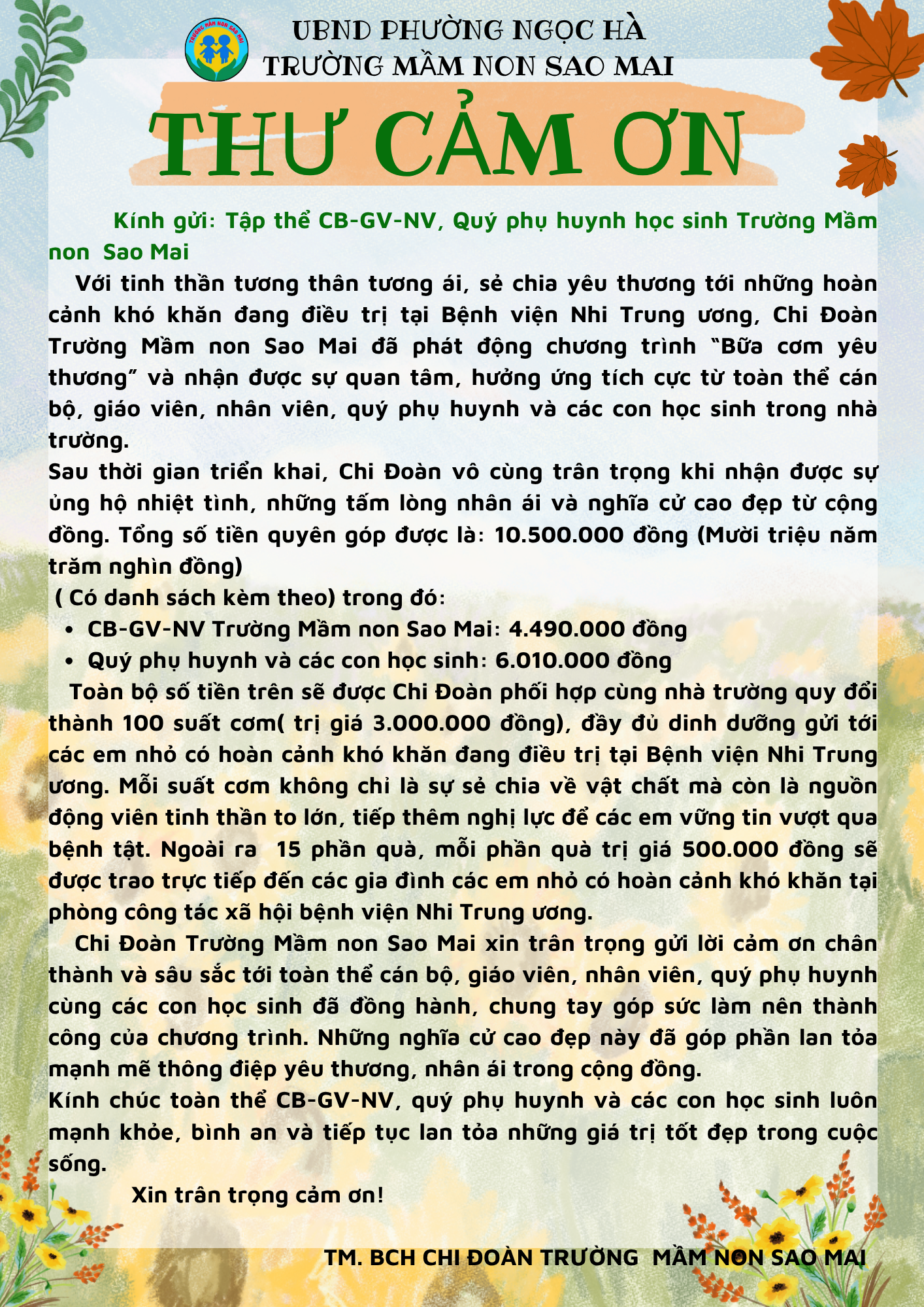 Thư cảm ơn – Chương trình thiện nguyện “Bữa cơm yêu thương” của Chi đoàn Trường Mầm non Sao Mai