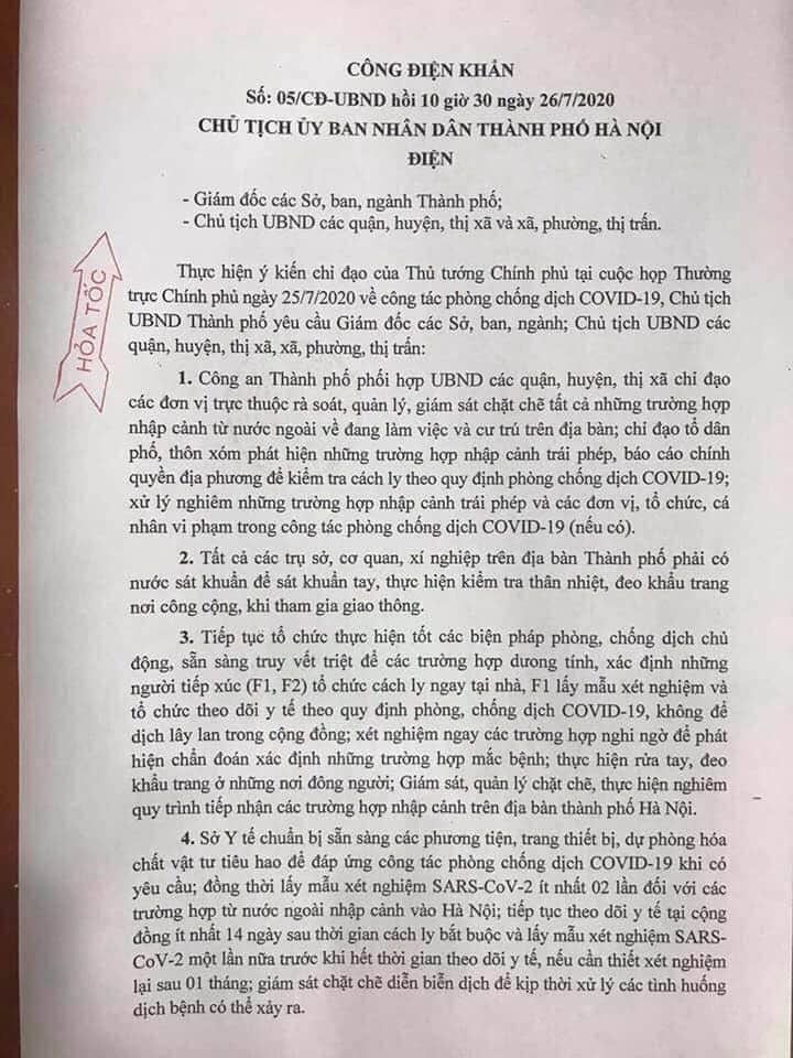 Công điện khẩn số 05/CĐ-UBND ngày 26/7/2020 của UBND thành phố Hà Nội
