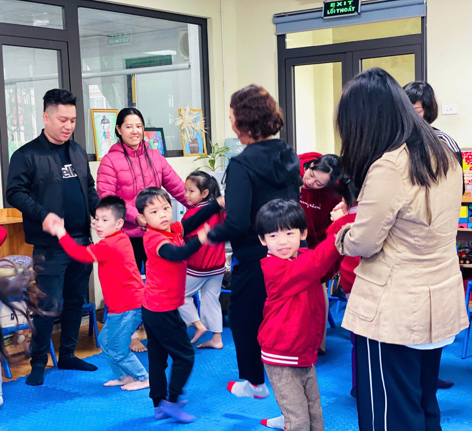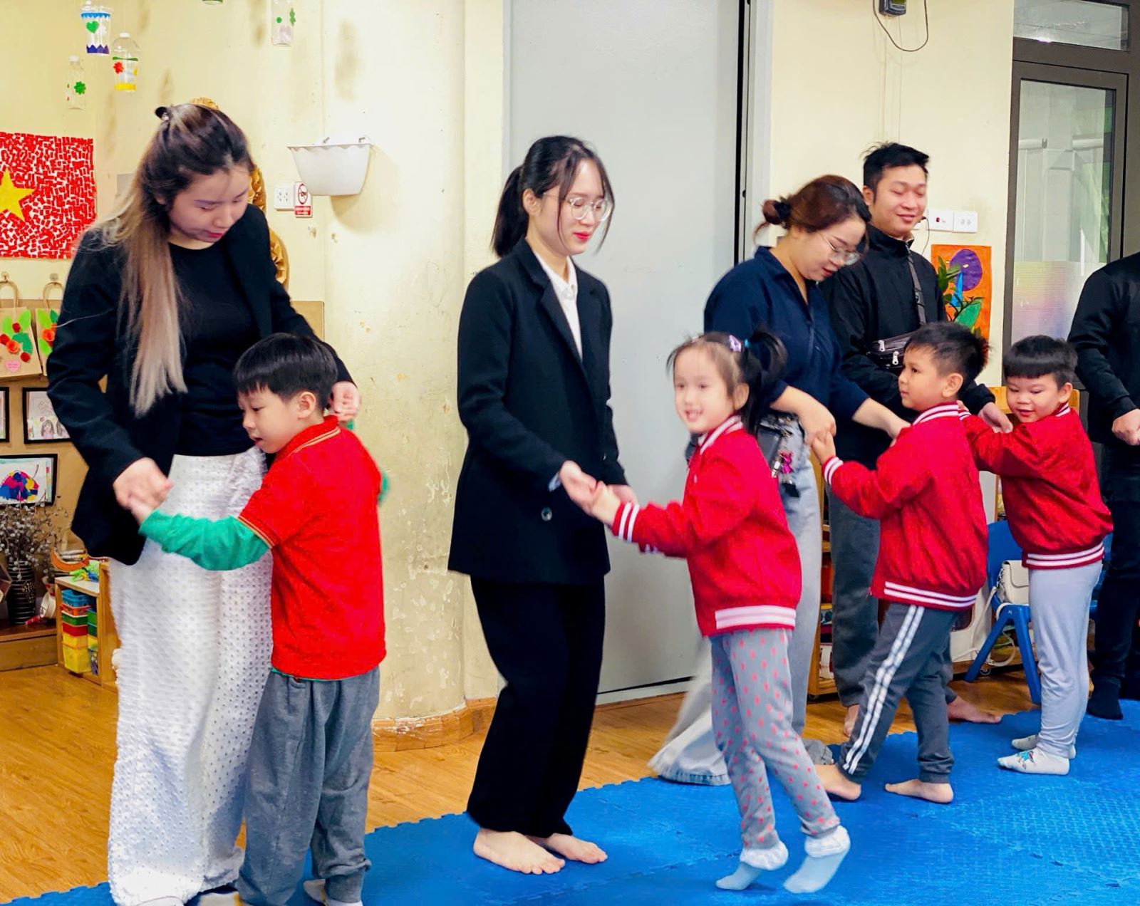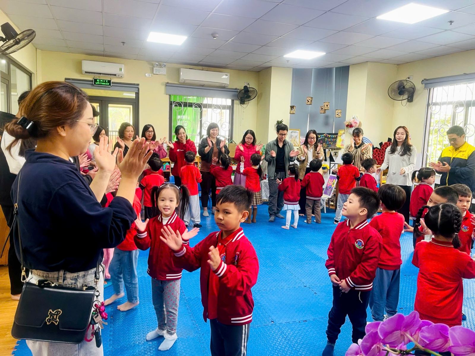 Tham gia hoạt động âm nhạc và vận động trong nhóm giúp trẻ phát triển và hoàn thiện các kỹ năng xã hội của mình. Trẻ sẽ học được cách làm việc theo nhóm, tương tác, kết nối, hợp tác và chia sẻ trong môi trường nhóm. Những kỹ năng này sẽ giúp trẻ thích nghi tốt hơn khi bắt đầu đi học. Với sự khéo léo và vận dụng linh hoạt cách tổ chức một tiết âm nhạc, cô giáo Nguyễn Thùy Dung đã đưa phụ huynh đi từ cảm xúc bất ngờ đến thích thú khi họ được thấy các con của mình tự tin thể hiện theo giai điệu của bản nhạc, được tham gia hoạt động trực tiếp với con.