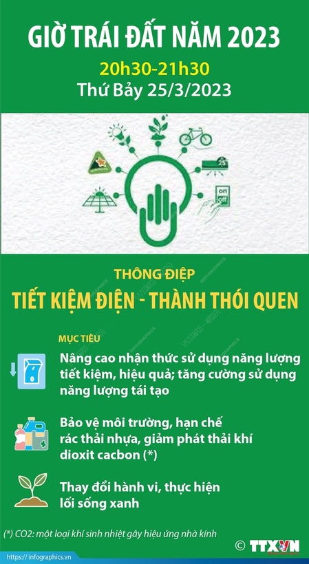 - Tổ chức thực hiện tắt đèn và các thiết bị điện không cần thiết trong 01 giờ từ 20h30 đến 21h30 ngày 25/03/2023 (thứ Bảy).