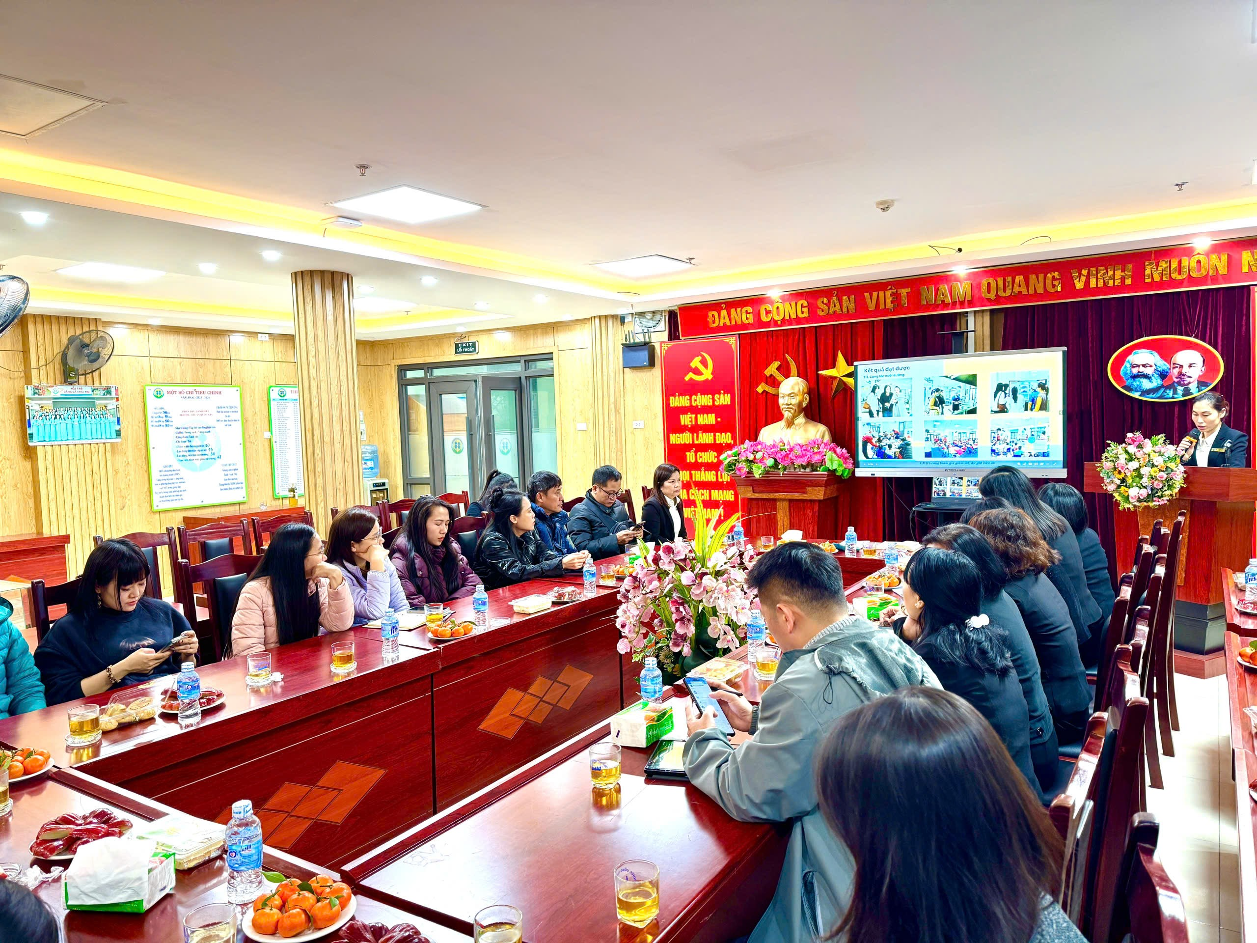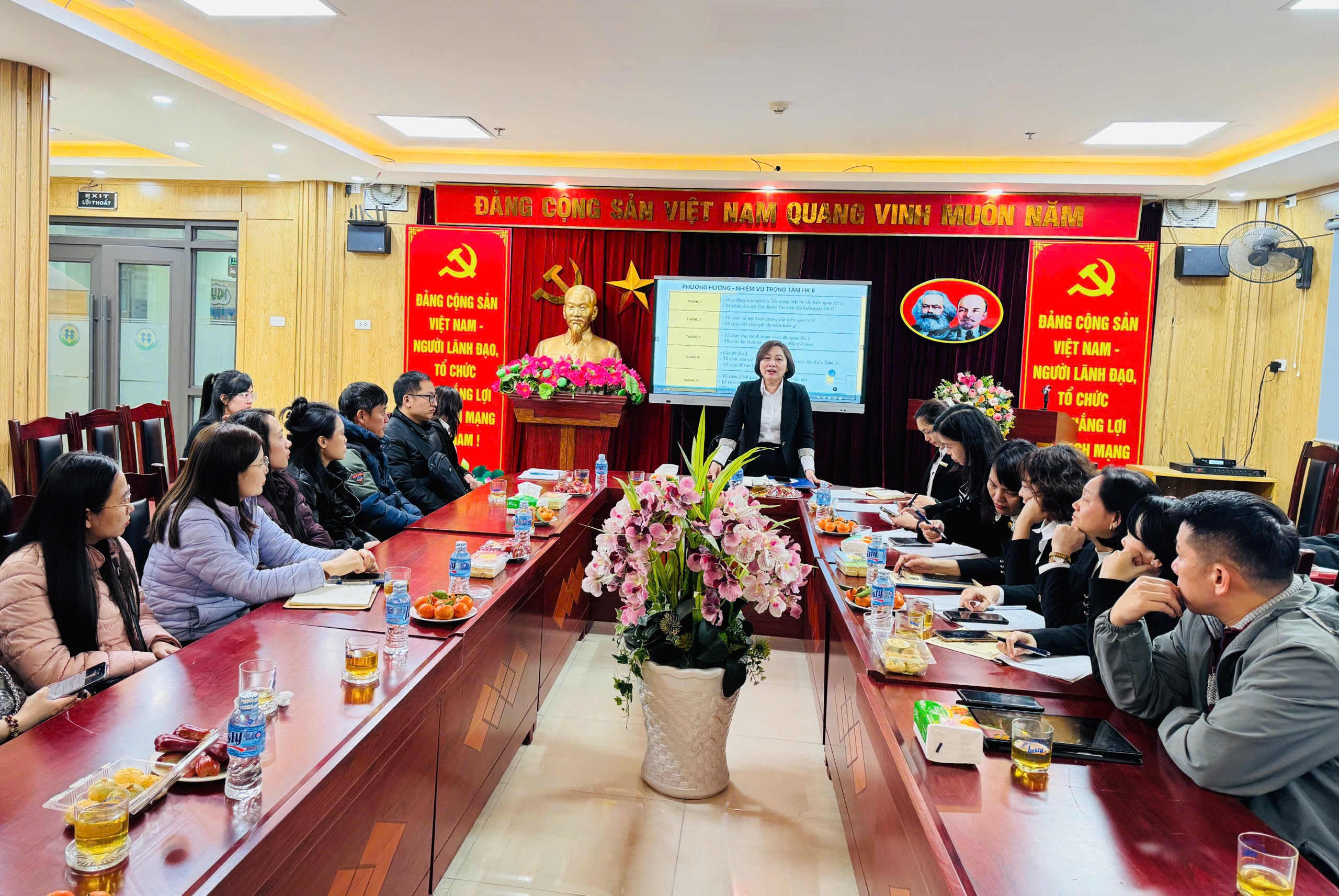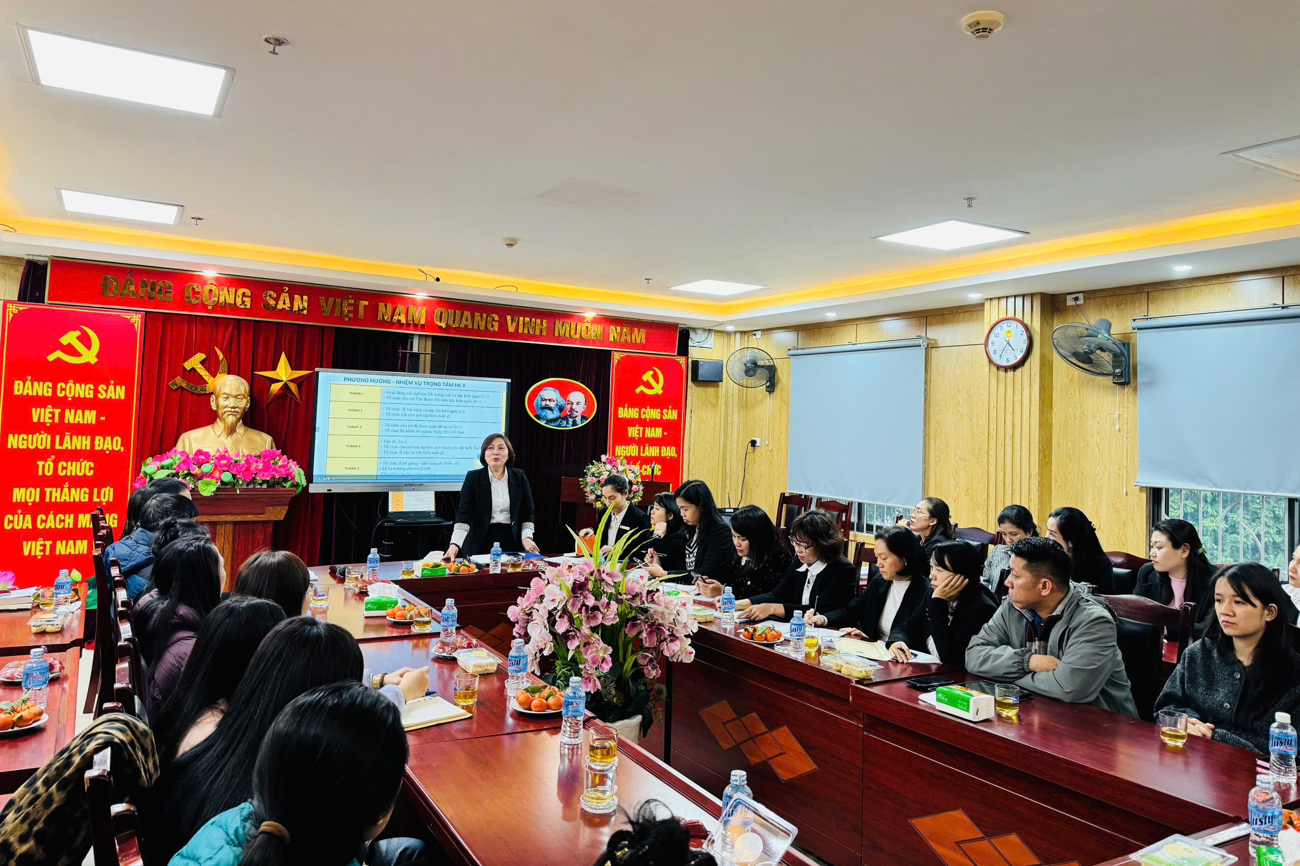 Tiếp theo, cô Đỗ Thị Hương Giang - Phó Bí thư Chi bộ, Phó Hiệu trưởng nhà trường đã trình bày Báo cáo sơ kết học kỳ I năm học 2025-2026. Báo cáo đã nêu rõ những kết quả đạt được trong các lĩnh vực: công tác quản lý, chất lượng chăm sóc – giáo dục học sinh, nền nếp chuyên môn, các phong trào thi đua cũng như những thuận lợi và khó khăn trong quá trình thực hiện nhiệm vụ. Đồng thời, báo cáo cũng thẳng thắn chỉ ra một số tồn tại, hạn chế cần khắc phục trong thời gian tới.