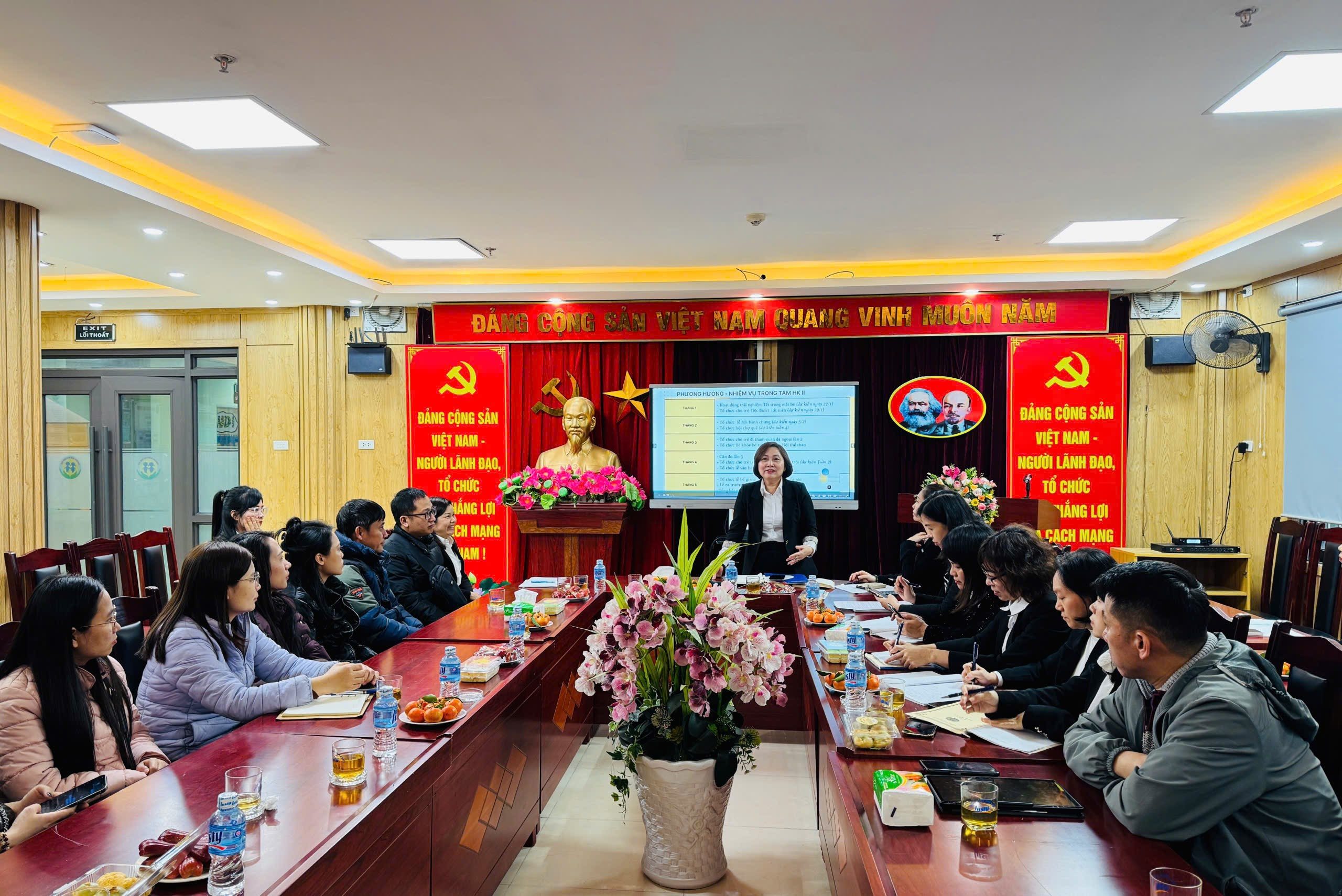 Tiếp đó, nhà giáo Bùi Thị Thu Hiền - Hiệu trưởng nhà trường đã thông qua Phương hướng và nhiệm vụ trọng tâm học kỳ II năm học 2025-2026. Cô nhấn mạnh các giải pháp nhằm tiếp tục nâng cao chất lượng giáo dục, tăng cường kỷ cương, nền nếp, đẩy mạnh sự phối hợp giữa giáo viên và cha mẹ học sinh trong việc theo dõi, hỗ trợ quá trình học tập và rèn luyện của học sinh.