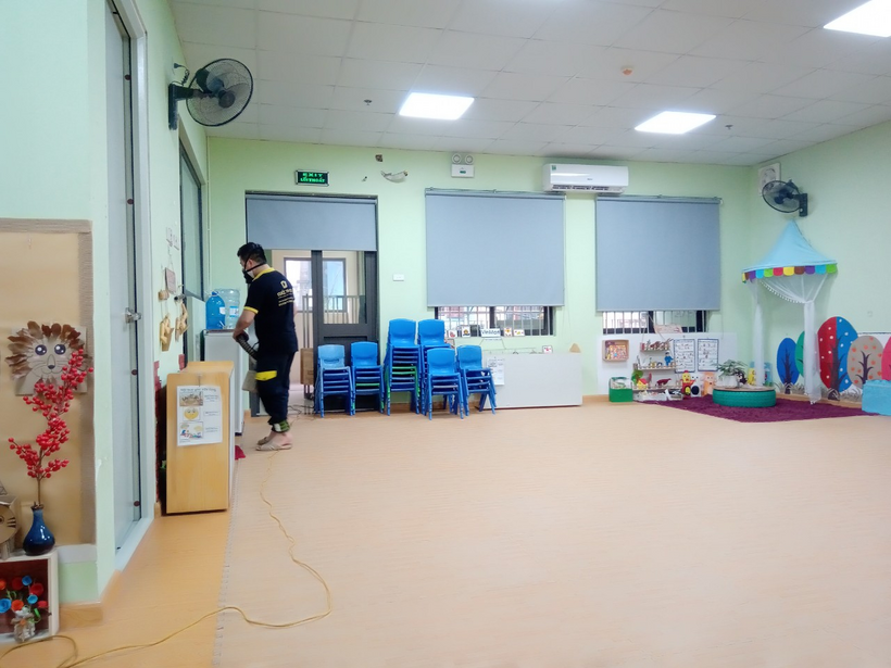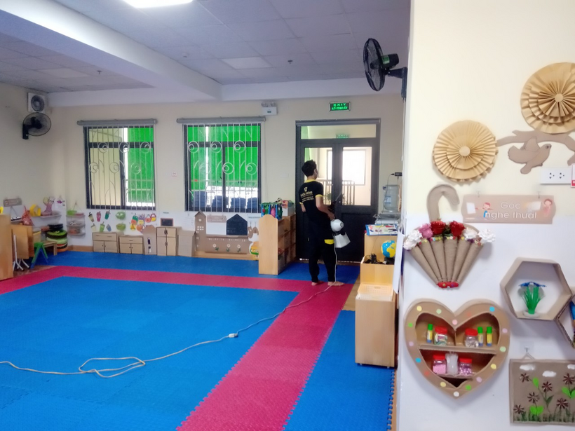 Trước khi trẻ đi học trở lại cán bộ giáo viên, nhân viên toàn trường đã phối hợp thực hiện tổng vệ sinh môi trường trong và ngoài lớp học đảm bảo sạch sẽ an toàn cho các con và CBGVNV toàn trường.