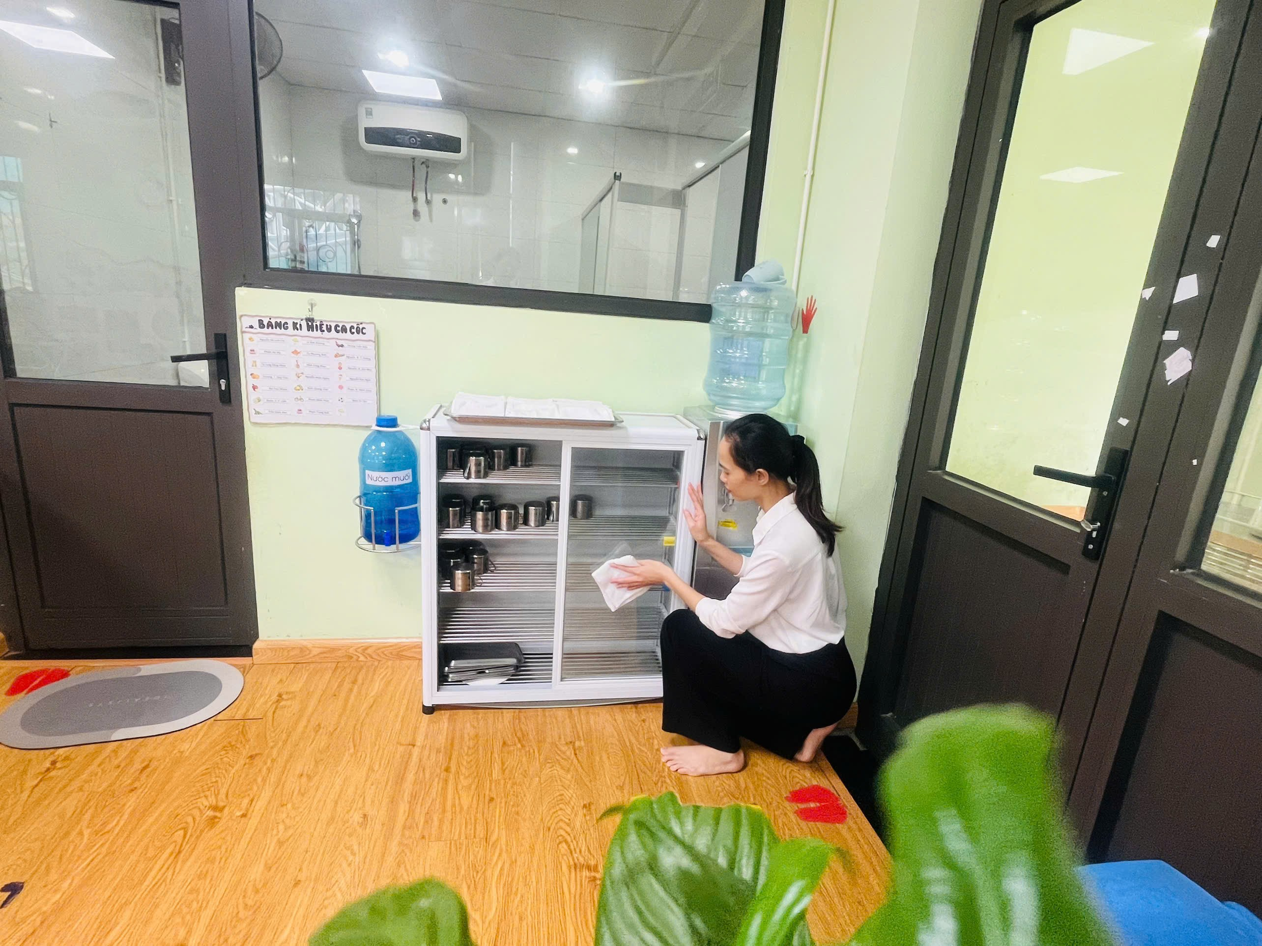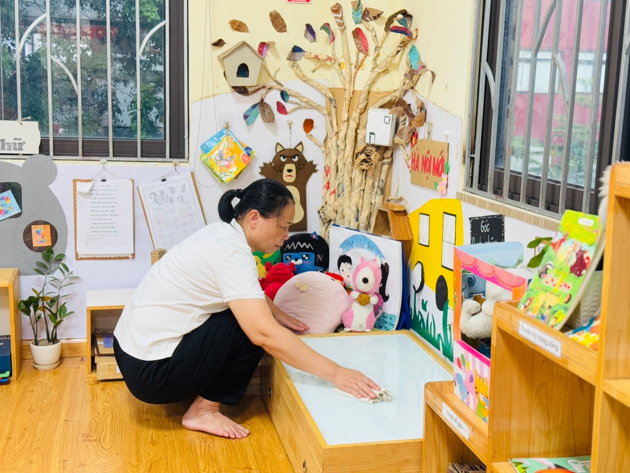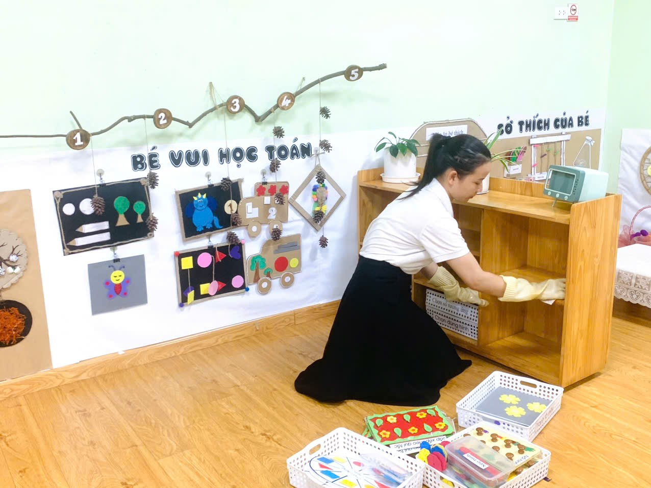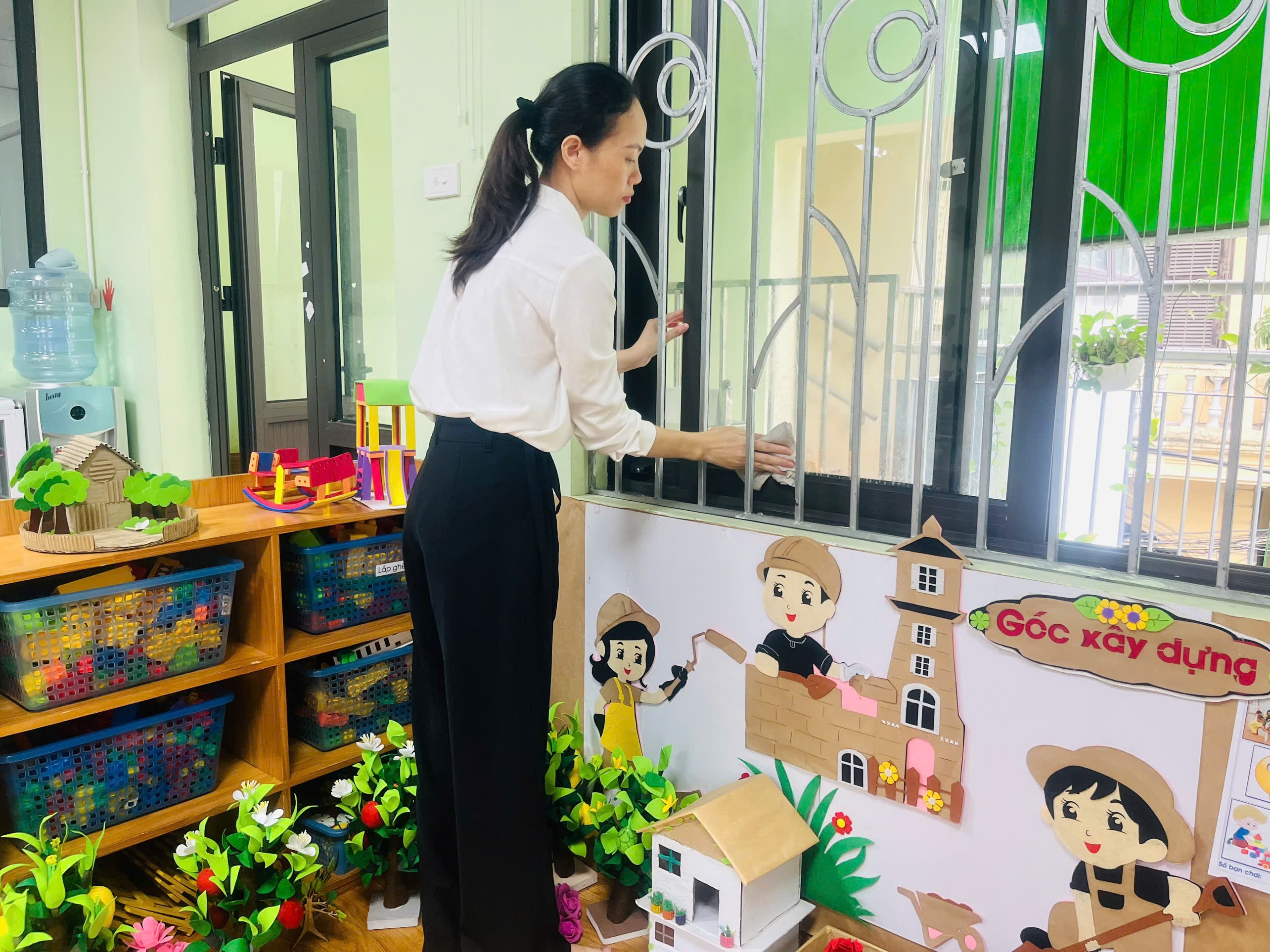Tại các lớp học, giáo viên cùng nhân viên vệ sinh thường xuyên lau chùi bàn ghế, tay nắm cửa, kệ đồ chơi và các bề mặt tiếp xúc nhiều bằng dung dịch khử khuẩn. Đồ chơi, học cụ được rửa sạch, phơi khô định kỳ để hạn chế tối đa mầm bệnh. Hằng ngày, các lớp đều mở cửa sổ thông thoáng, kết hợp quạt thông gió để không khí lưu thông, giảm nguy cơ lây nhiễm chéo.