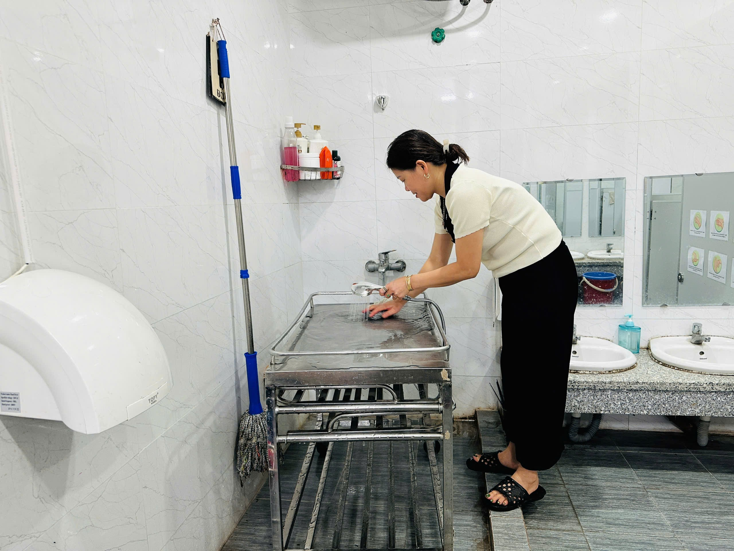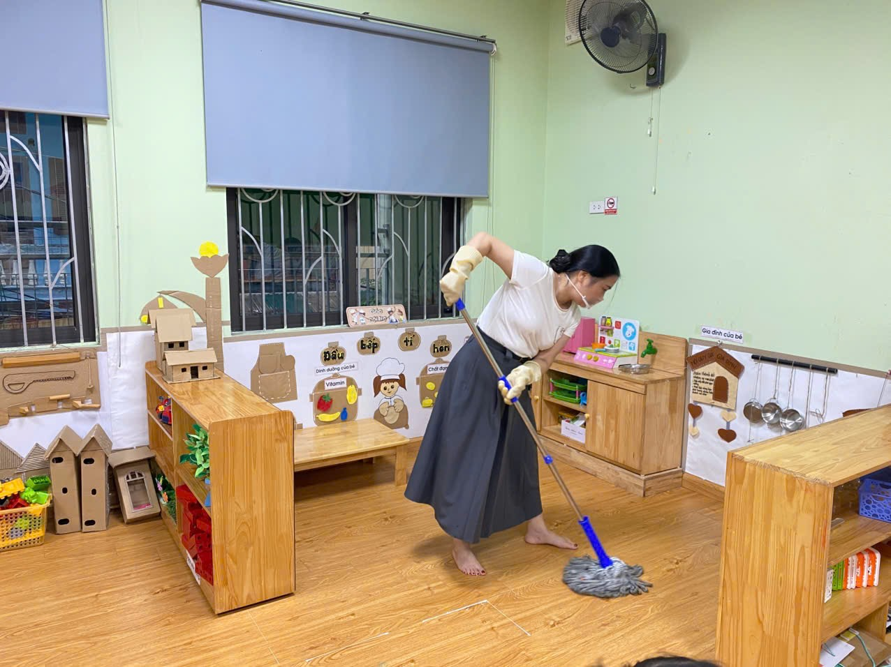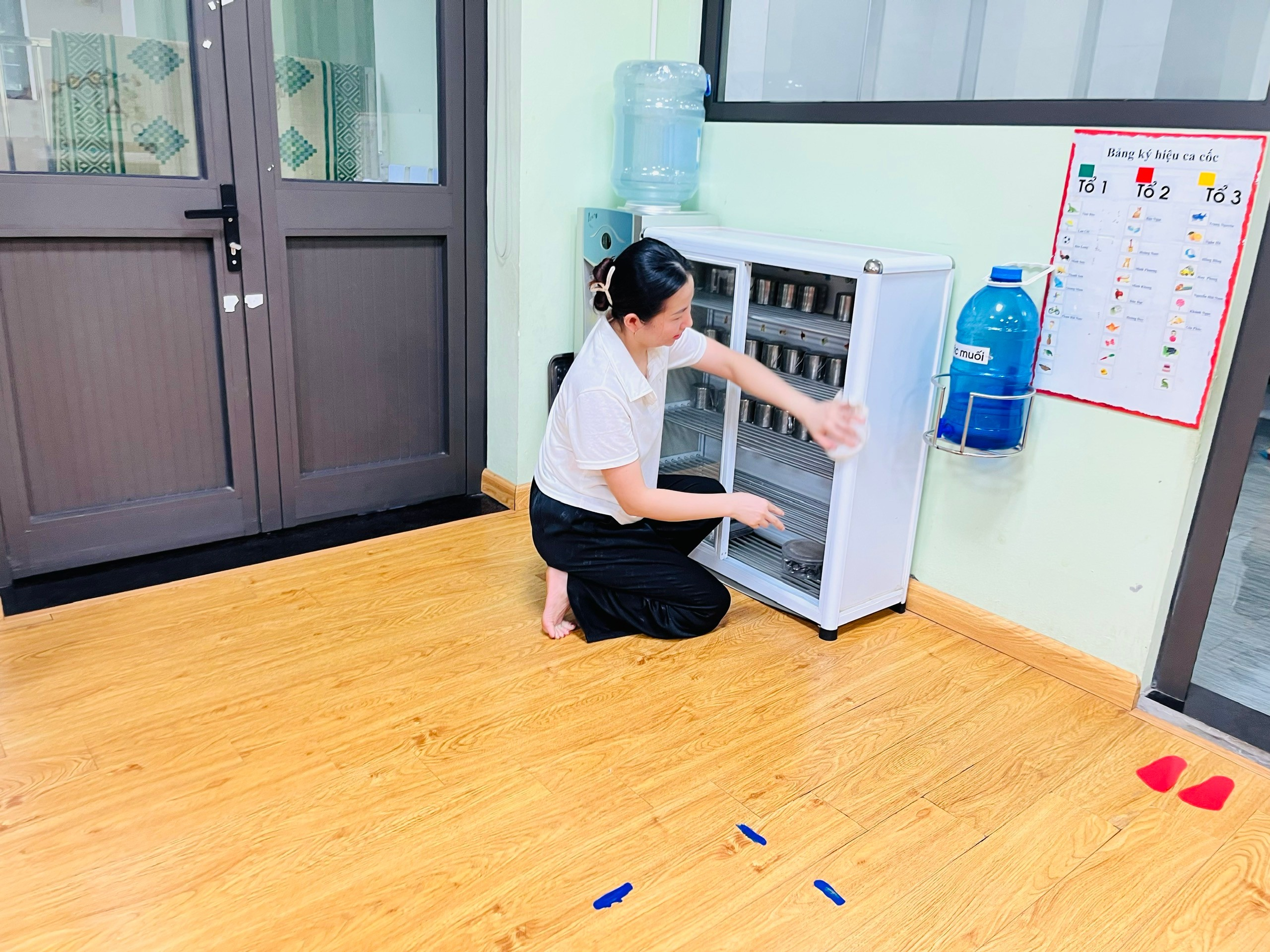 Tại các lớp học, giáo viên cùng nhân viên vệ sinh thường xuyên lau chùi bàn ghế, tay nắm cửa, kệ đồ chơi và các bề mặt tiếp xúc nhiều bằng dung dịch khử khuẩn. Đồ chơi, học cụ được rửa sạch, phơi khô định kỳ để hạn chế tối đa mầm bệnh. Hằng ngày, các lớp đều mở cửa sổ thông thoáng, kết hợp quạt thông gió để không khí lưu thông, giảm nguy cơ lây nhiễm chéo.