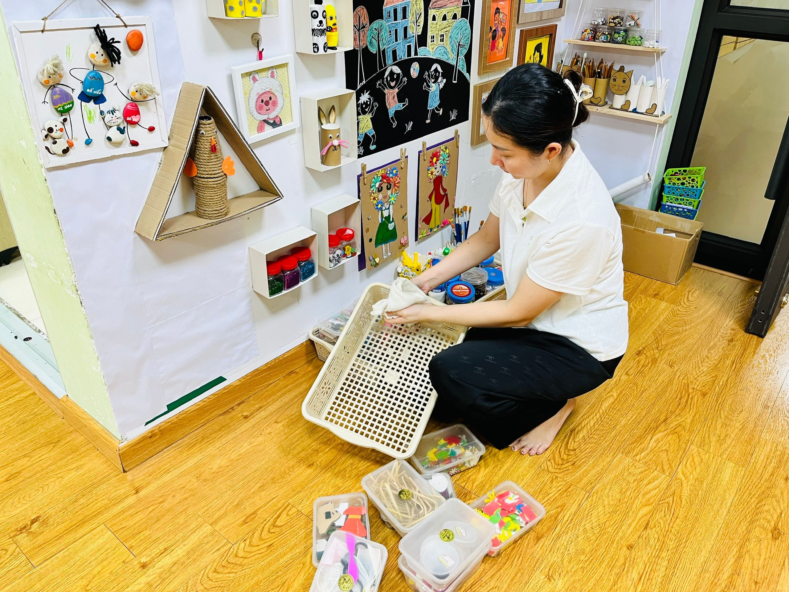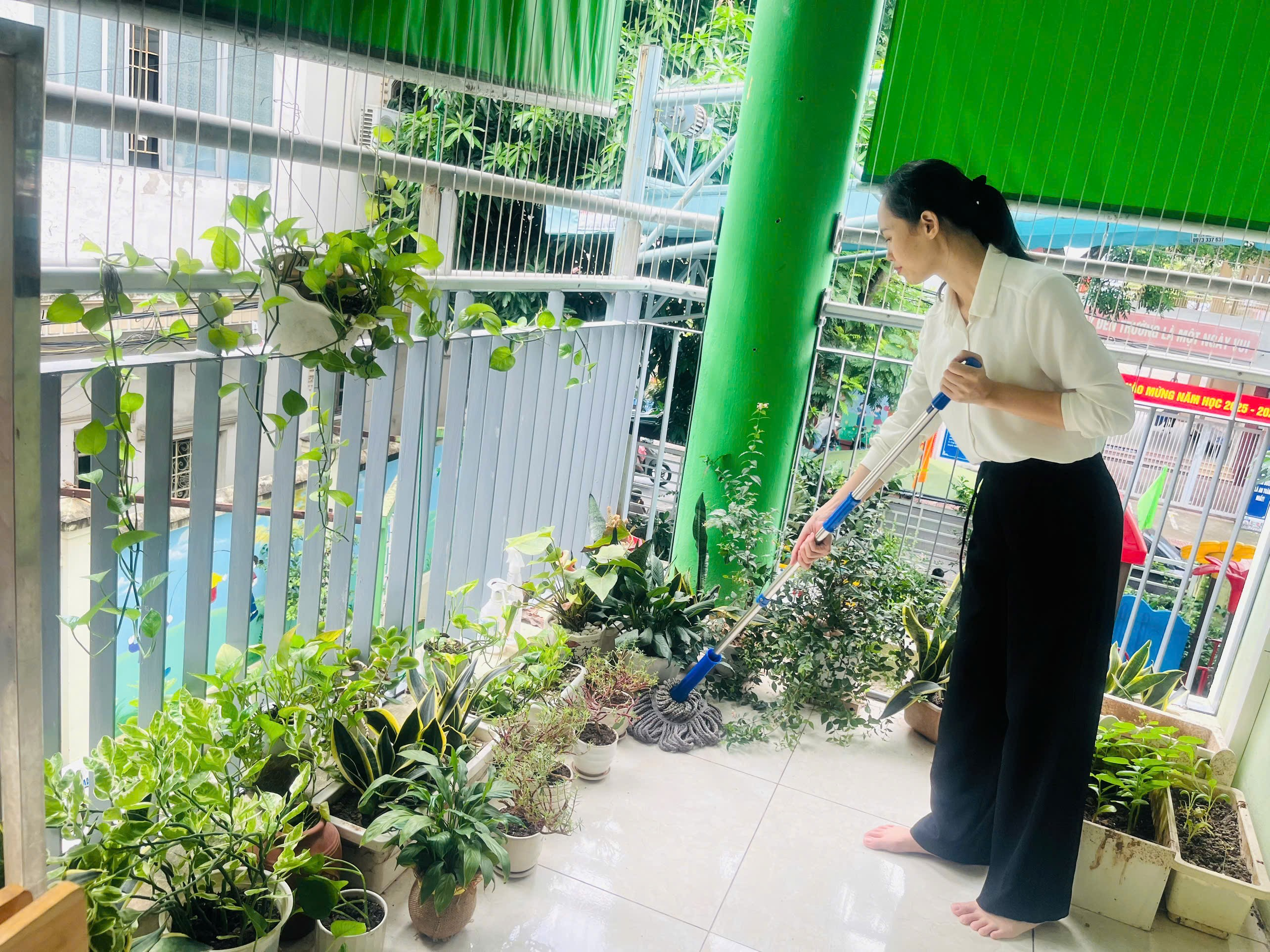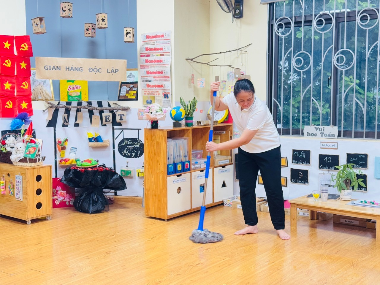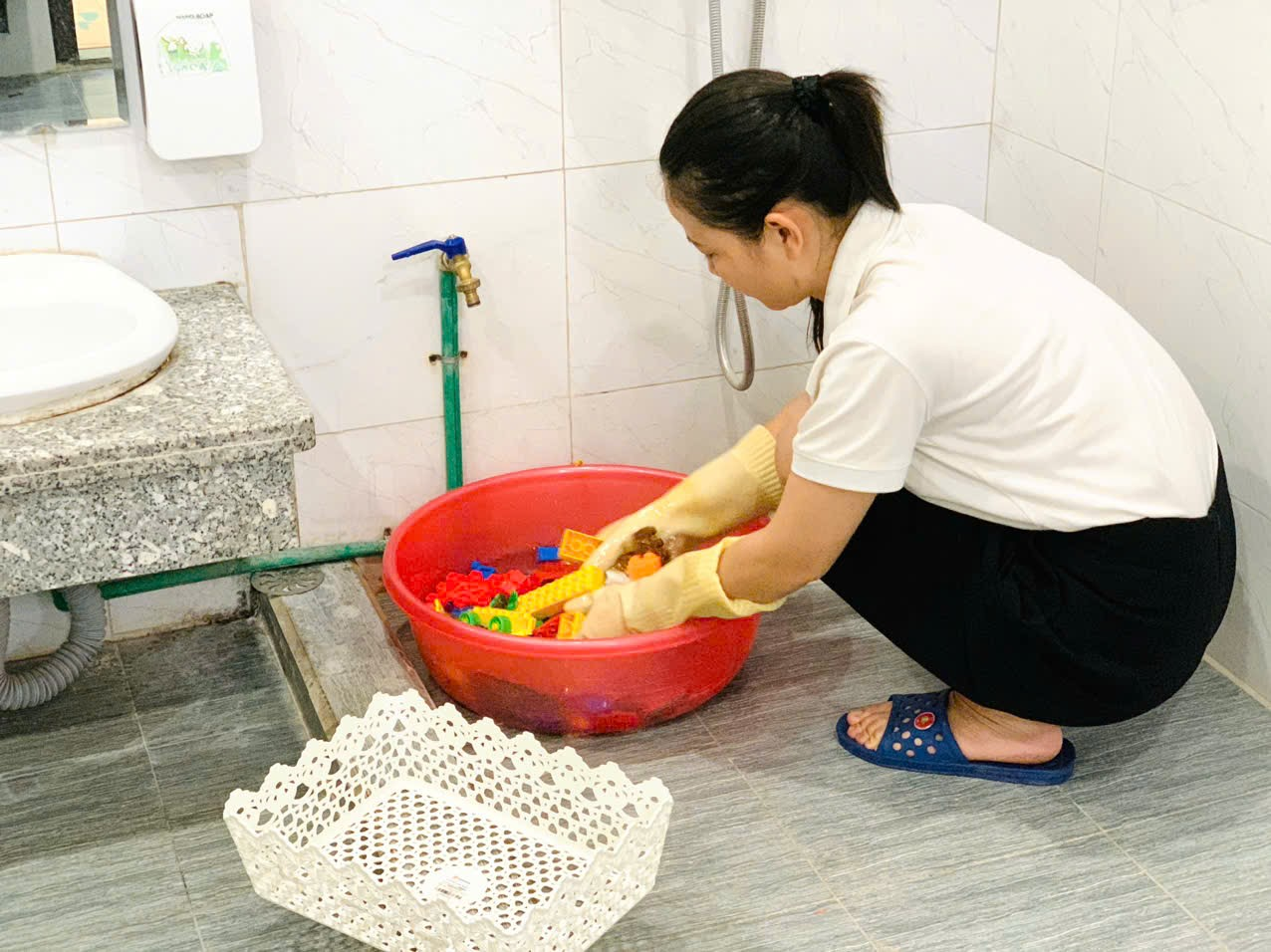 Tại các lớp học, giáo viên cùng nhân viên vệ sinh thường xuyên lau chùi bàn ghế, tay nắm cửa, kệ đồ chơi và các bề mặt tiếp xúc nhiều bằng dung dịch khử khuẩn. Đồ chơi, học cụ được rửa sạch, phơi khô định kỳ để hạn chế tối đa mầm bệnh. Hằng ngày, các lớp đều mở cửa sổ thông thoáng, kết hợp quạt thông gió để không khí lưu thông, giảm nguy cơ lây nhiễm chéo.