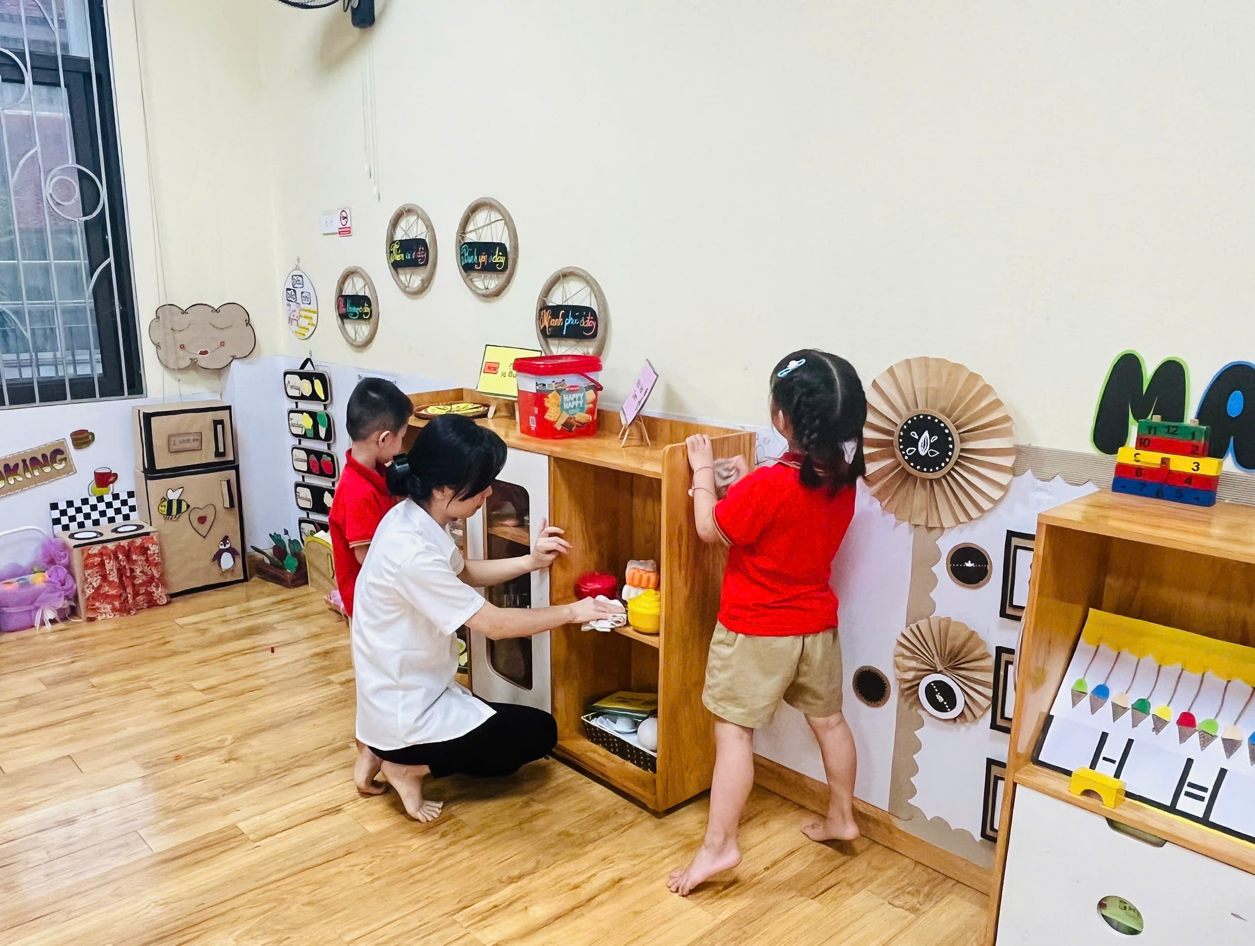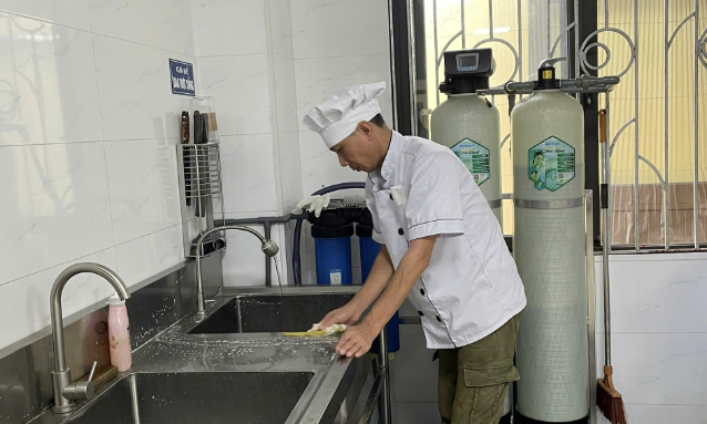 Đặc biệt, khu vực bếp ăn – nơi trực tiếp phục vụ bữa ăn cho các bé – được quản lý nghiêm ngặt. Khu sơ chế, nấu nướng, chia suất và bảo quản thực phẩm được tách biệt rõ ràng, tuân thủ nguyên tắc “một chiều”. Dụng cụ chế biến, bát đĩa, khay ăn được rửa sạch, tráng nước nóng, sấy khô trước khi sử dụng. Bếp ăn, sàn nhà, bồn rửa được vệ sinh và khử khuẩn thường xuyên, đảm bảo an toàn tuyệt đối.