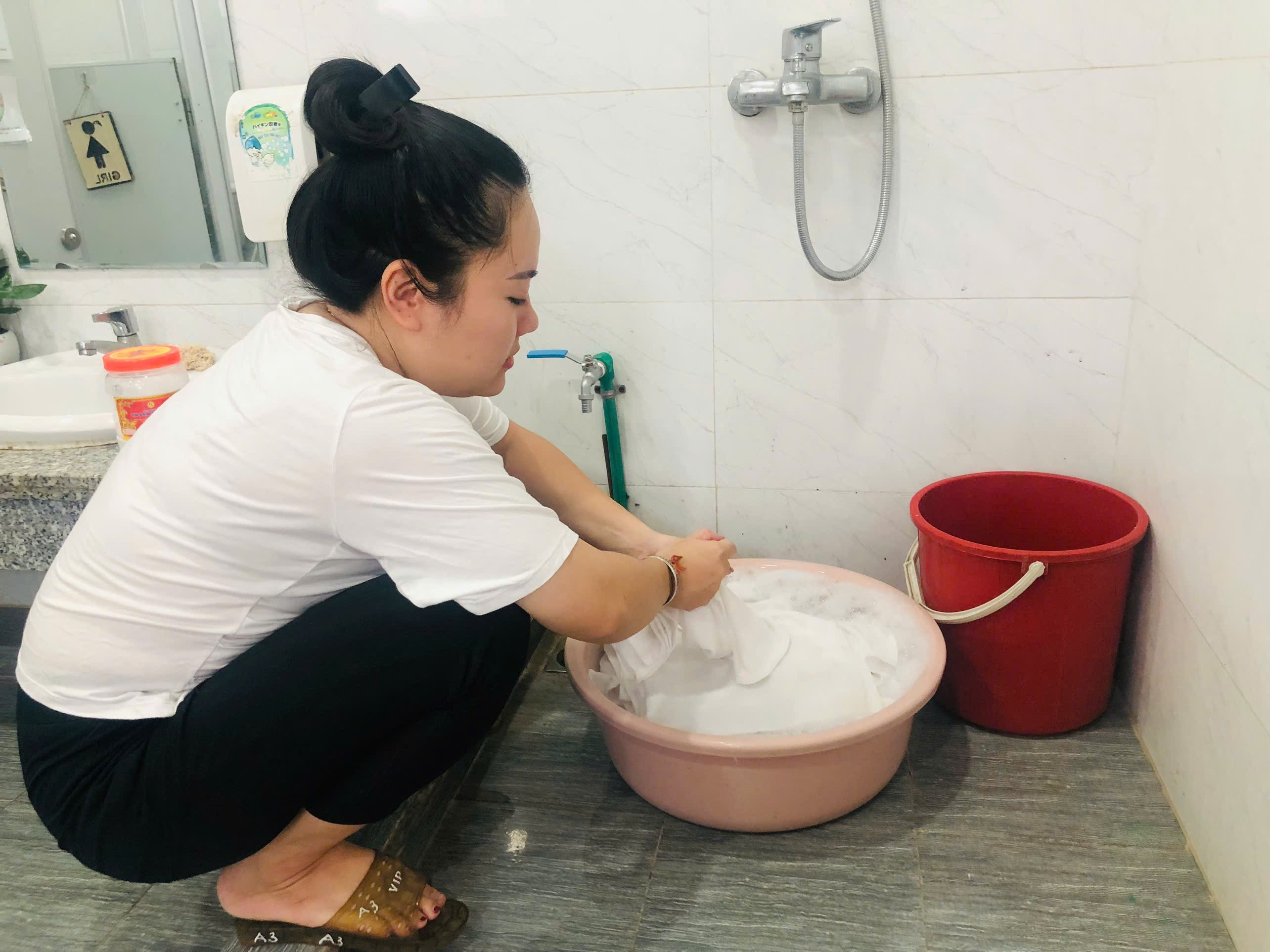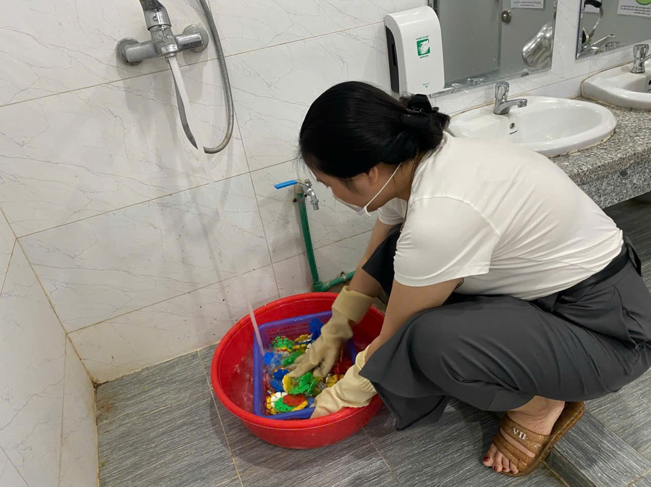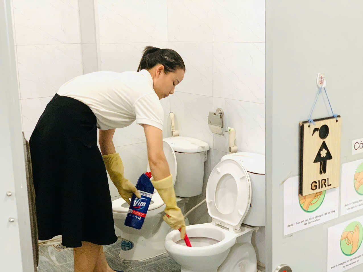 Song song đó, khu vệ sinh trong trường được cọ rửa hằng ngày bằng dung dịch diệt khuẩn; vòi nước, xà phòng rửa tay được bố trí đầy đủ và thuận tiện cho trẻ. Giáo viên hướng dẫn các bé rửa tay đúng cách trước khi ăn, sau khi đi vệ sinh và sau giờ vui chơi ngoài trời.