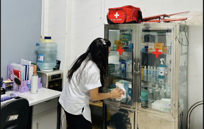 Ở các phòng ban làm việc, nhà trường chú trọng vệ sinh thường xuyên máy tính, bàn làm việc, điện thoại bàn và các thiết bị dùng chung. Thùng rác có nắp đậy được đặt đúng nơi quy định và dọn dẹp hằng ngày. Nhân viên, giáo viên đều được nhắc nhở giữ vệ sinh cá nhân, rửa tay bằng xà phòng hoặc dung dịch sát khuẩn trước và sau giờ làm việc.