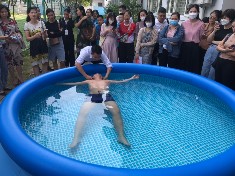 Chuyên gia của Viện Khoa học an toàn Việt Nam hướng dẫn kỹ năng cơ bản để nổi trên mặt nước. |