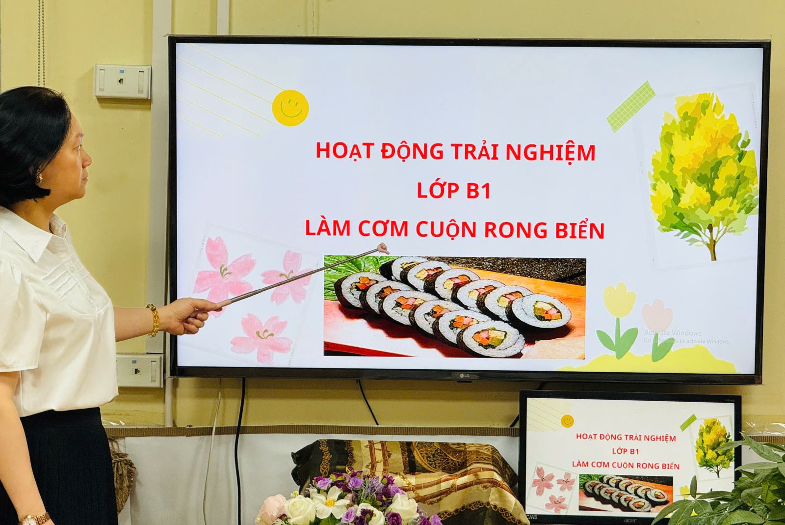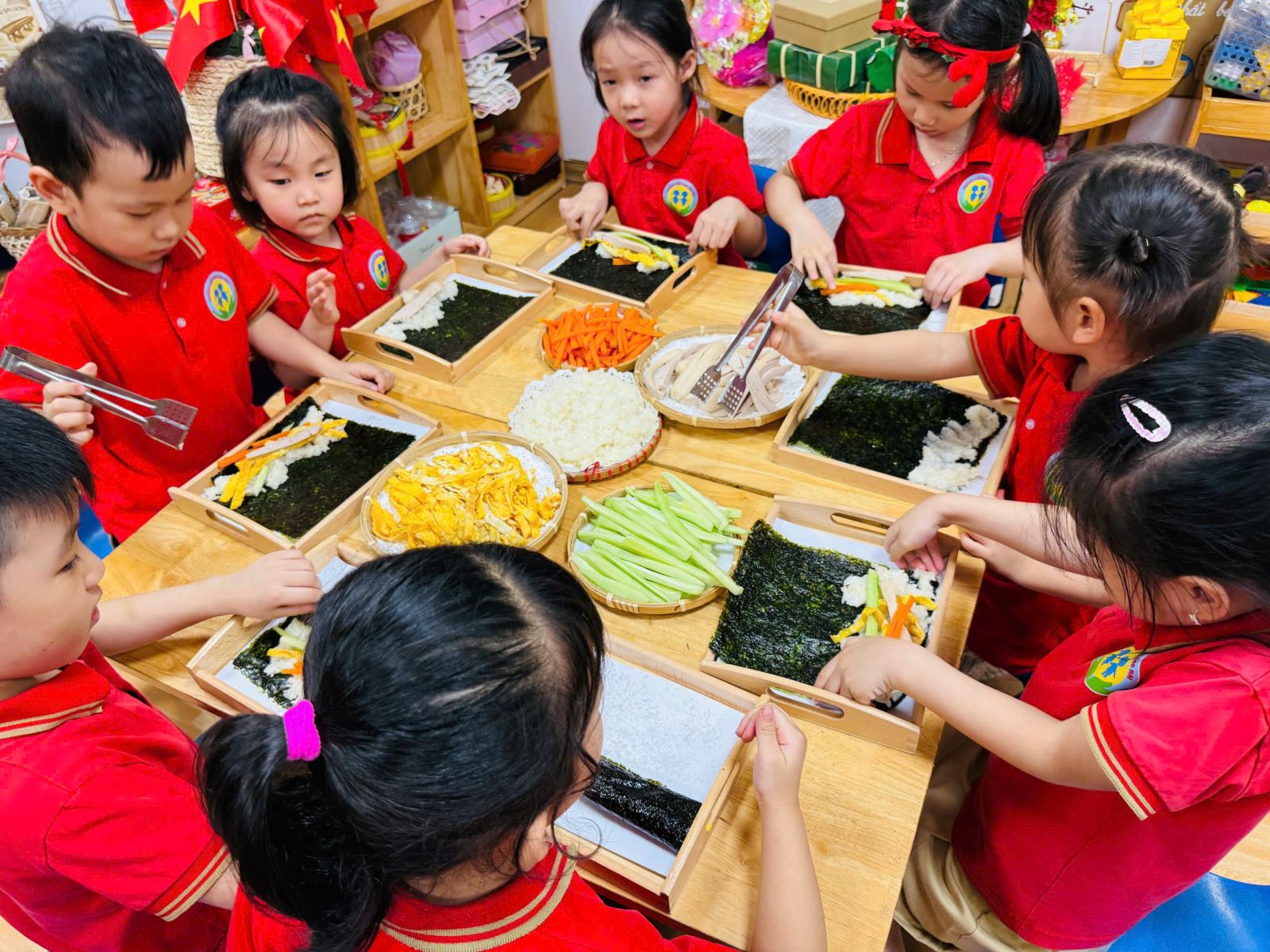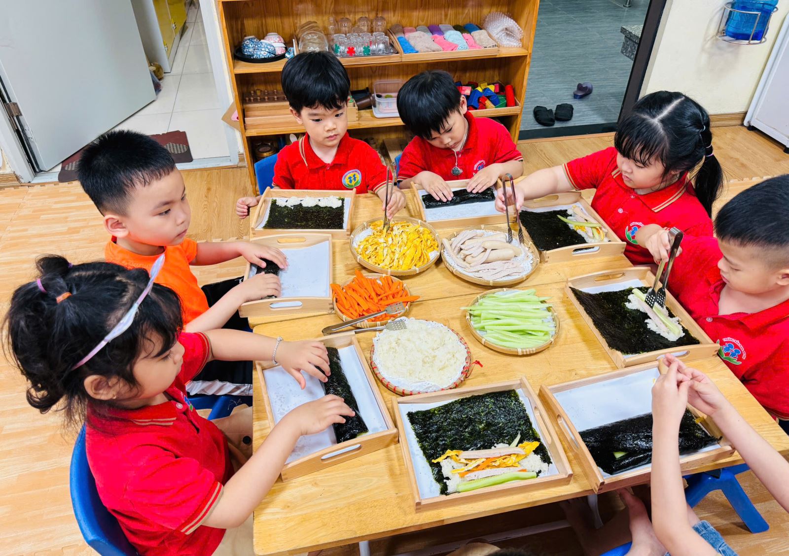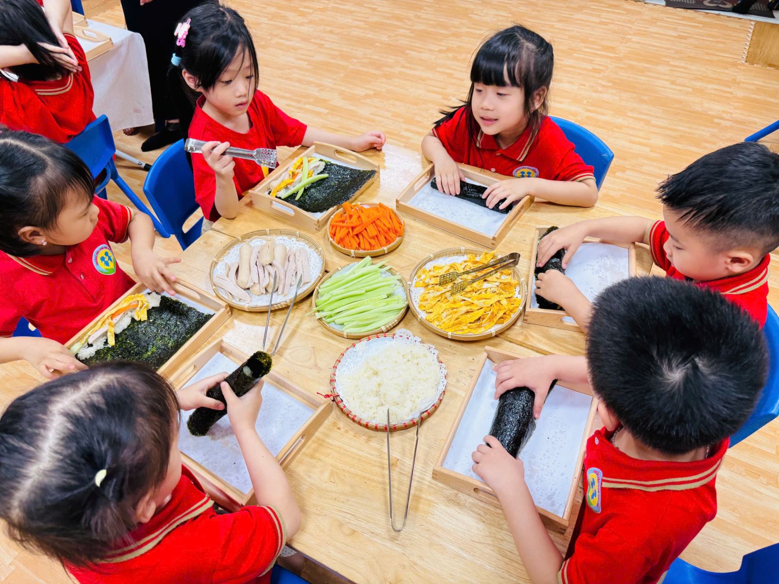 Dưới sự hướng dẫn tận tình của cô giáo, các bé được tự tay thực hiện từng bước làm cơm cuộn: trải rong biển, dàn cơm, xếp nhân và khéo léo cuộn tròn. Những đôi tay nhỏ xinh tuy còn vụng về nhưng tràn đầy sự tập trung và hào hứng. Mỗi cuộn cơm hoàn thành đều là “thành quả” đáng yêu, thể hiện sự cố gắng và sáng tạo của các con
