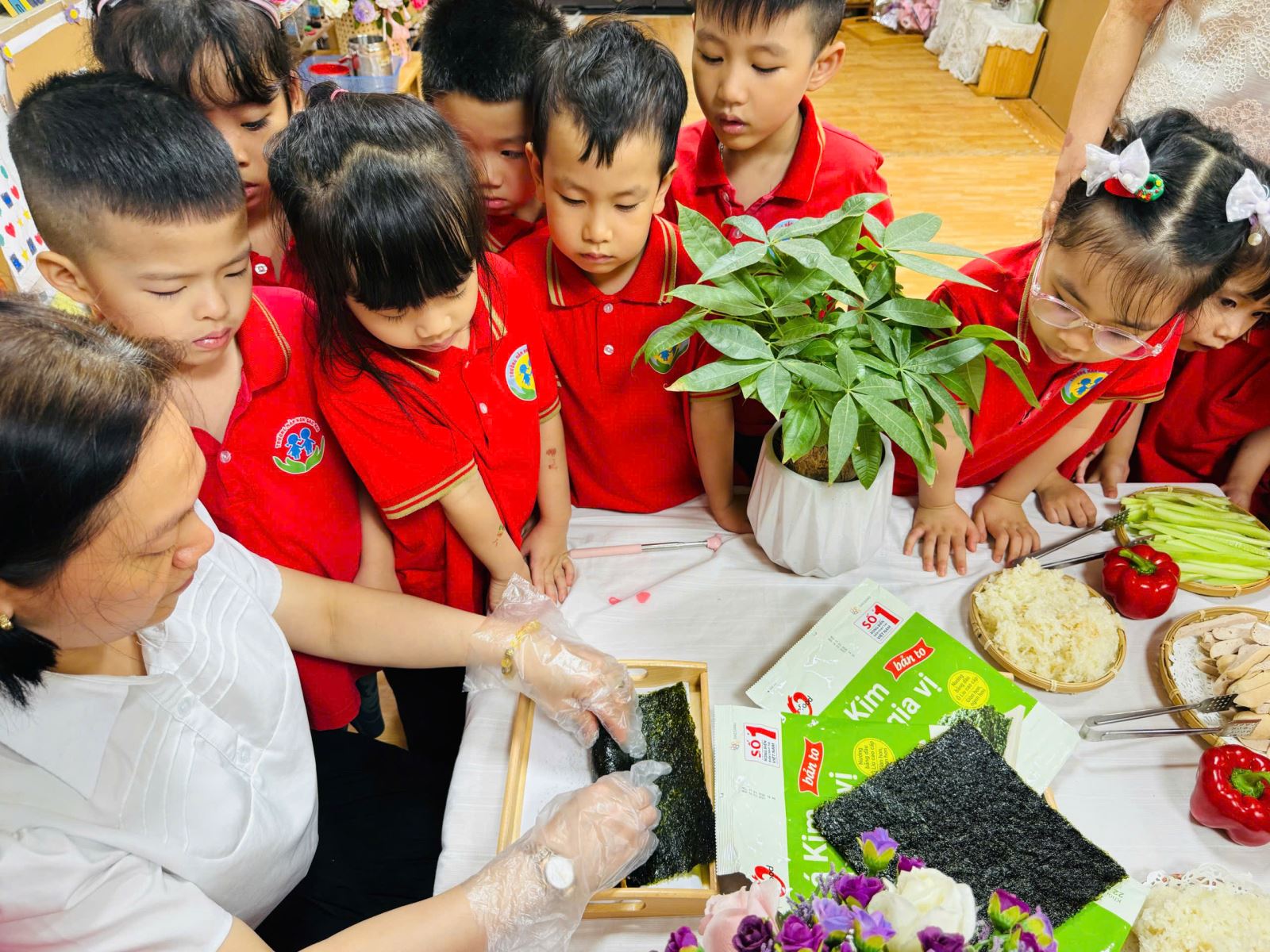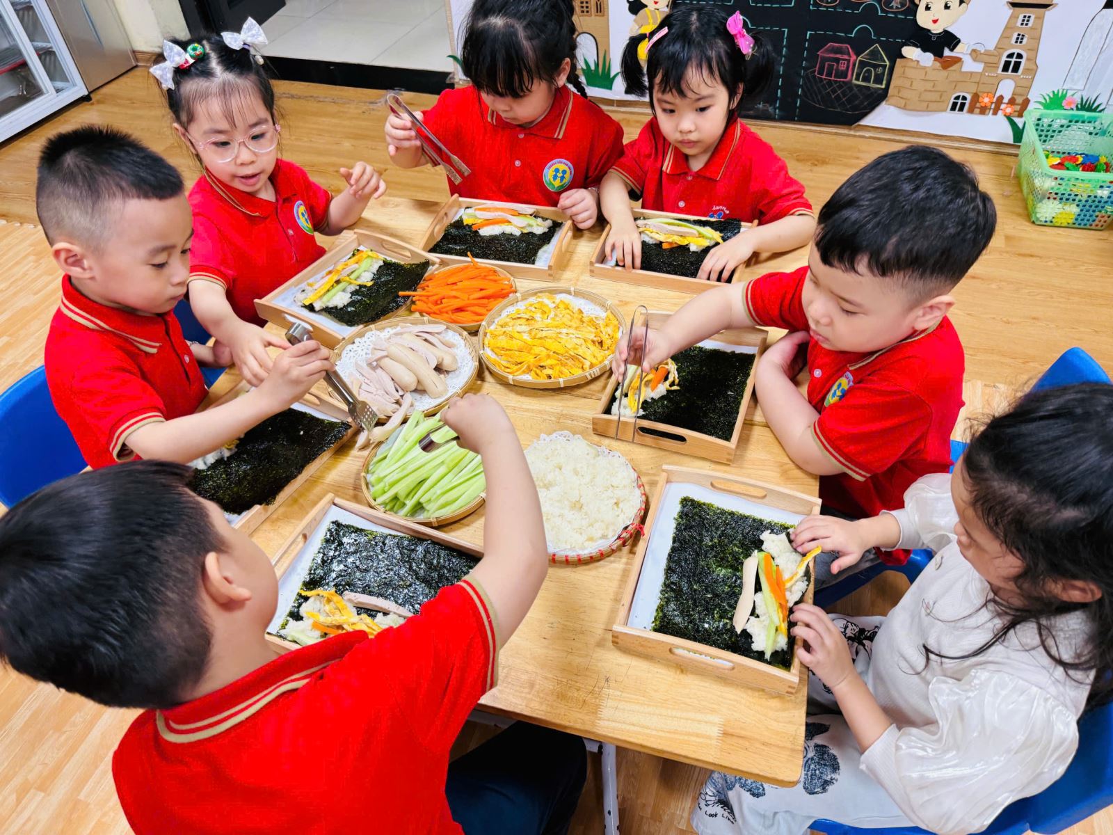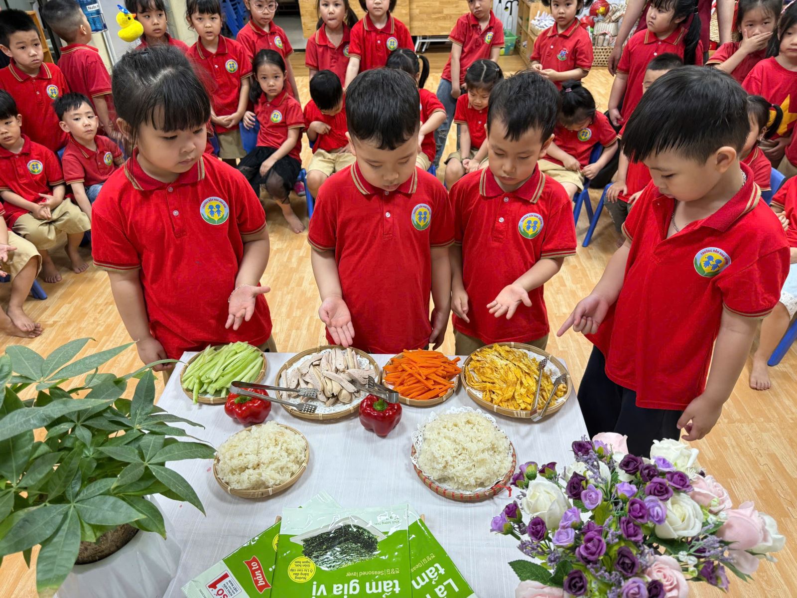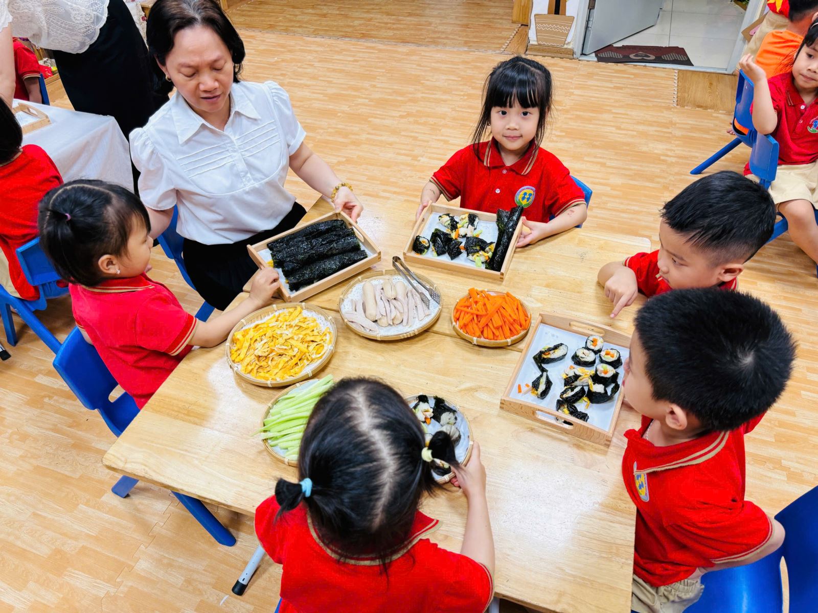Trong không khí hào hứng và đầy thích thú, các bé được cô giáo giới thiệu về nguyên liệu như cơm trắng, rong biển, xúc xích, cà rốt, dưa chuột… Qua đó, trẻ không chỉ nhận biết thêm nhiều loại thực phẩm quen thuộc mà còn hiểu hơn về giá trị dinh dưỡng của từng món ăn...