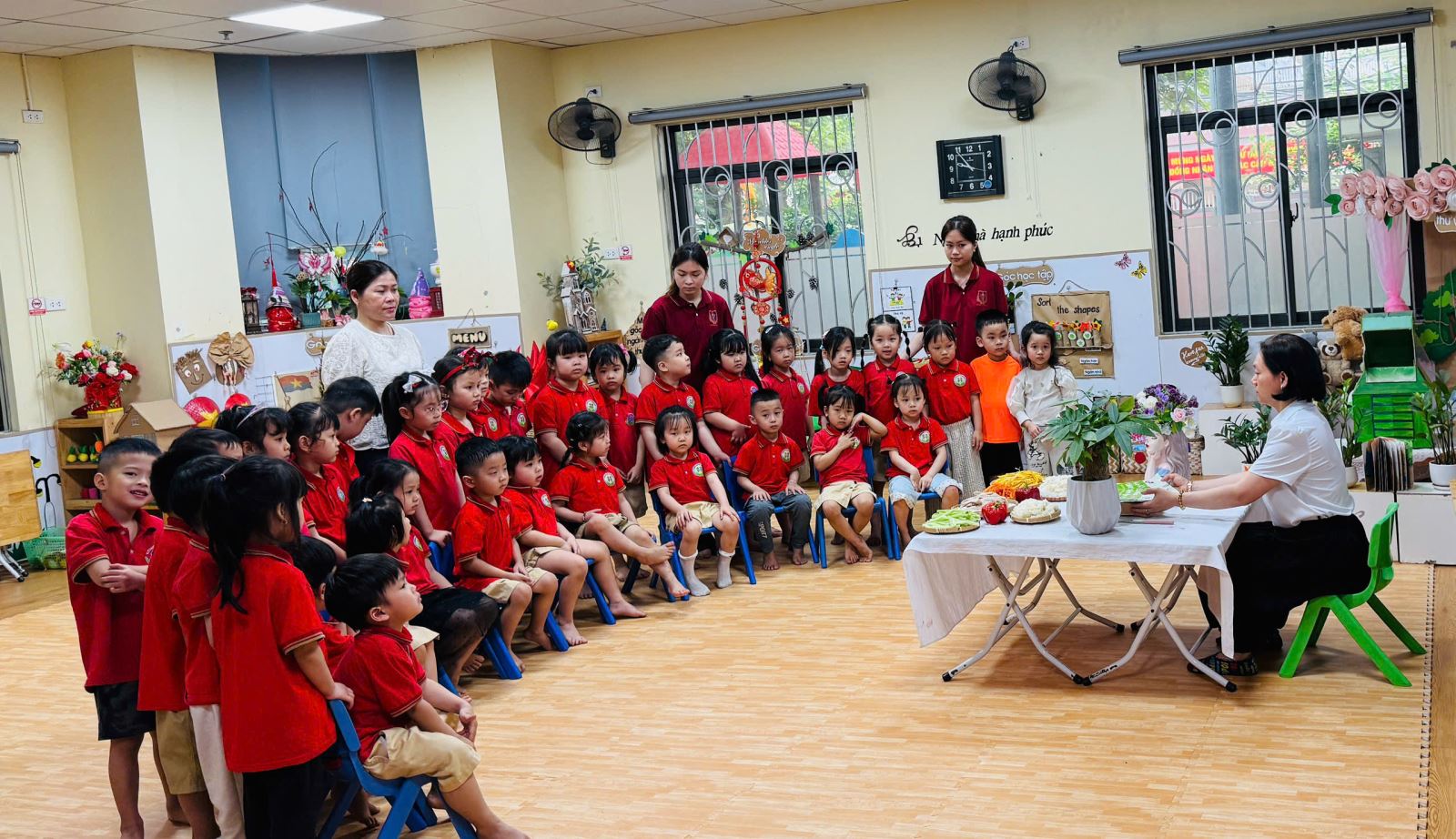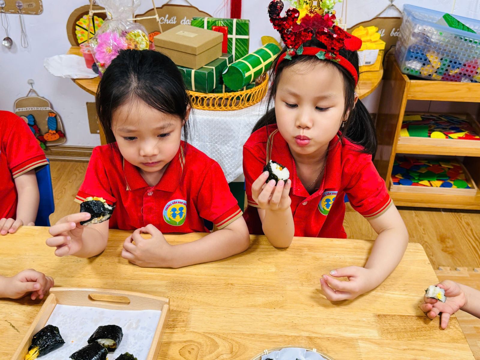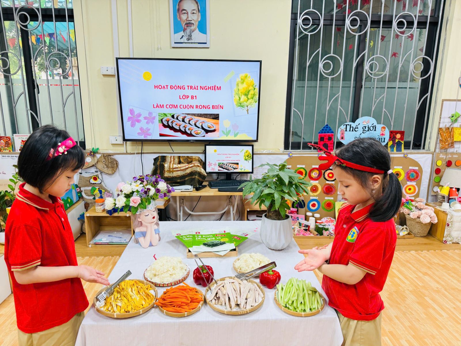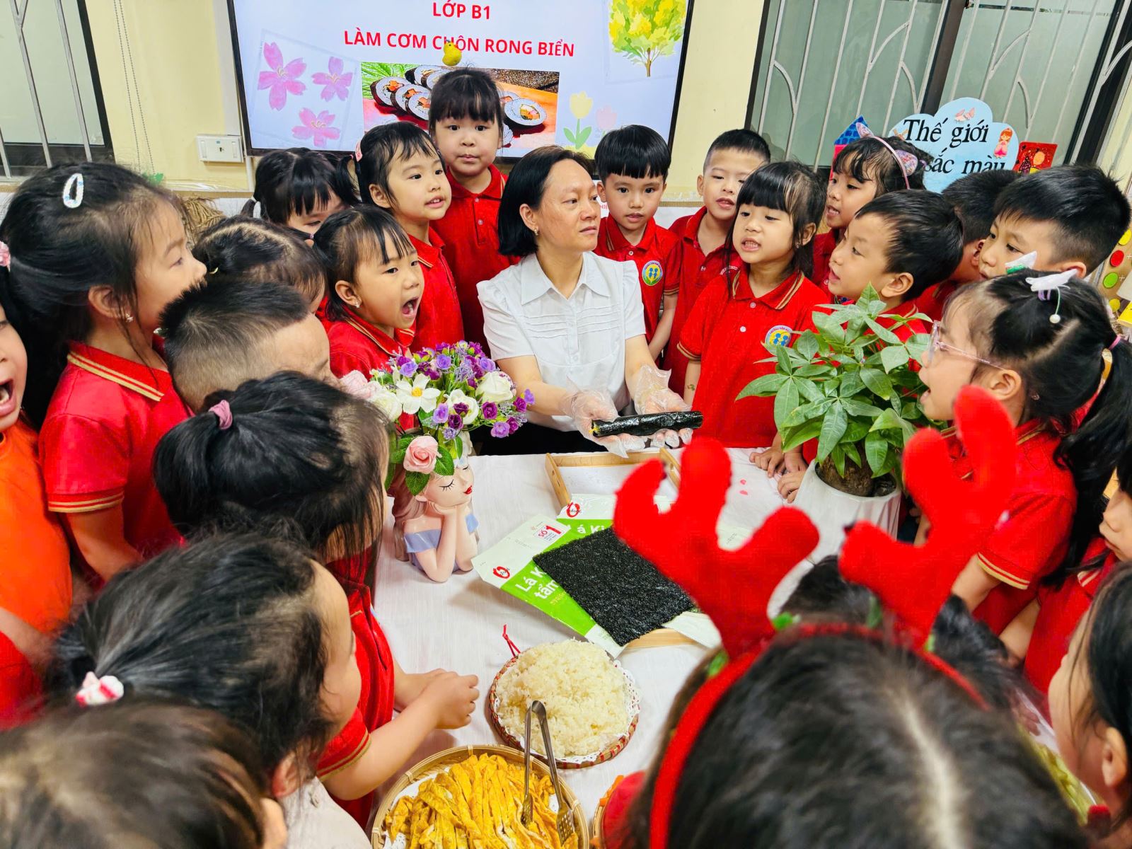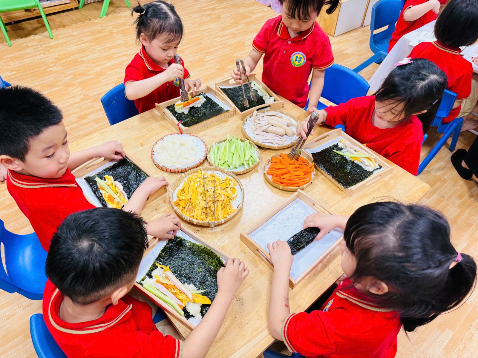 Trong không khí hào hứng và đầy thích thú, các bé được cô giáo giới thiệu về nguyên liệu như cơm trắng, rong biển, xúc xích, cà rốt, dưa chuột… Qua đó, trẻ không chỉ nhận biết thêm nhiều loại thực phẩm quen thuộc mà còn hiểu hơn về giá trị dinh dưỡng của từng món ăn...