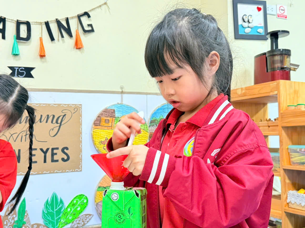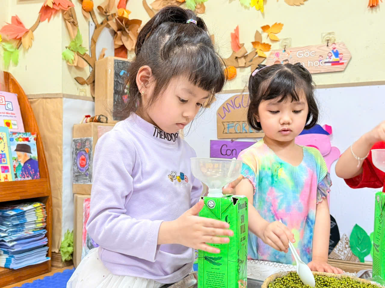 Từ những vỏ hộp sữa tưởng chừng bỏ đi, dưới đôi bàn tay nhỏ xinh và sự hướng dẫn của cô giáo, các bạn nhỏ lớp B2 đã “biến hóa” thành những chiếc chậu trồng xinh xắn. Các bé được tự tay vo đỗ, ngâm nước, cho vào hộp và chăm sóc mỗi ngày. Qua từng bước đơn giản, trẻ không chỉ hiểu được quá trình phát triển của cây mà còn học cách kiên nhẫn, quan sát và yêu quý thành quả lao động của mình.