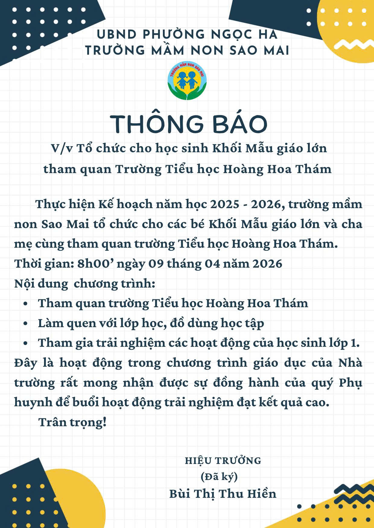 Trường Mầm non Sao Mai trân trọng kính gửi quý CMHS thông báo về việc tổ chức cho trẻ khối Mẫu giáo lớn tham quan trường TH Hoàng Hoa Thám